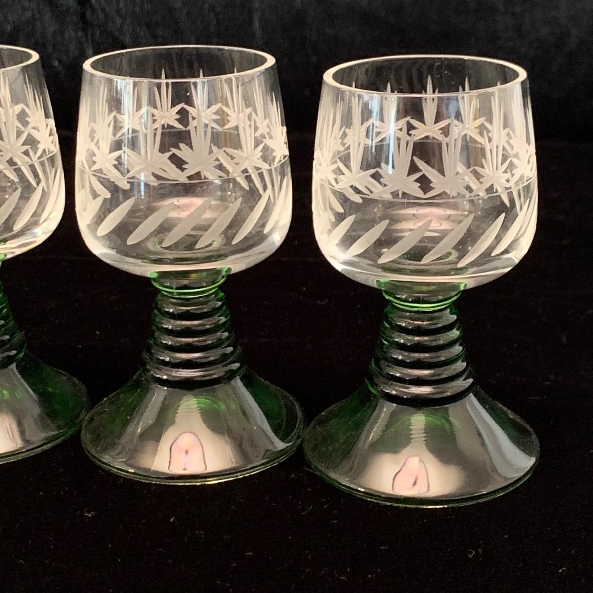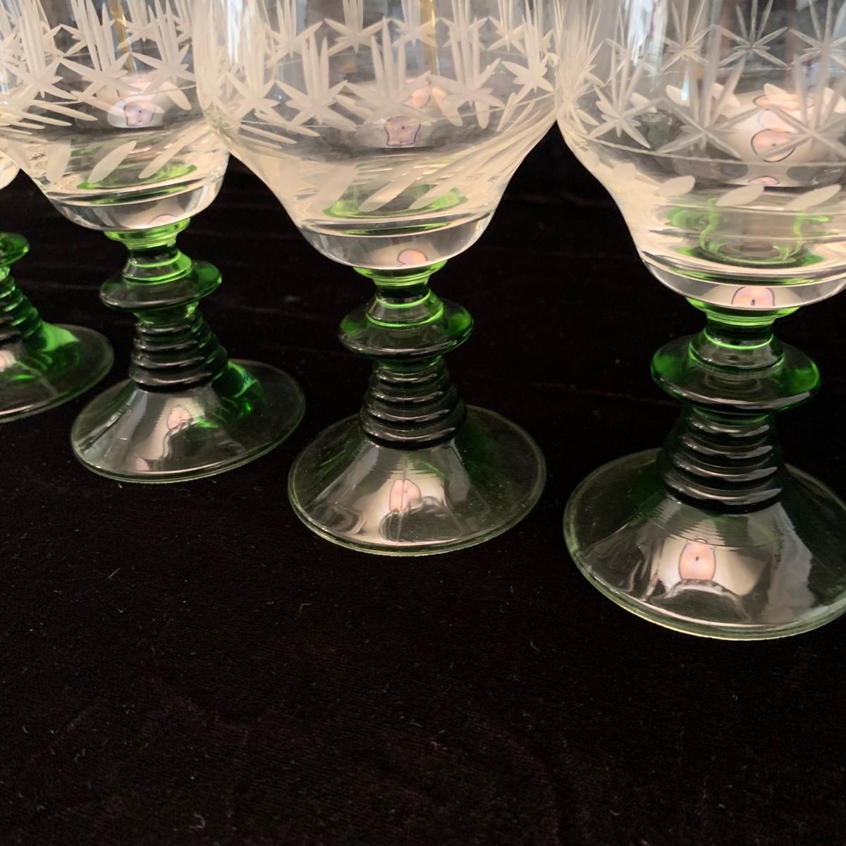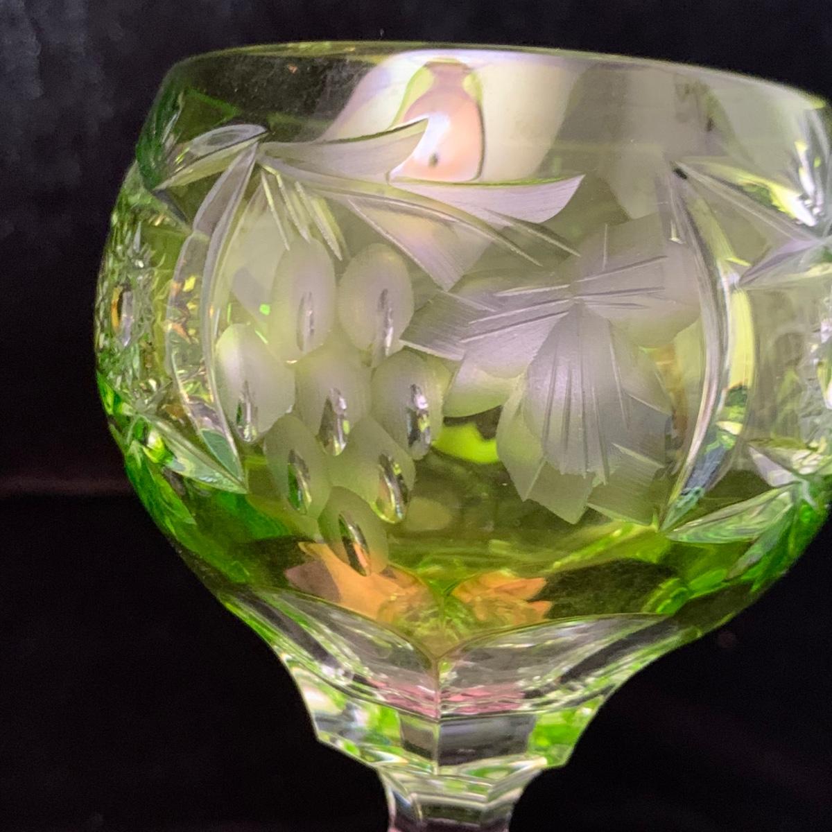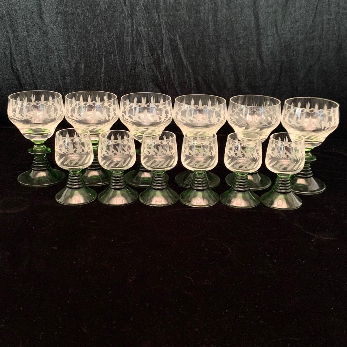 Three sets of small colorful etched glass stemware. The set of four glasses with rose colored beehive bases feature an etched grapevine design and are 6”H. The other set of four glasses has two 7”H glasses and two 4.5”H glasses, one of each size is lime green and one of each size is amber. These also have a grape design and they appear to be crystal. There is a cleanable substance on the bases of this set. The other set with the green beehive bases has 12 glasses, six that are 3.5”H and six that are 5”H.