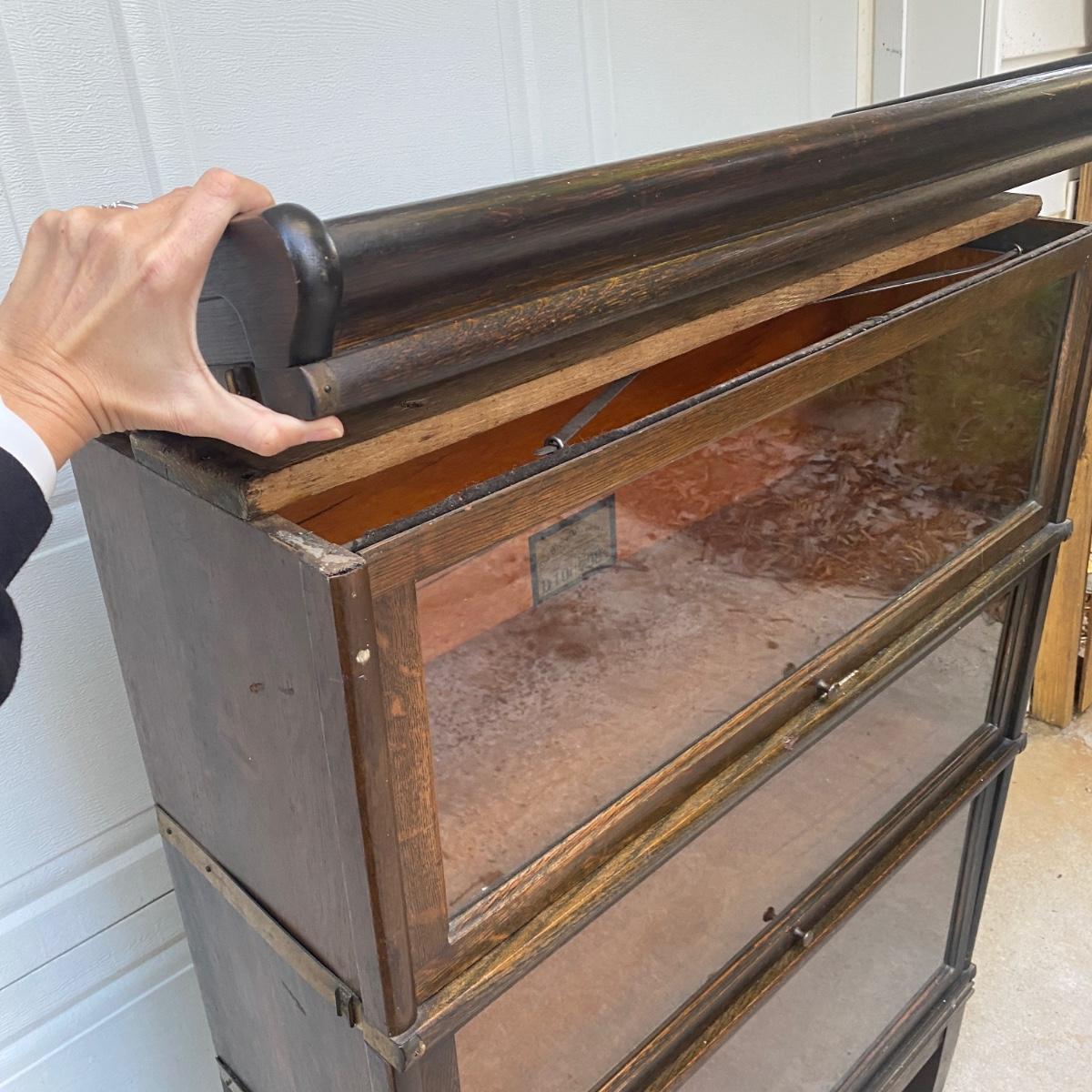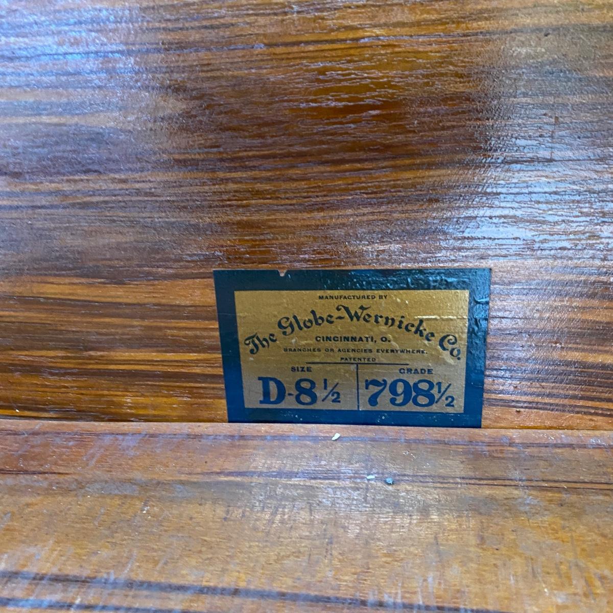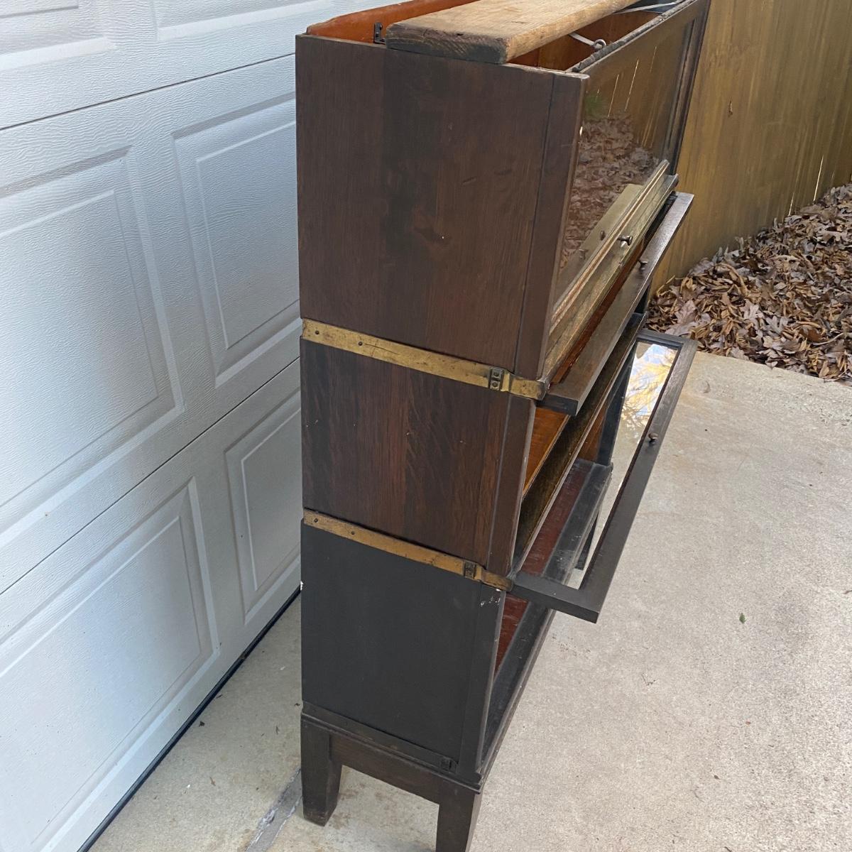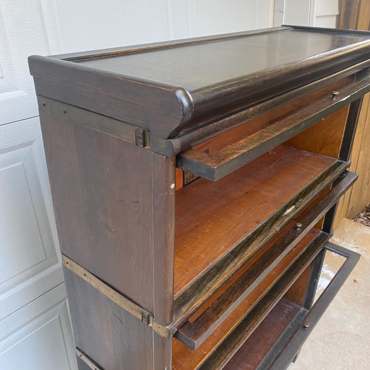 This lawyers bookcase is a made by Globe Wernicke Co. it has five pieces total. One base, three bookshelves and a top. It can be used with all or only one shelf depending on the size you want. All glass doors open easily. The three shelves are different sizes and one is a slightly darker color. All measure 34”w x 11”d but are different heights of 15”h (darkest brown color), 11” and 13” height for the other two shelves. The total unit measures 34”w x 12”d x 50.5”h with top and base also attached. Local pick up only.