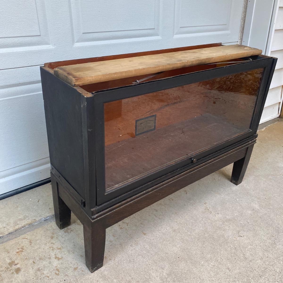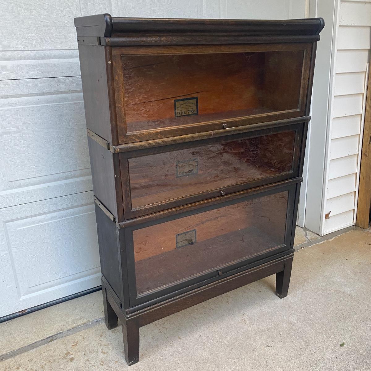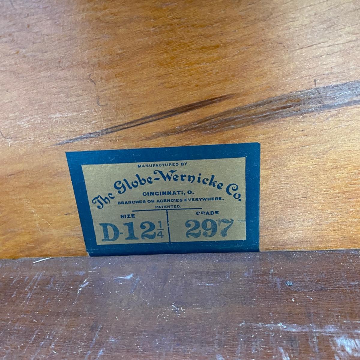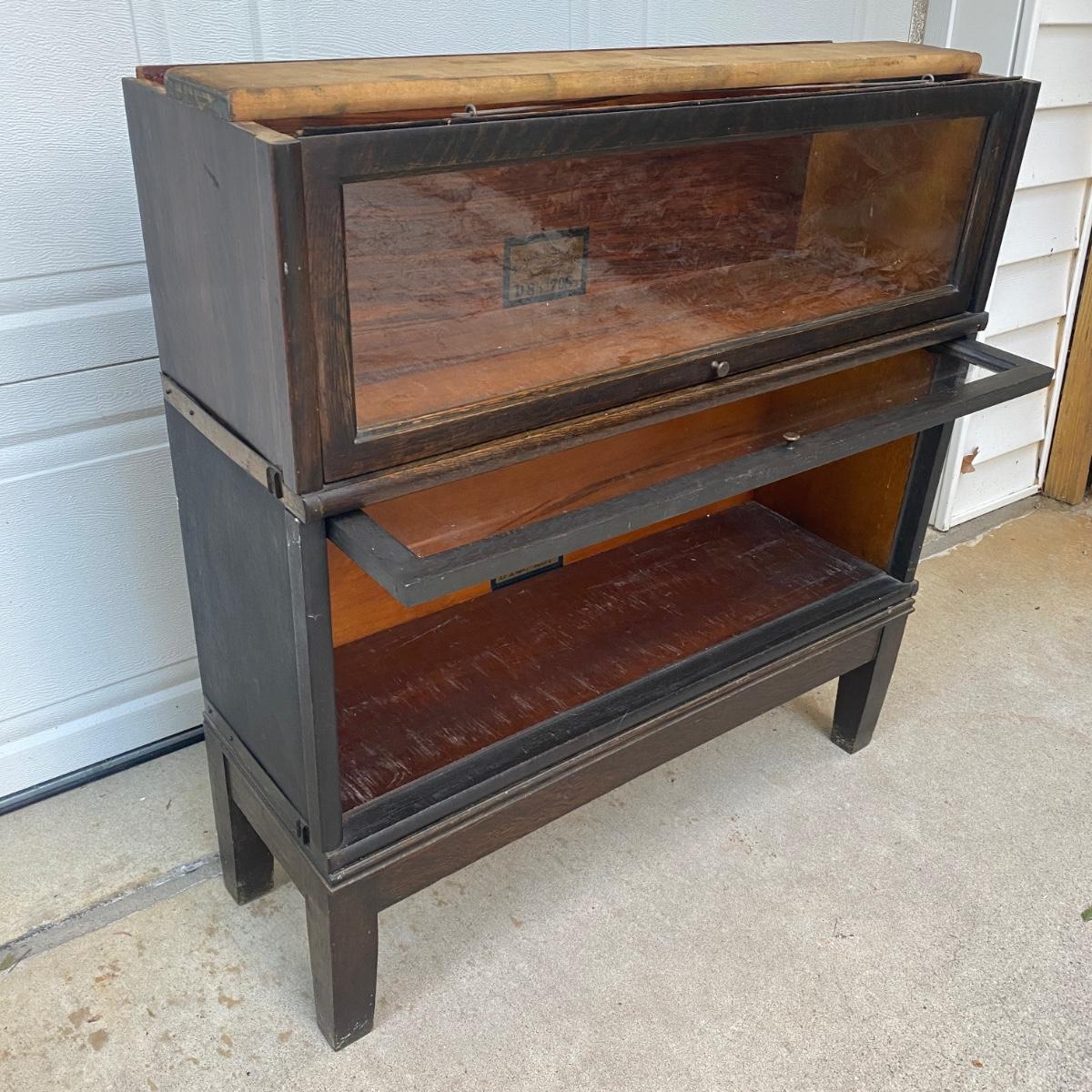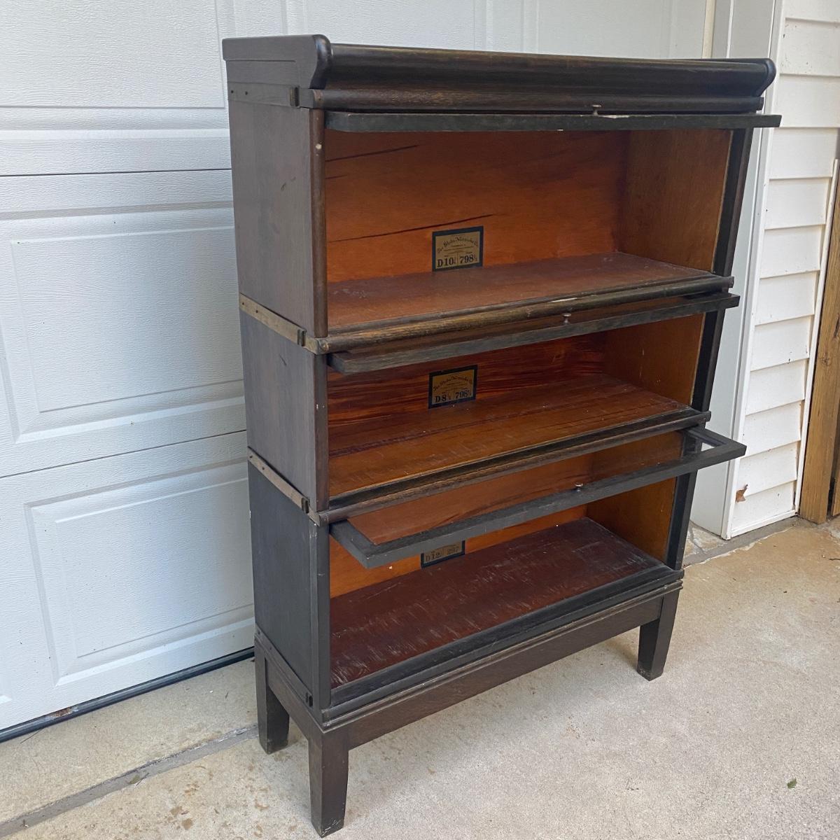 This lawyers bookcase is a made by Globe Wernicke Co. it has five pieces total. One base, three bookshelves and a top. It can be used with all or only one shelf depending on the size you want. All glass doors open easily. The three shelves are different sizes and one is a slightly darker color. All measure 34”w x 11”d but are different heights of 15”h (darkest brown color), 11” and 13” height for the other two shelves. The total unit measures 34”w x 12”d x 50.5”h with top and base also attached. Local pick up only.