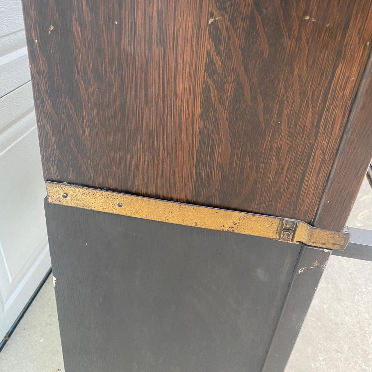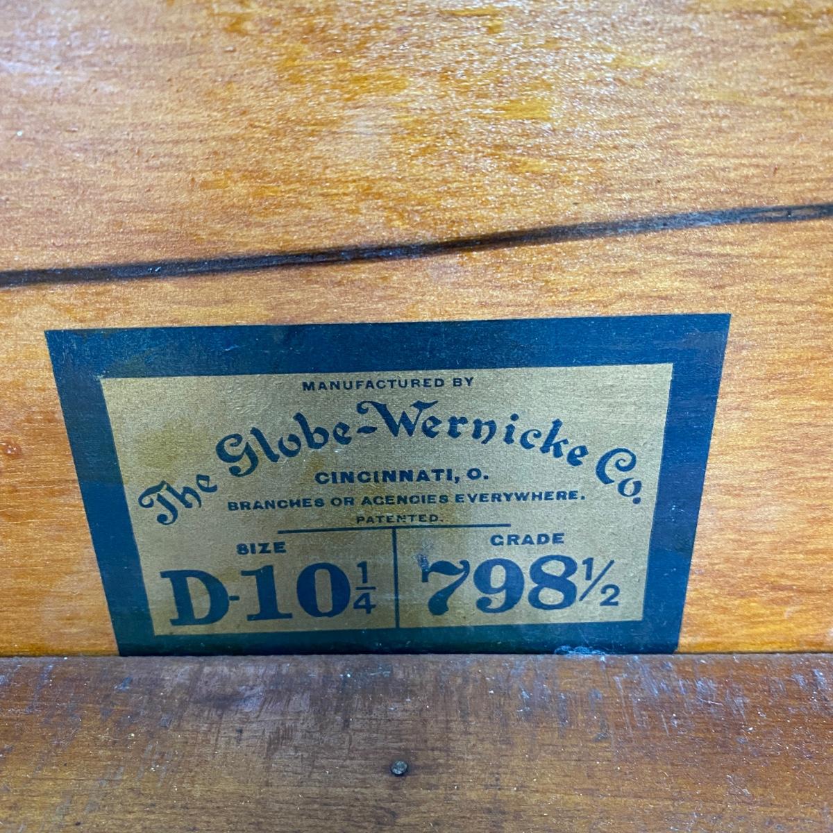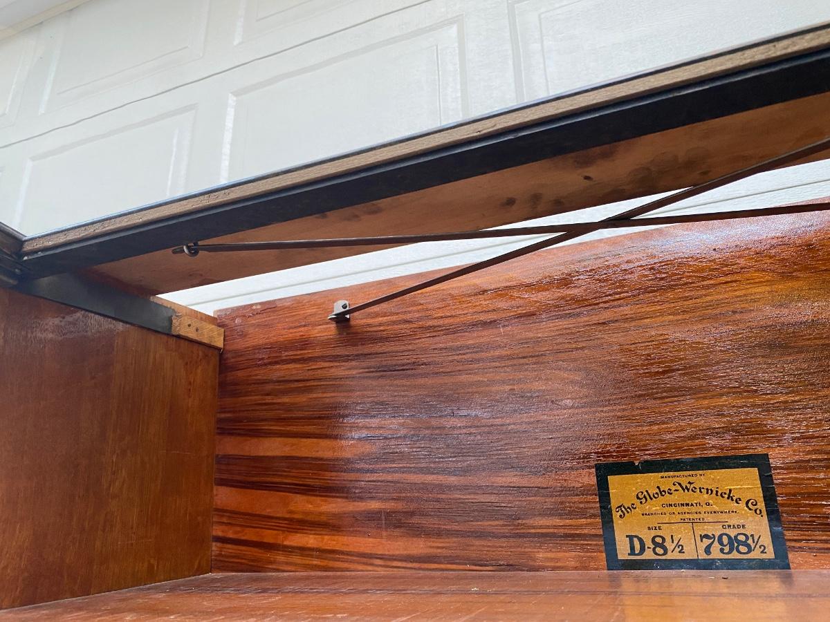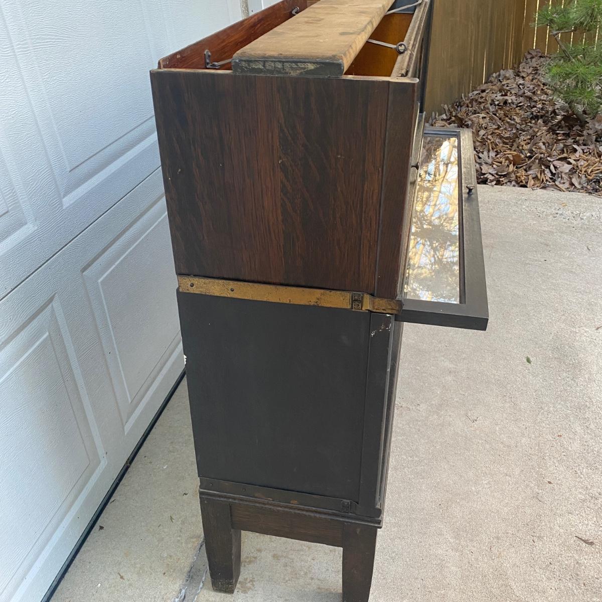 This lawyers bookcase is a made by Globe Wernicke Co. it has five pieces total. One base, three bookshelves and a top. It can be used with all or only one shelf depending on the size you want. All glass doors open easily. The three shelves are different sizes and one is a slightly darker color. All measure 34”w x 11”d but are different heights of 15”h (darkest brown color), 11” and 13” height for the other two shelves. The total unit measures 34”w x 12”d x 50.5”h with top and base also attached. Local pick up only.