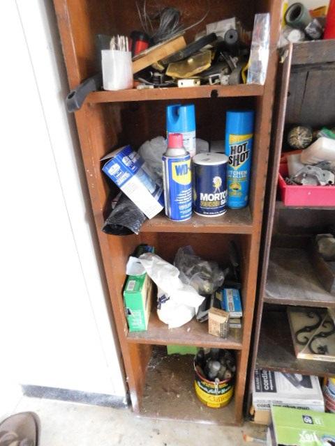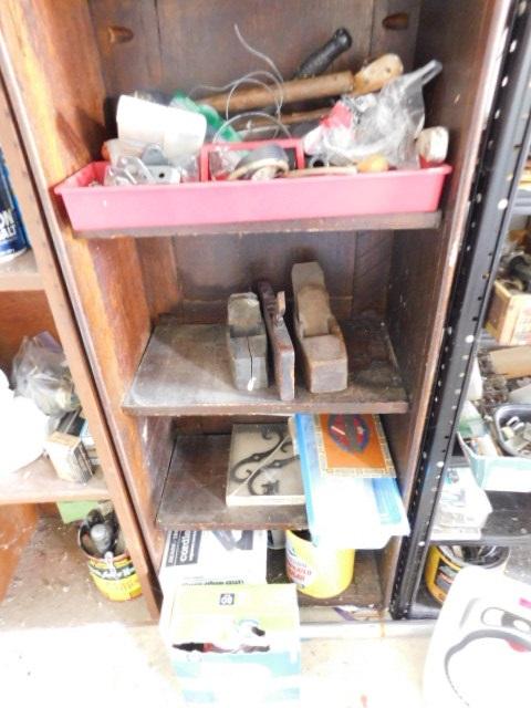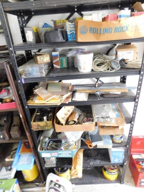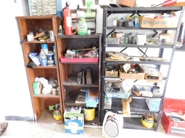 Three Shelves and All Contents of Tools and Hardware (Tool Box Not Included nor the blue pigeon hole box on top of wood self )