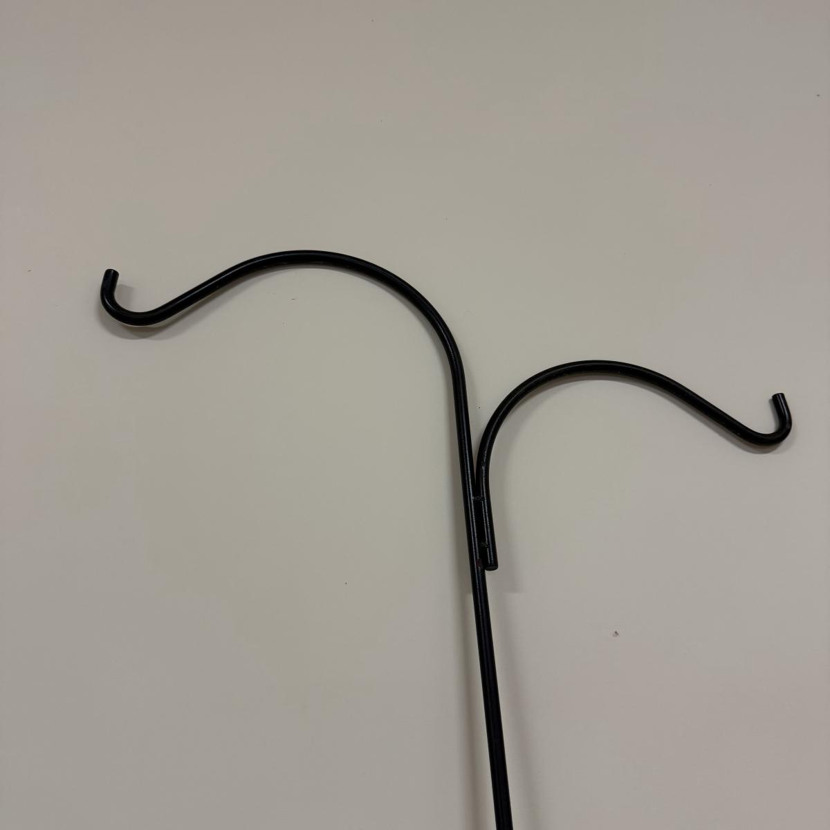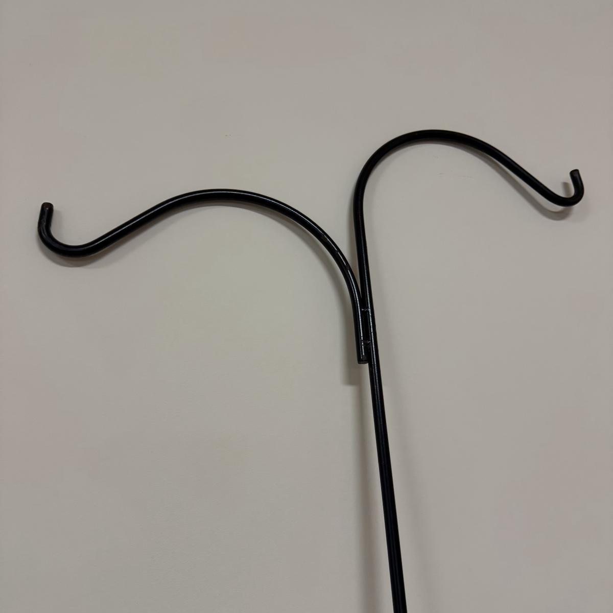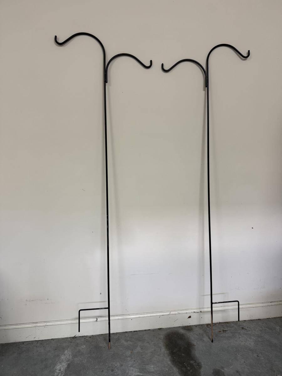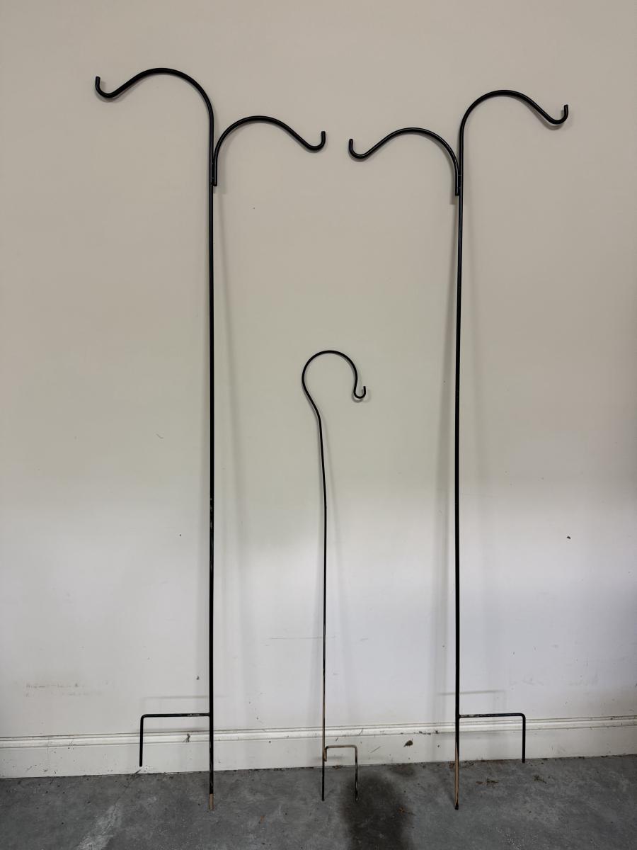 Three iron Shepherds hooks for hanging plants and birdfeeders in the yard. The two double-hook ones are 84”H. They have some tan paint on the bottom.