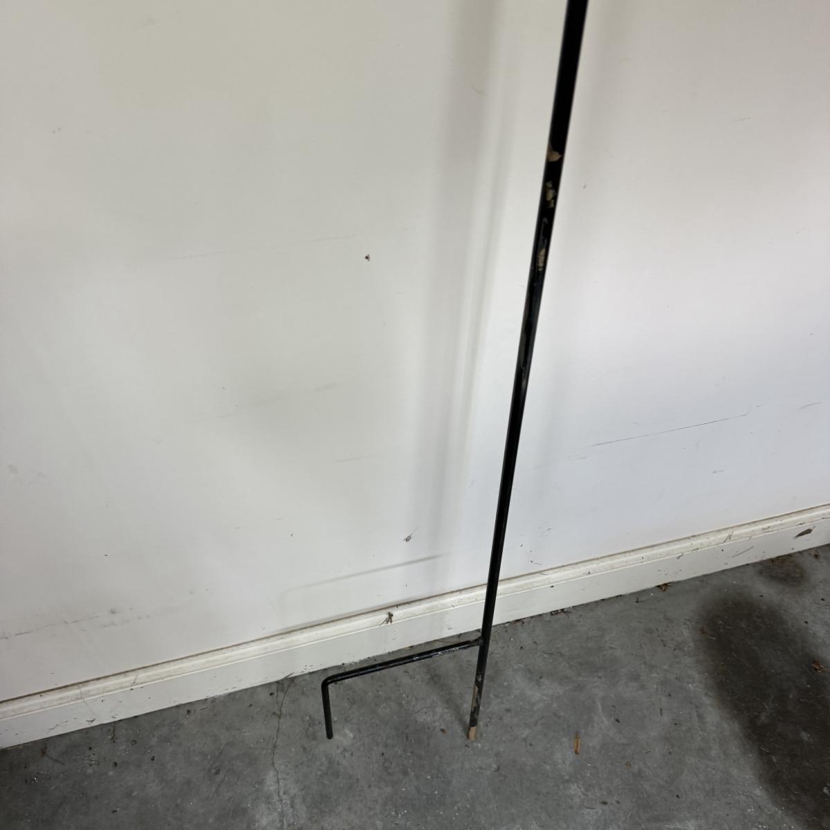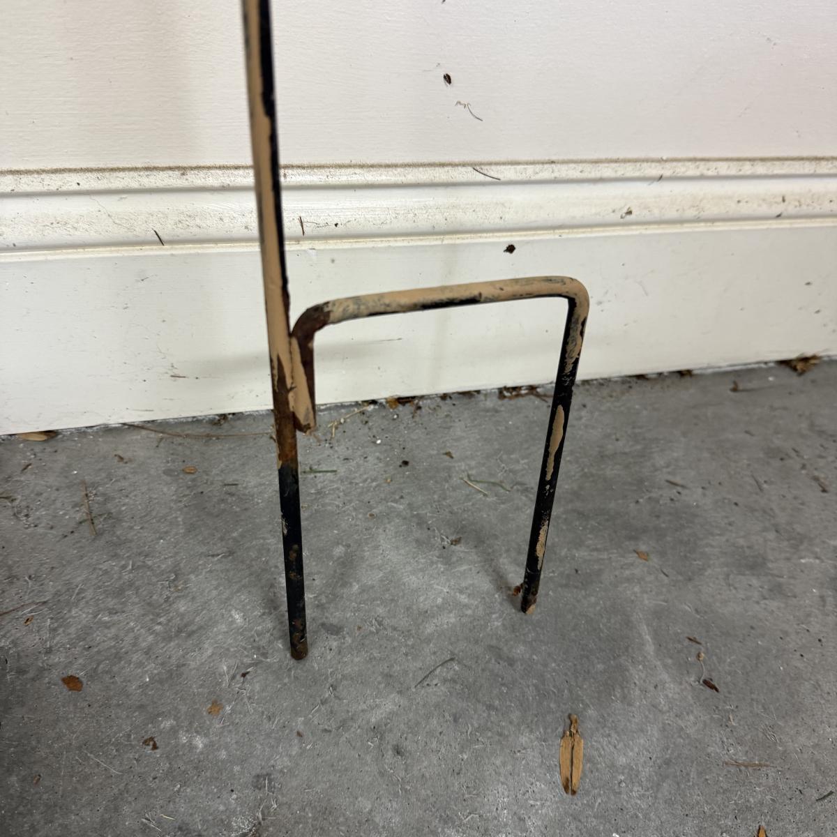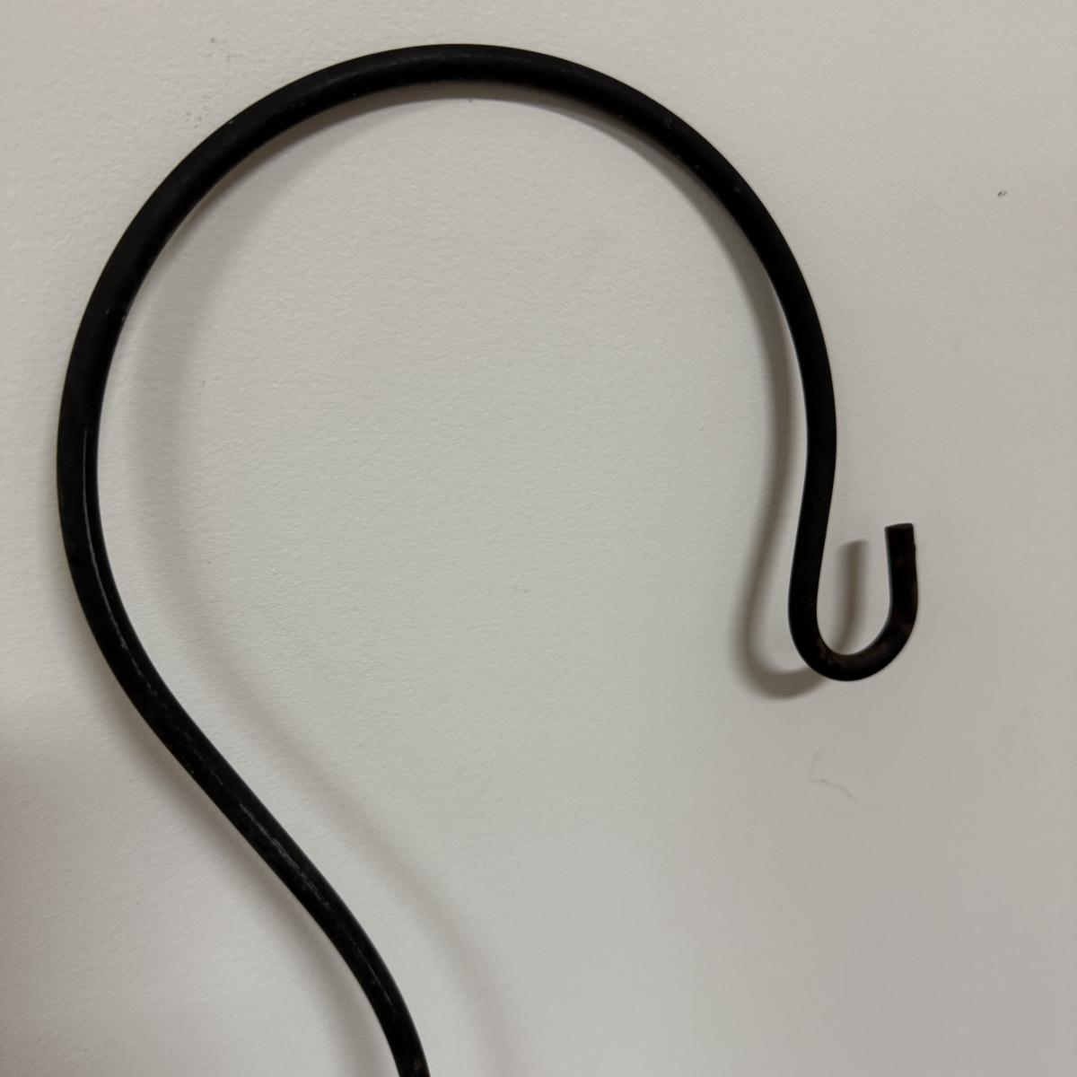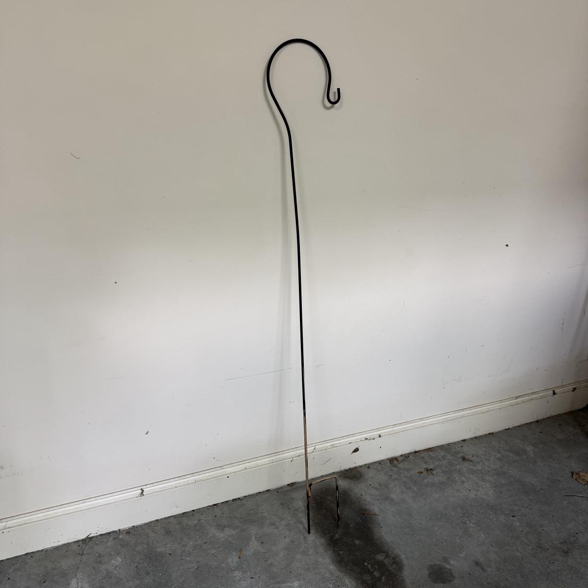 Three iron Shepherds hooks for hanging plants and birdfeeders in the yard. The two double-hook ones are 84”H. They have some tan paint on the bottom.