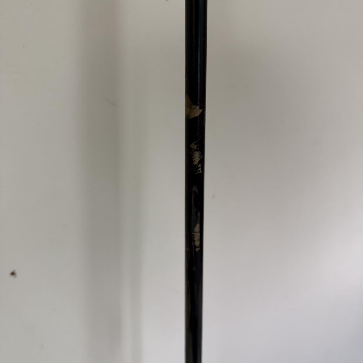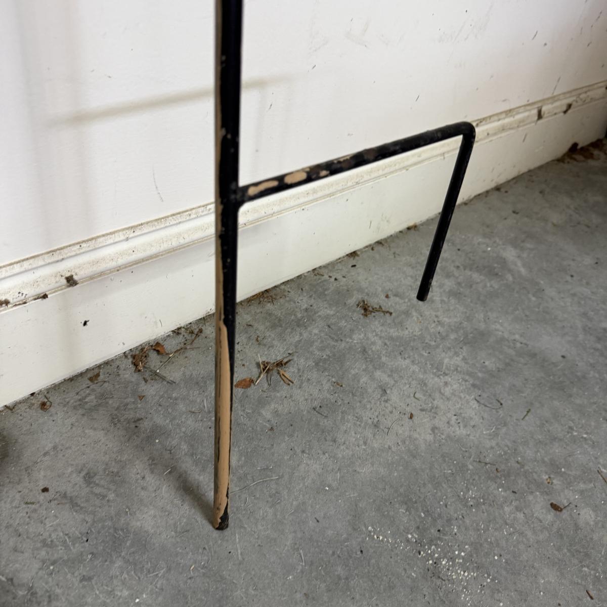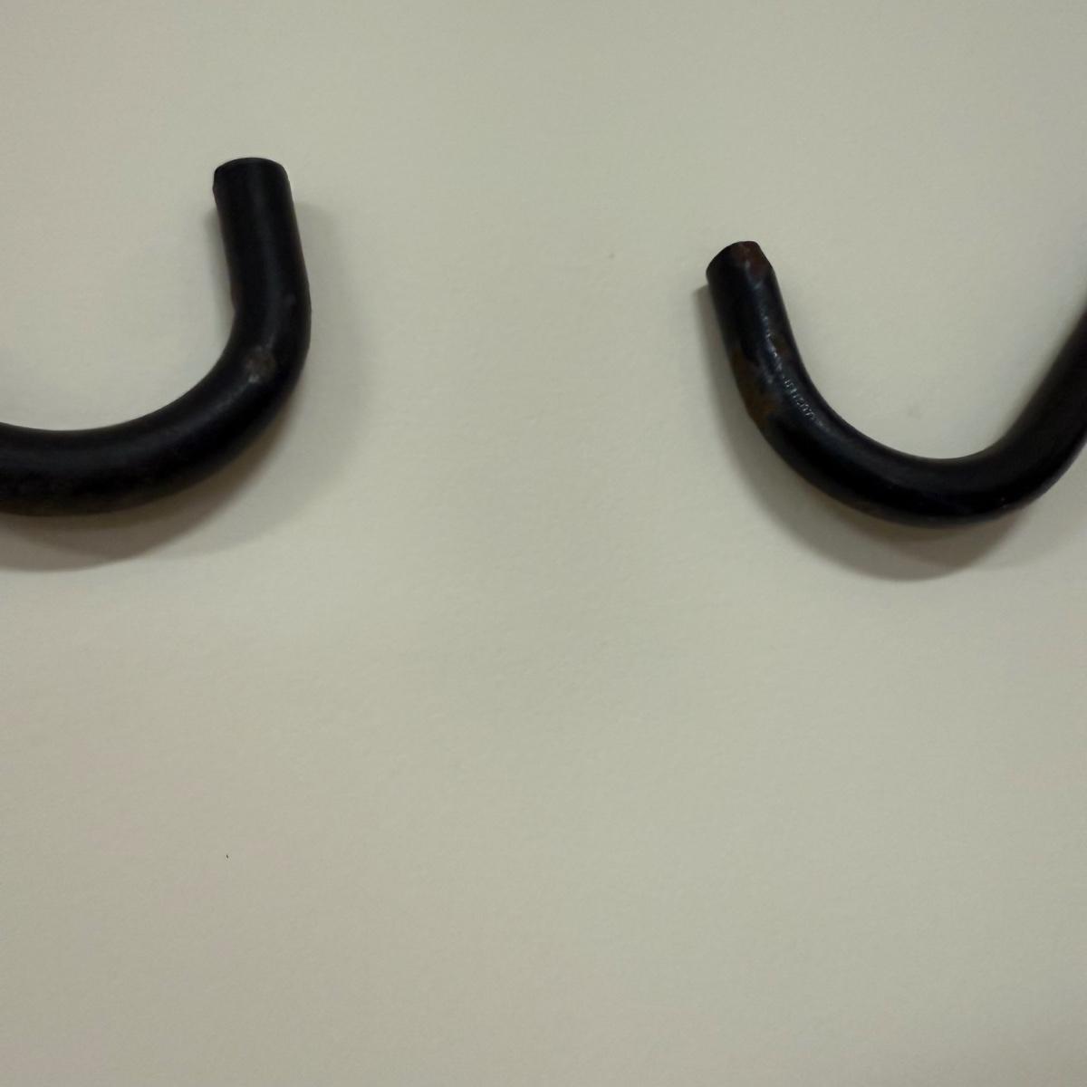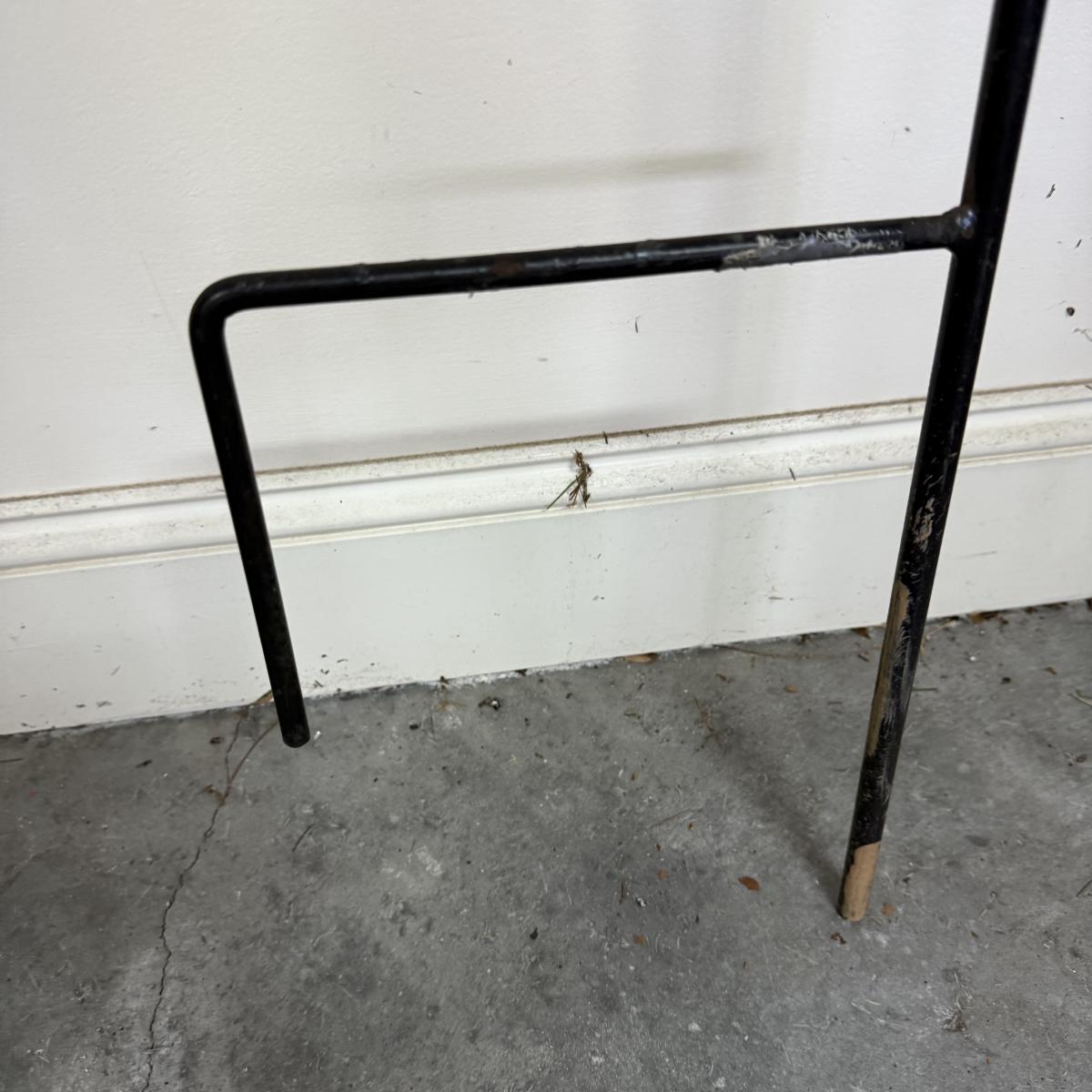 Three iron Shepherds hooks for hanging plants and birdfeeders in the yard. The two double-hook ones are 84”H. They have some tan paint on the bottom.