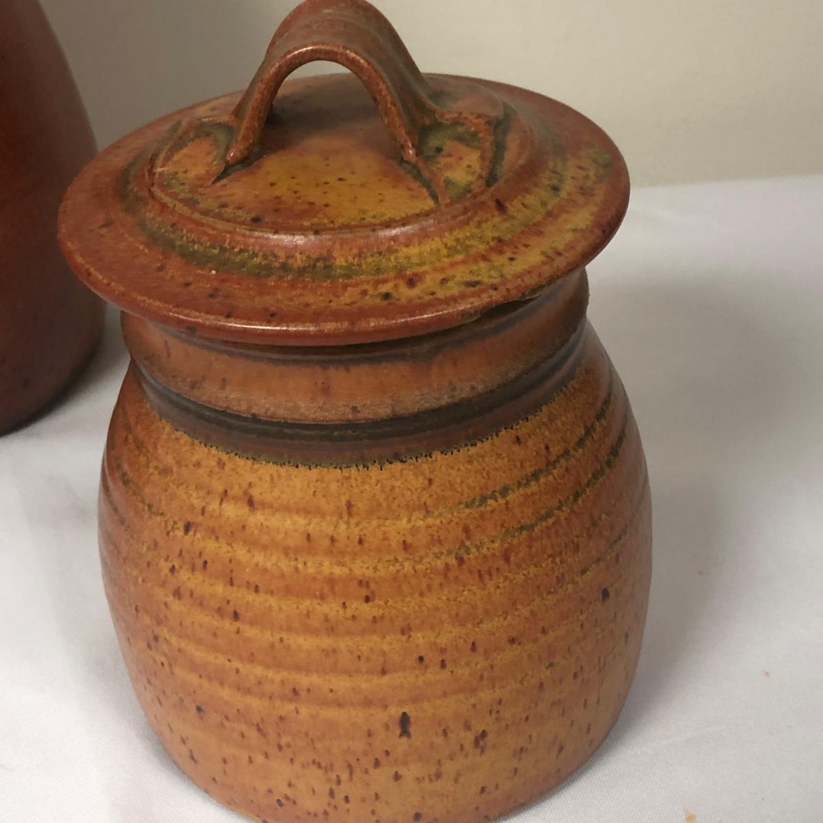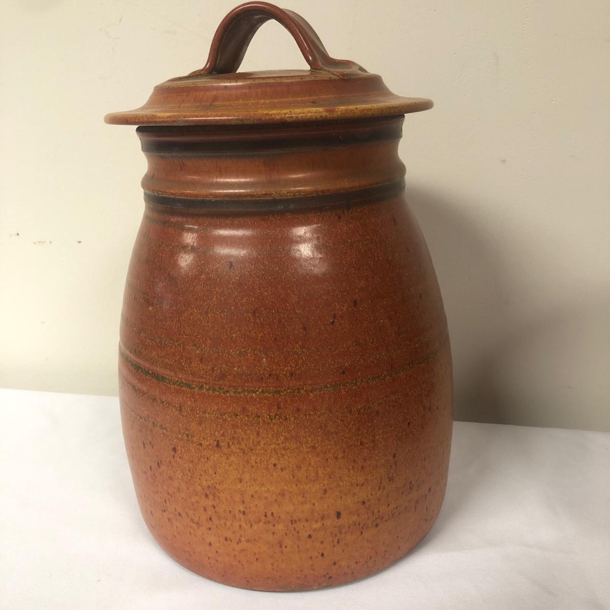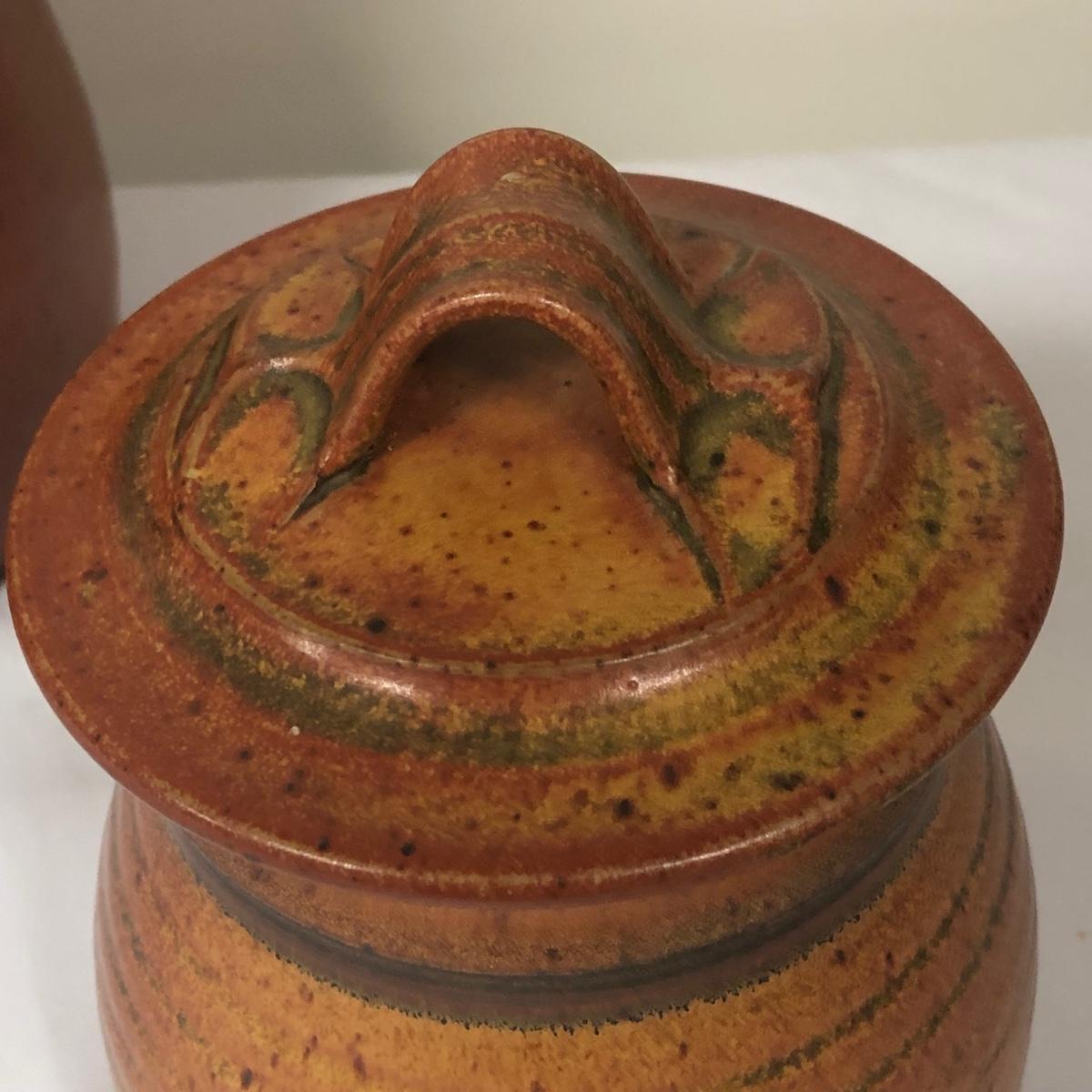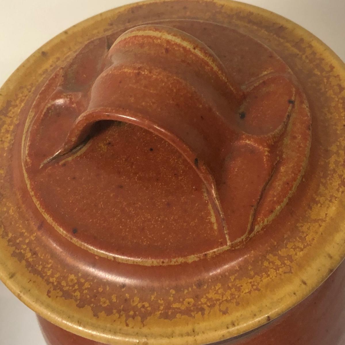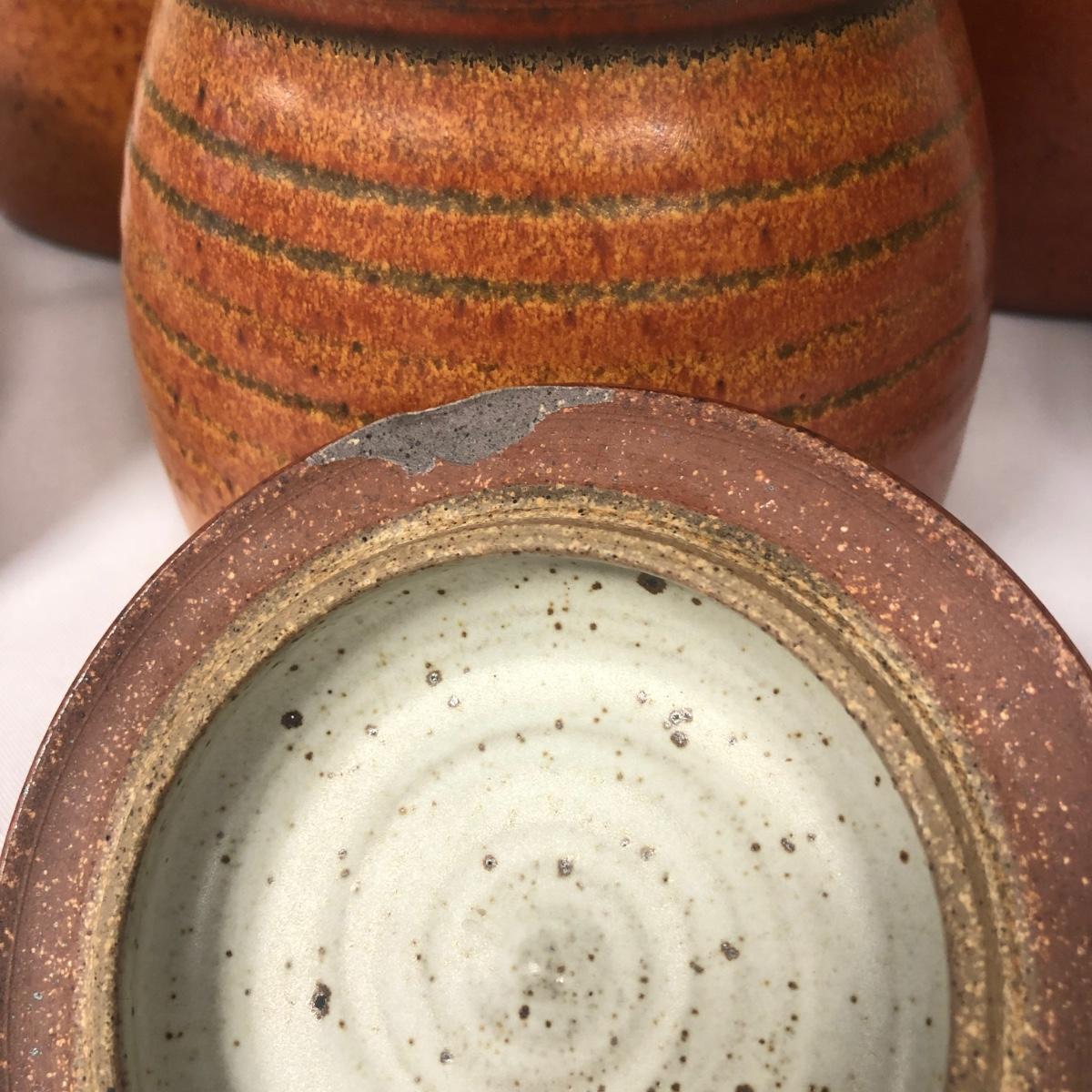 These three ceramic canisters are in good condition. All have lids and are signed on the bottom. Note there is one lid that has a chip on the underside edge (see photo). The largest canister measures 7” wide and 12.5” tall with the smallest measuring 5” wide and 8” tall. Shipping Available.