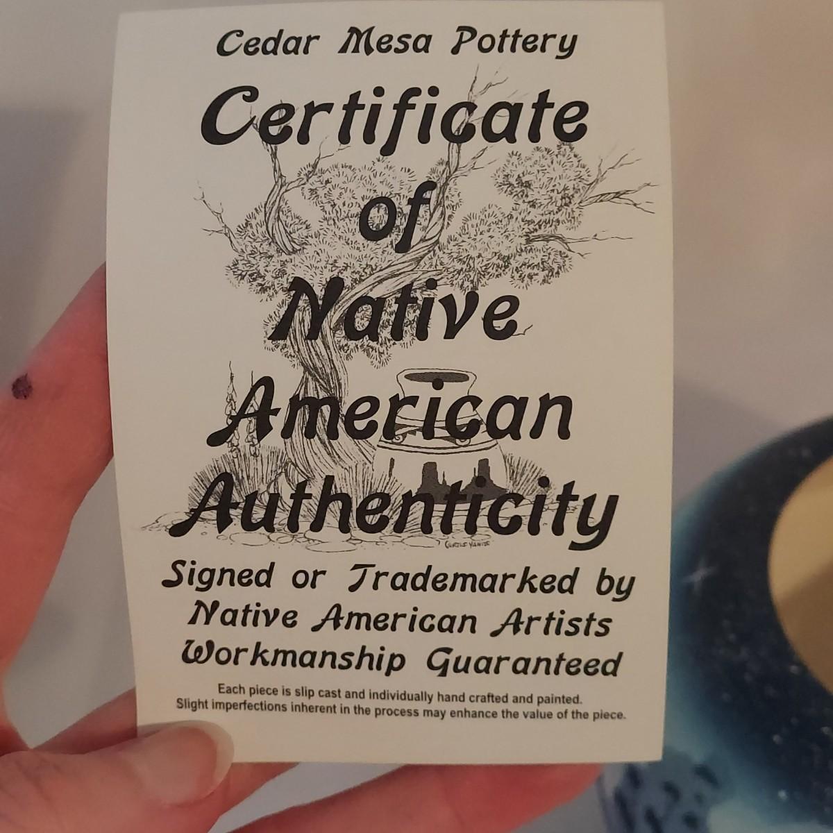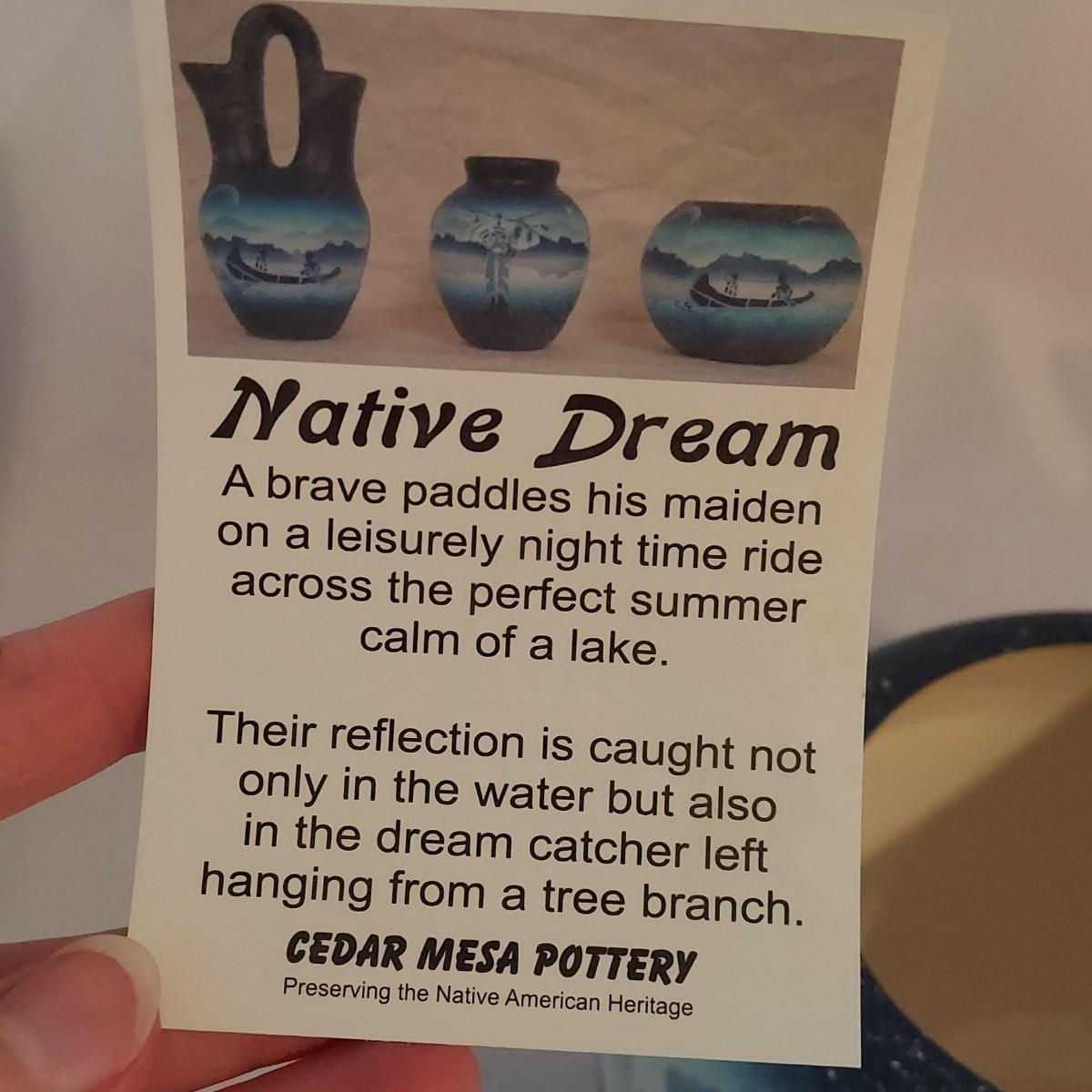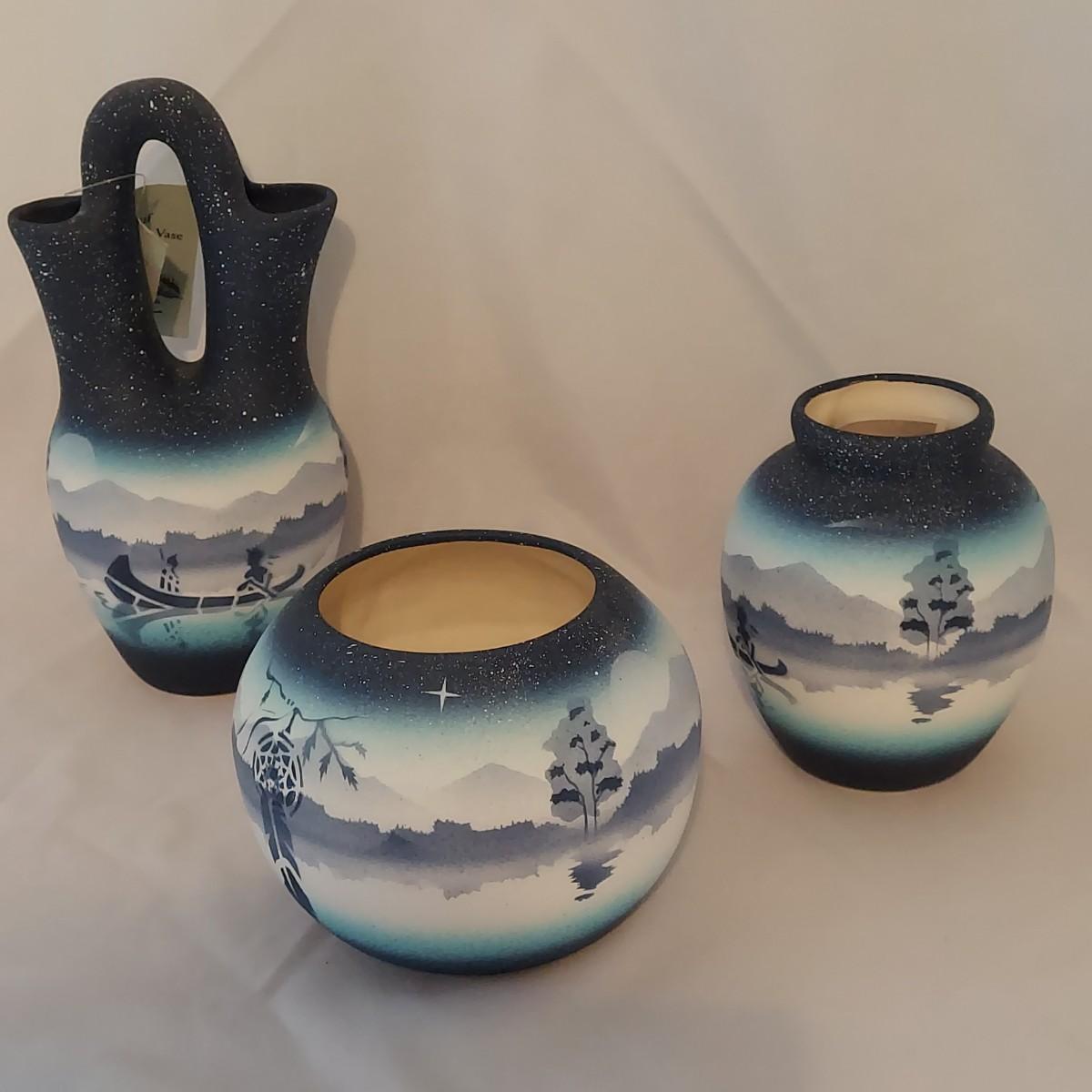 Three pieces of pottery named “Native Dream” by Cedar Mesa Pottery. They each have a signature on bottom and an info card inside. The medium vase measures approximately 6.5"D x 5"H. Please see photos for details. Shipping available