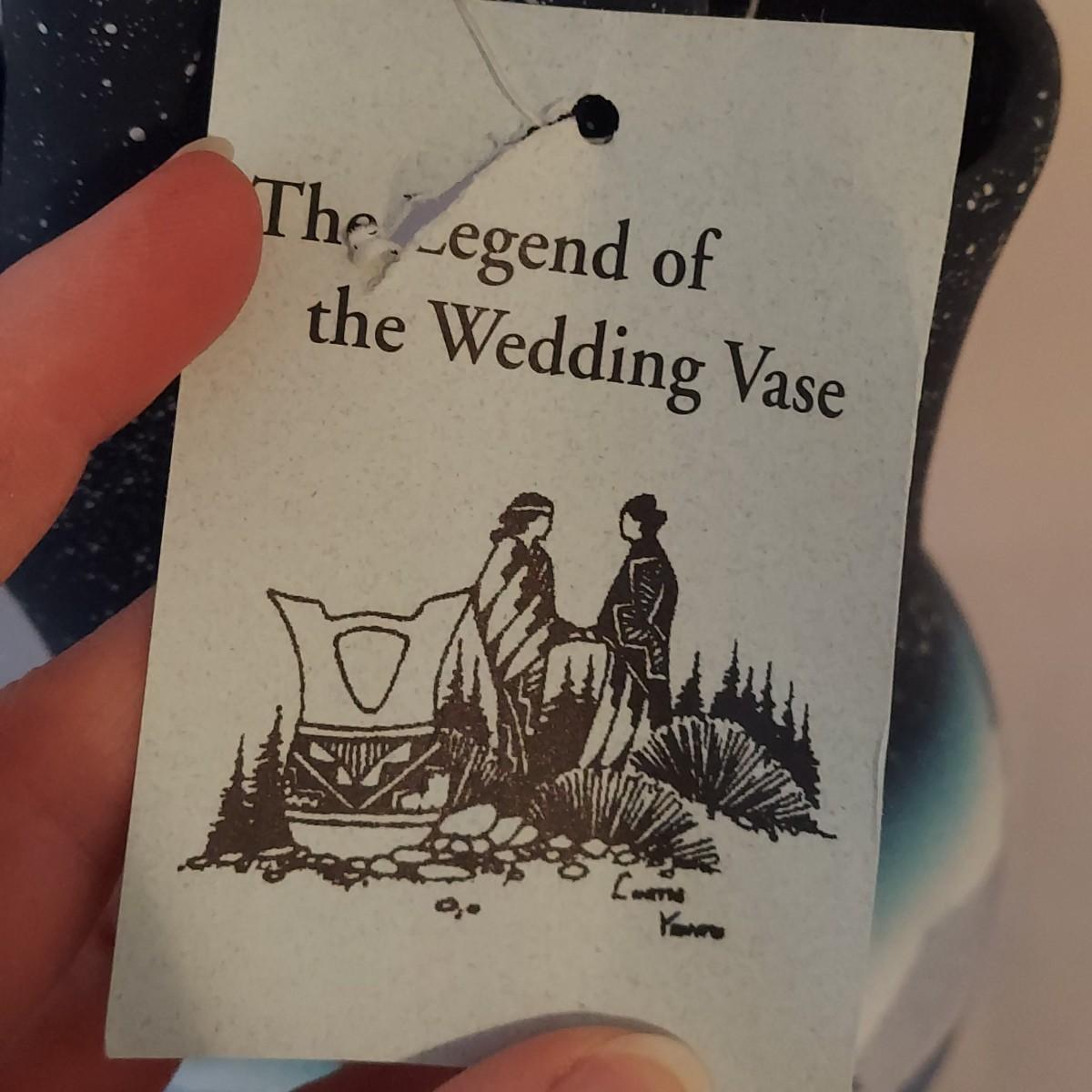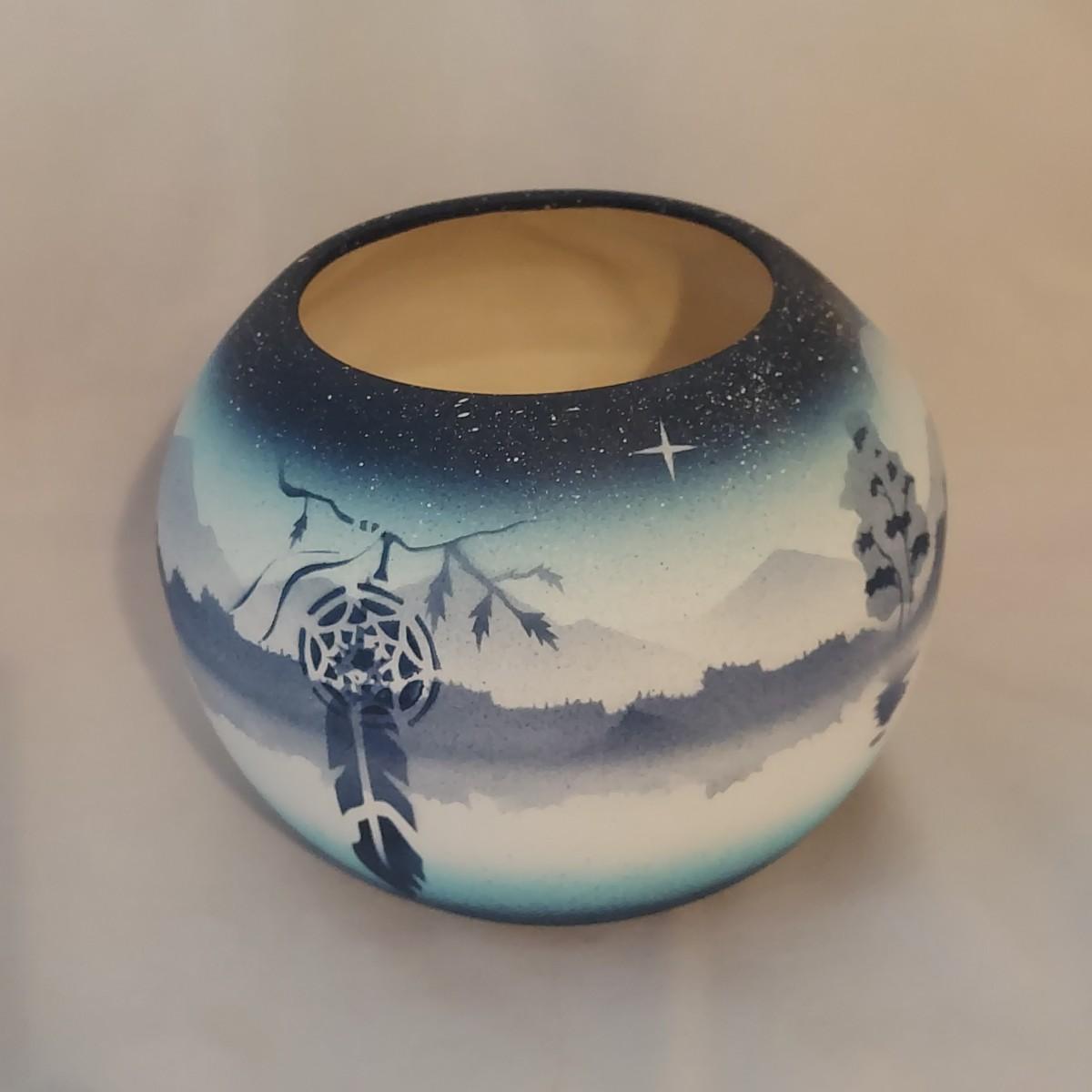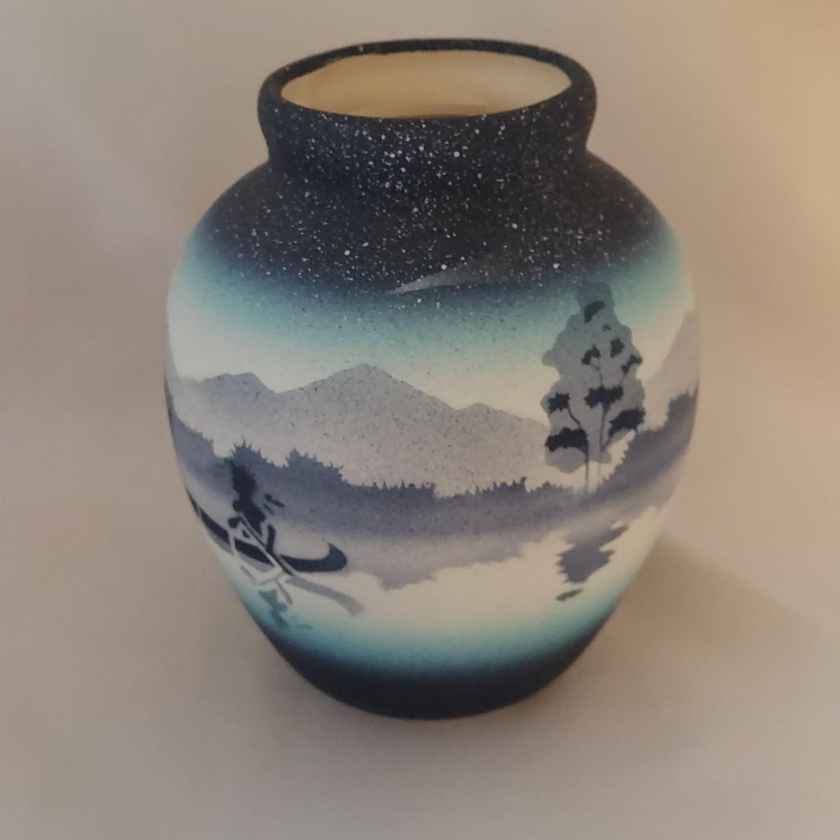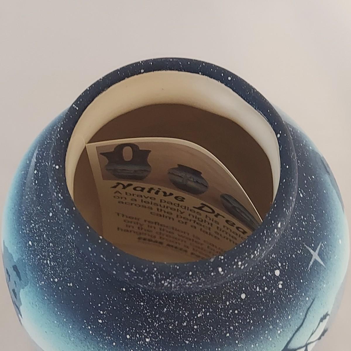 Three pieces of pottery named “Native Dream” by Cedar Mesa Pottery. They each have a signature on bottom and an info card inside. The medium vase measures approximately 6.5"D x 5"H. Please see photos for details. Shipping available