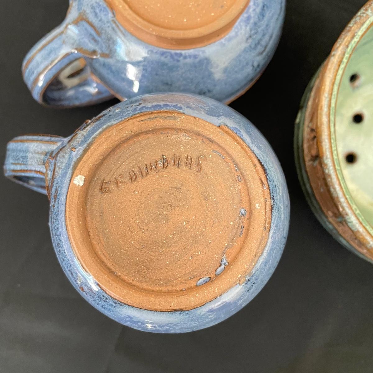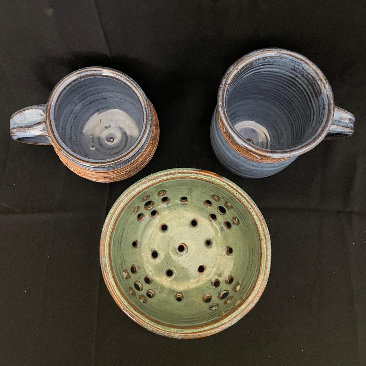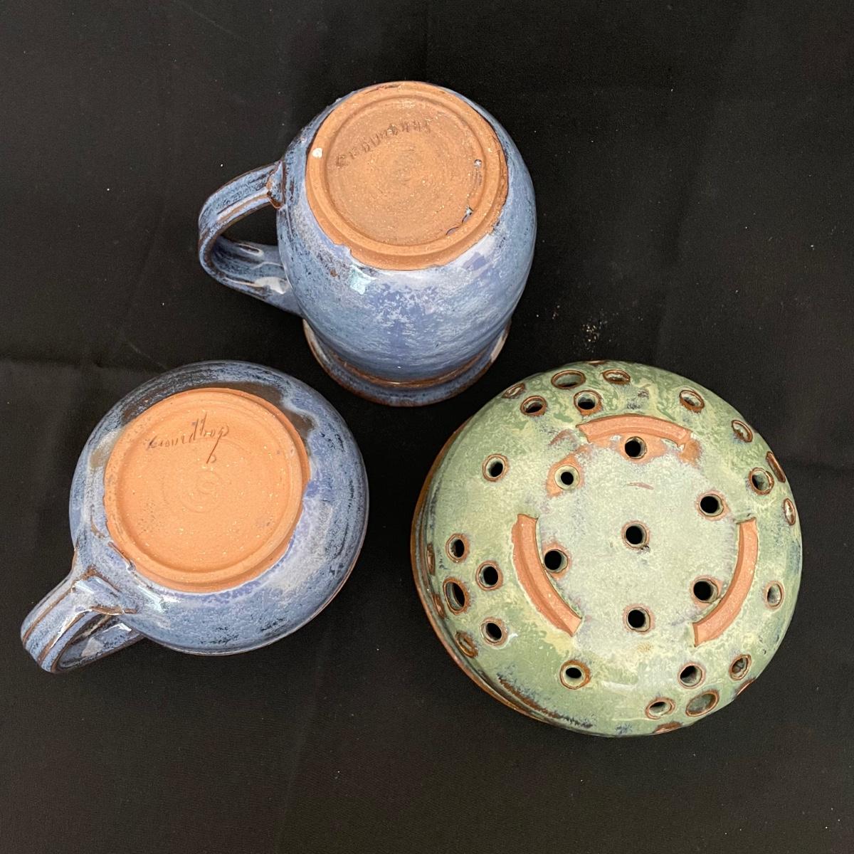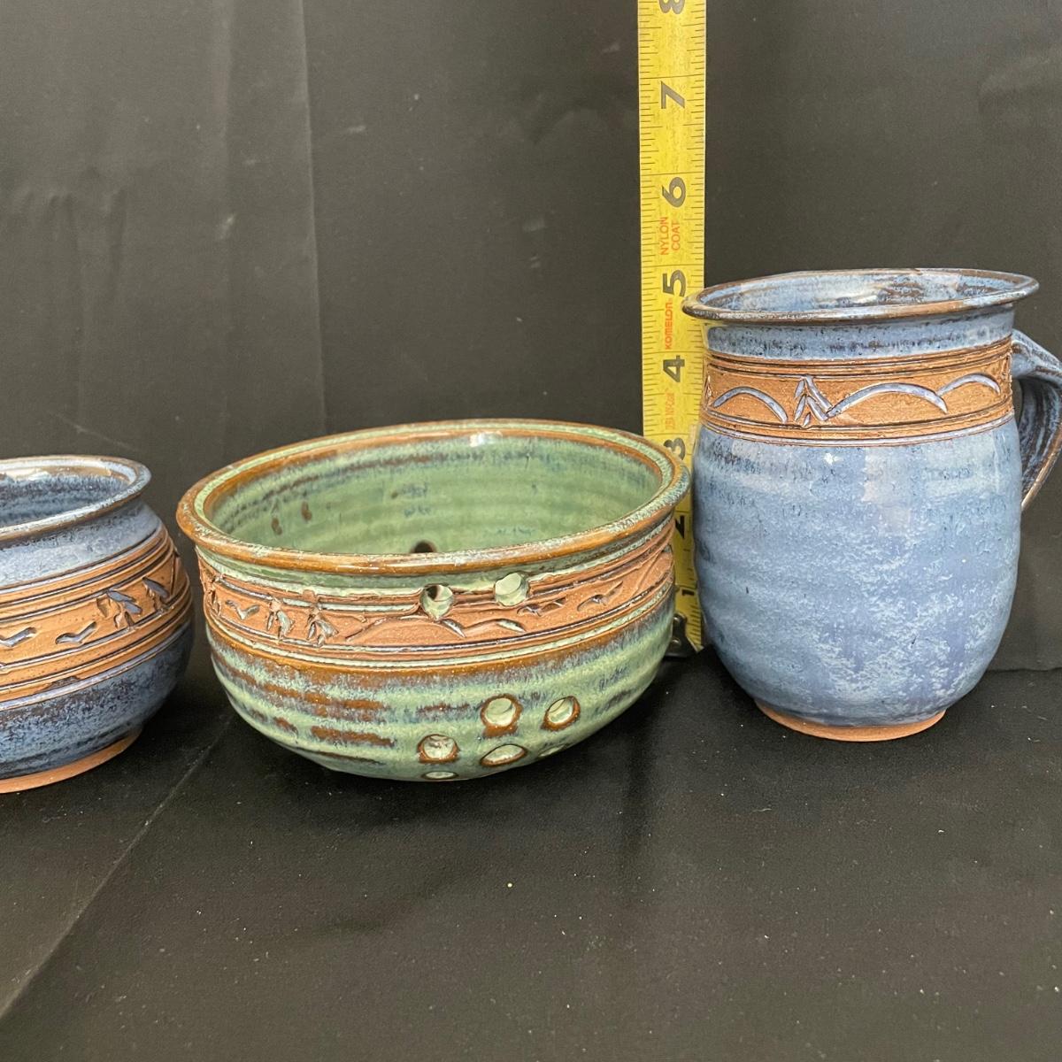 Two Groundhog signed blue mugs, one has a very small chip in the handle. The green berry bowl has lovely cutouts throughout, but no signature. All three have matching design bands. See images. Shipping available.