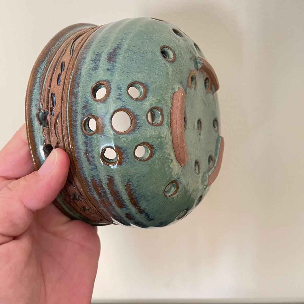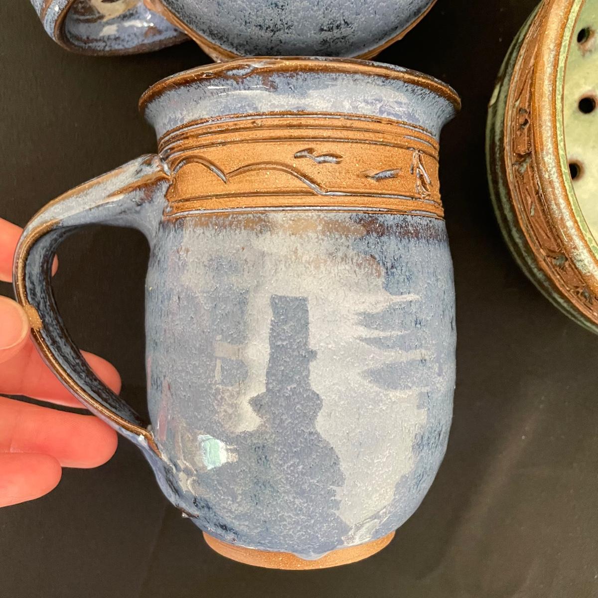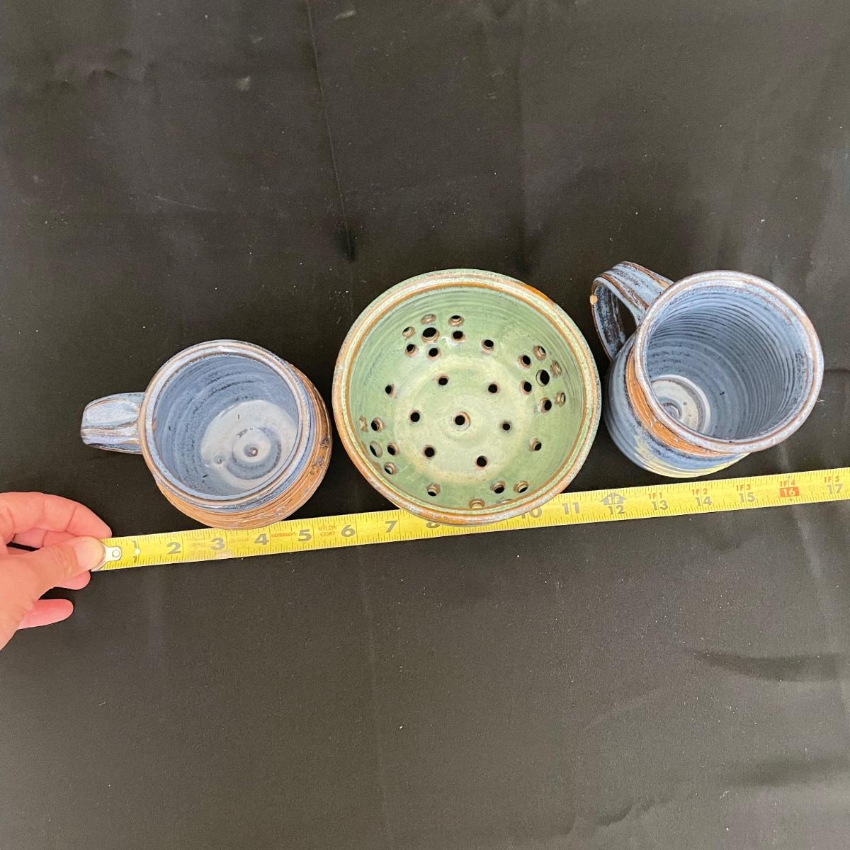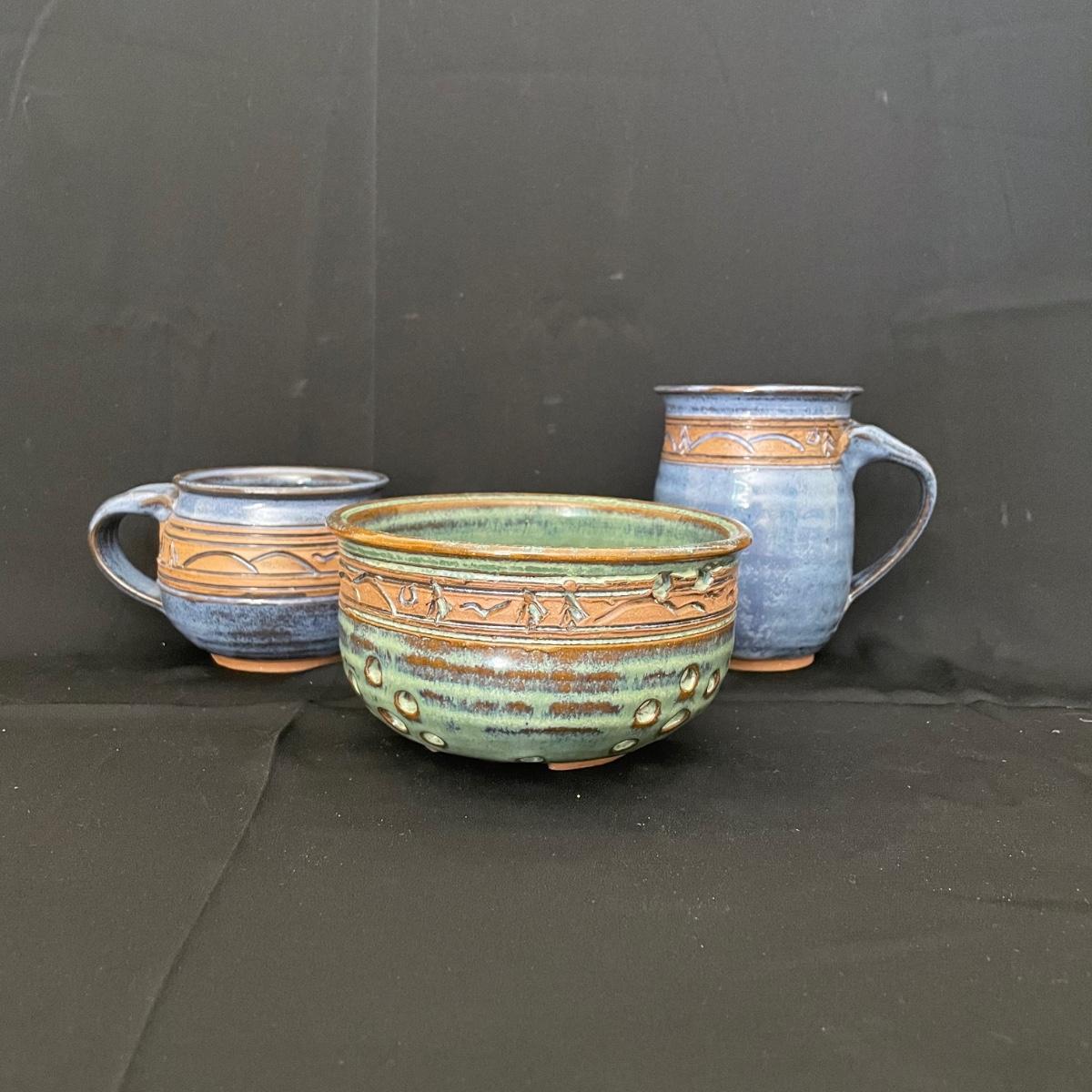 Two Groundhog signed blue mugs, one has a very small chip in the handle. The green berry bowl has lovely cutouts throughout, but no signature. All three have matching design bands. See images. Shipping available.