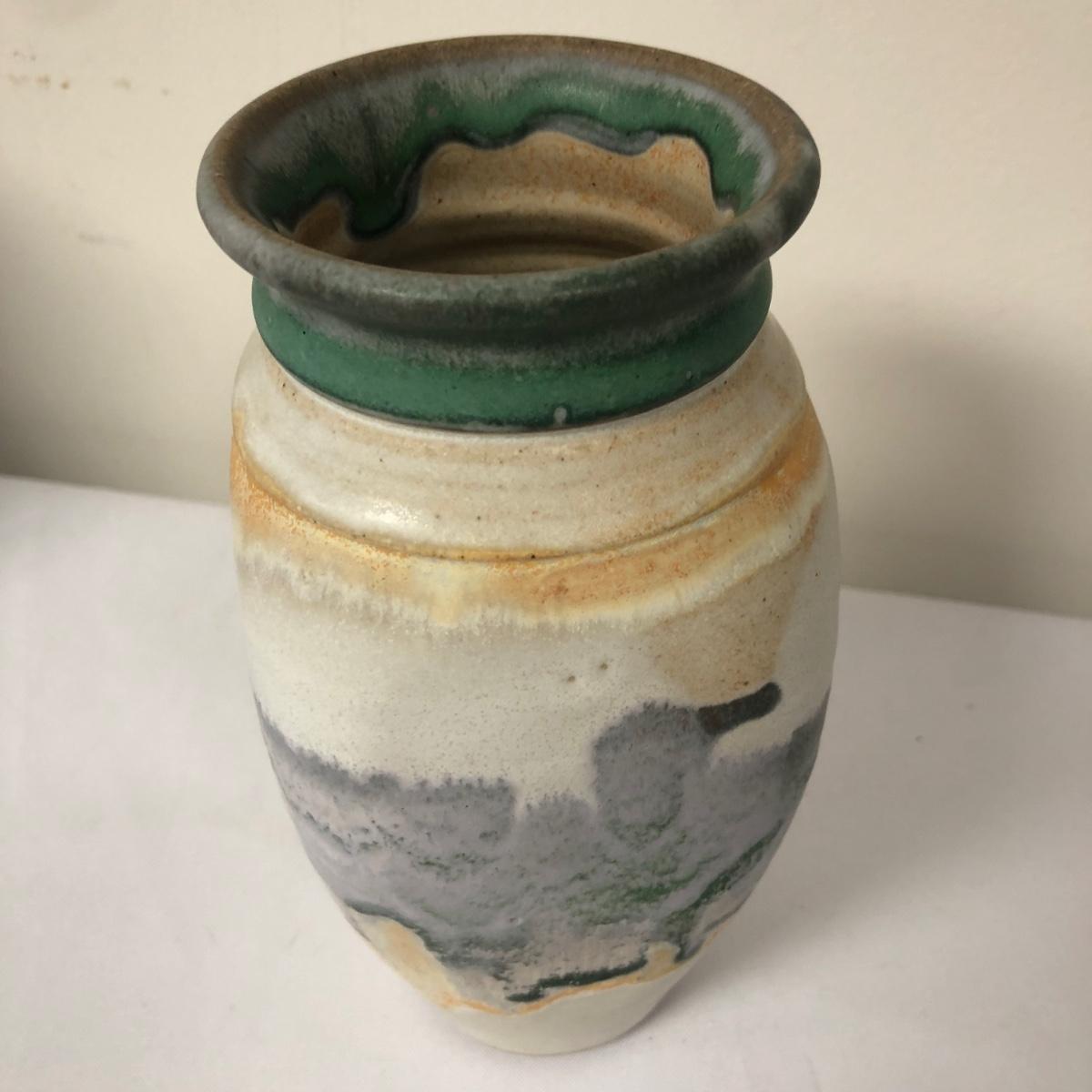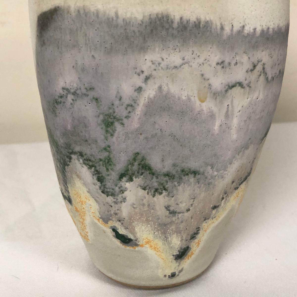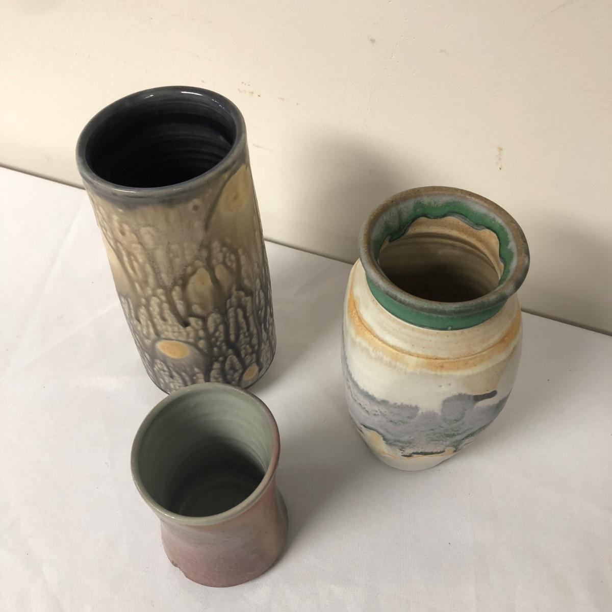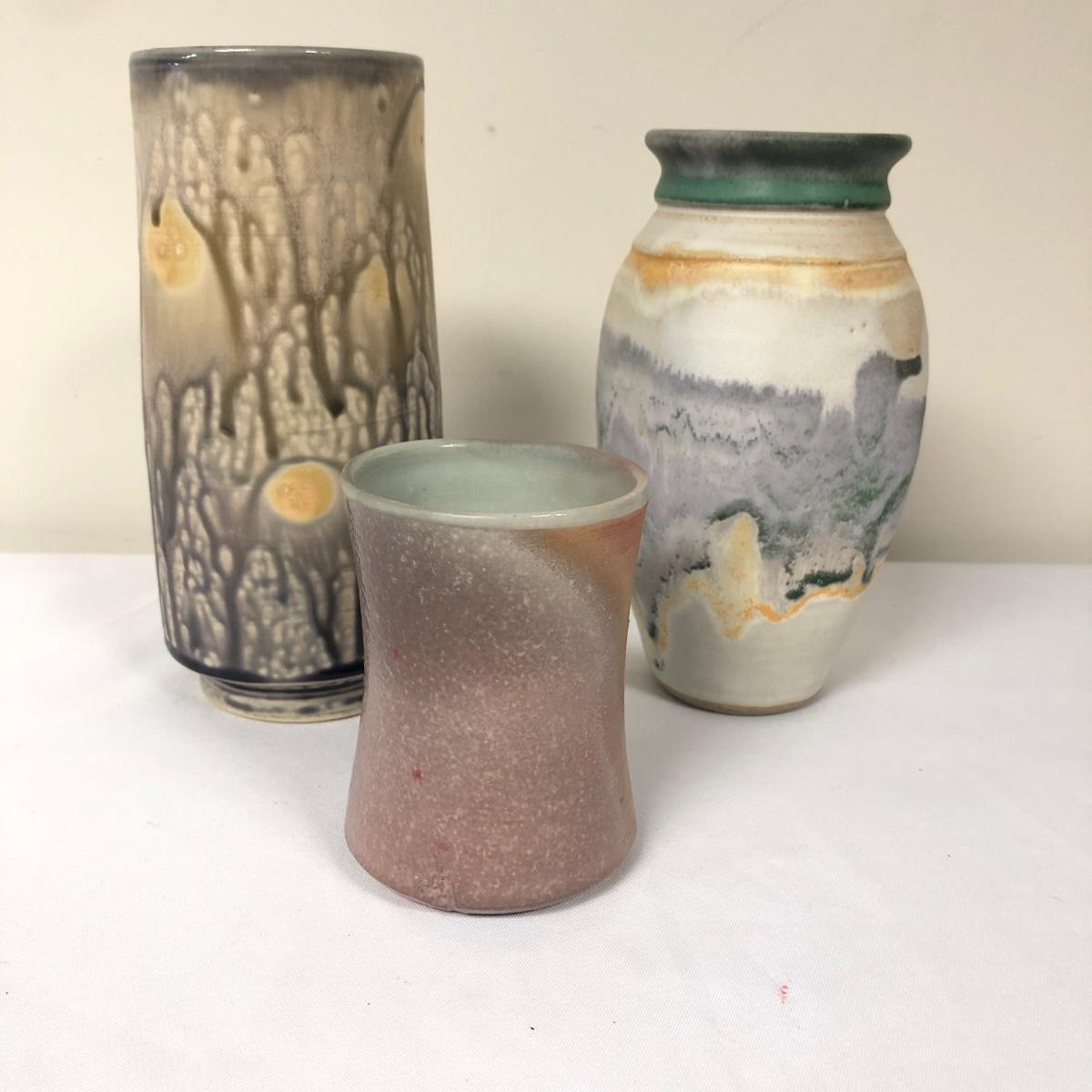 This lot includes three hand painted ceramic vases. All three have signatures on the bottom of them. The four sided “Dirt Works” vase is over 3.5” wide and stands 8” tall. The smallest vase is over 3” in diameter and stands over 4” tall. The last vase measures 3.5” in diameter and stands 9” tall. Shipping Available.