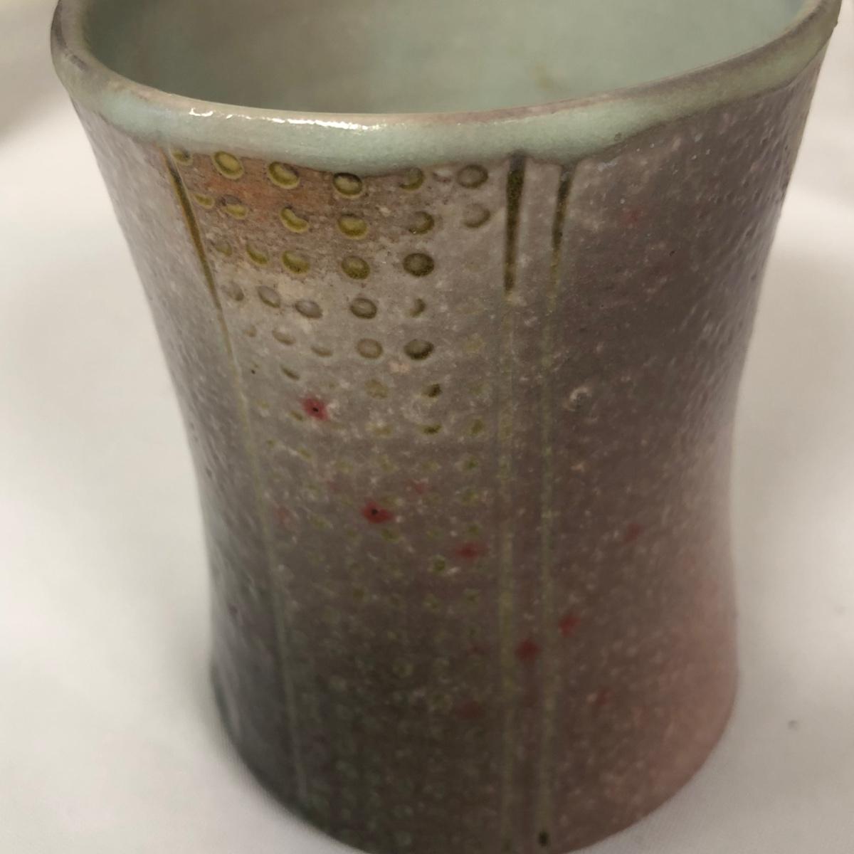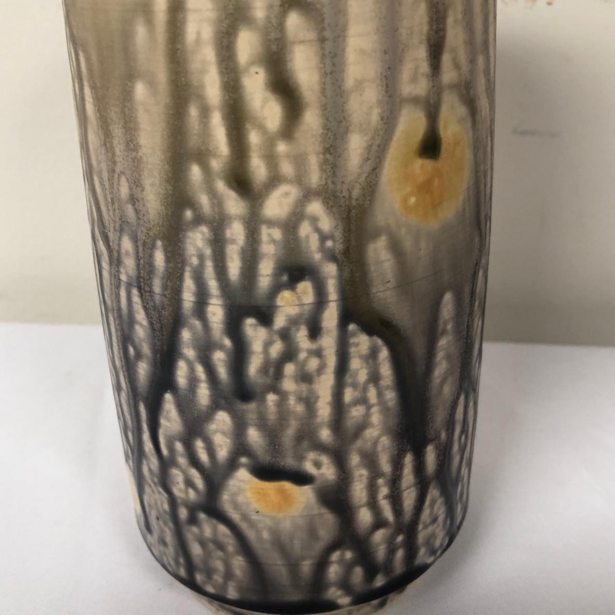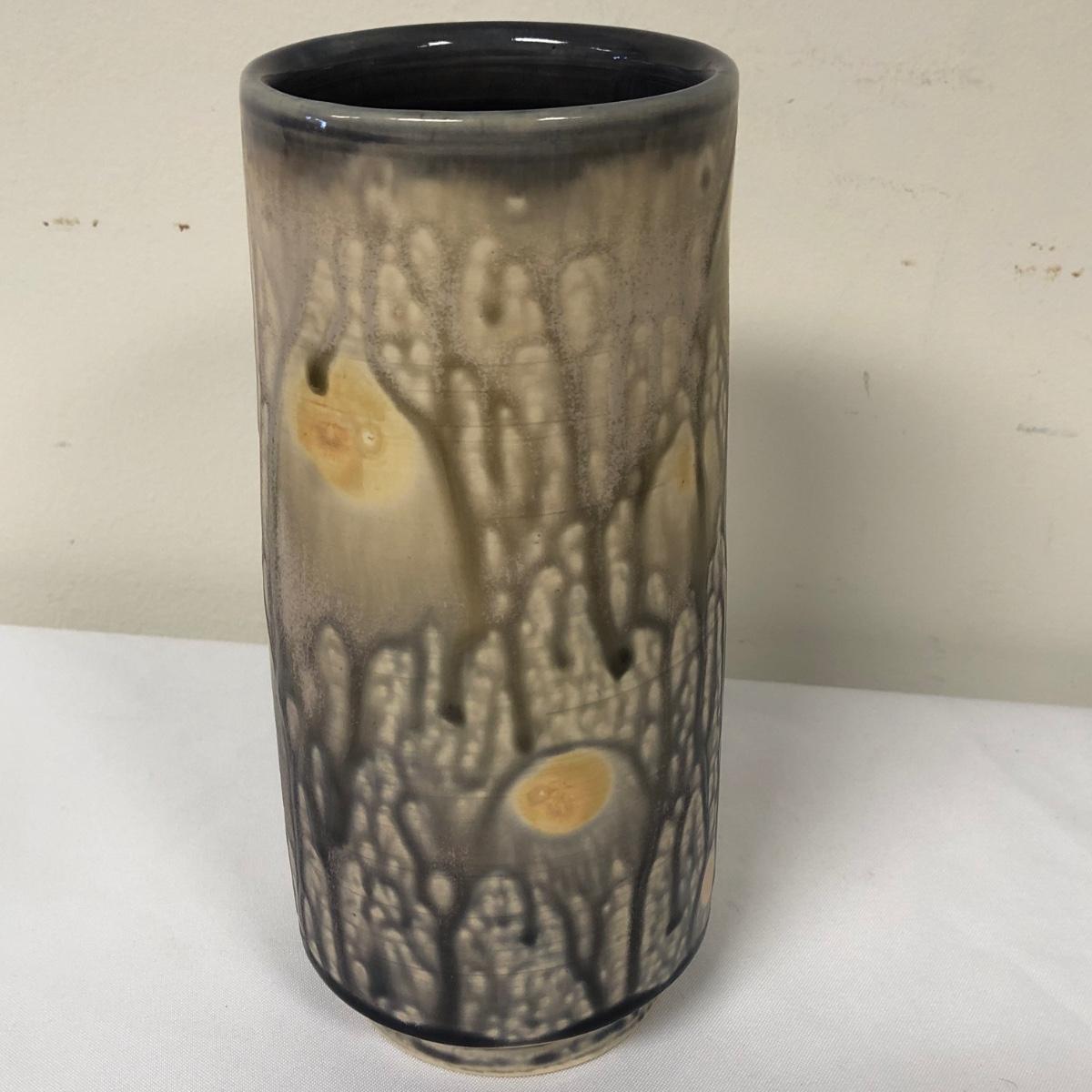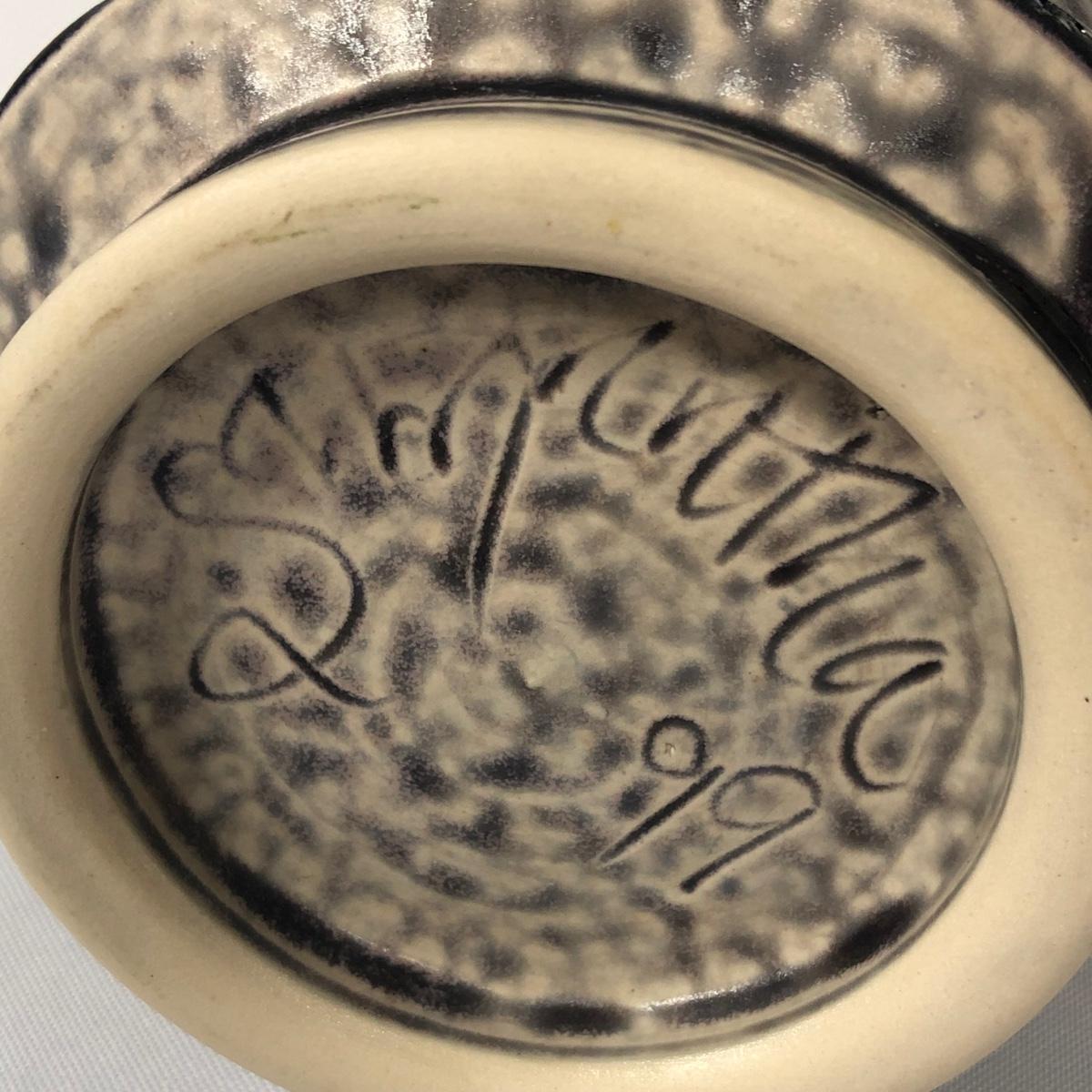 This lot includes three hand painted ceramic vases. All three have signatures on the bottom of them. The four sided “Dirt Works” vase is over 3.5” wide and stands 8” tall. The smallest vase is over 3” in diameter and stands over 4” tall. The last vase measures 3.5” in diameter and stands 9” tall. Shipping Available.