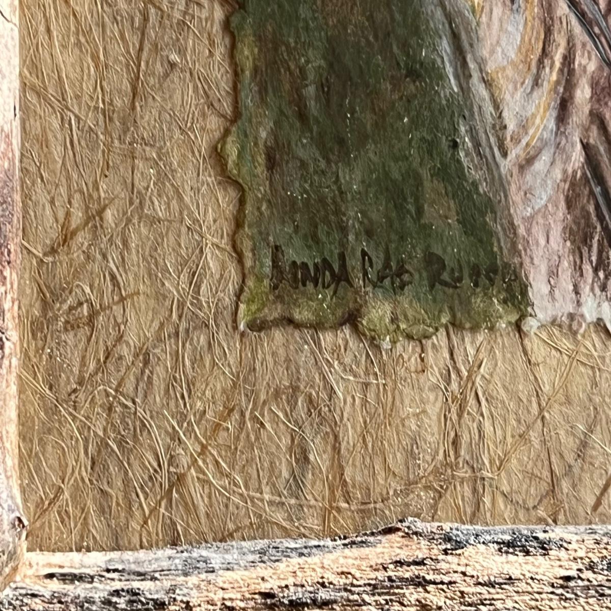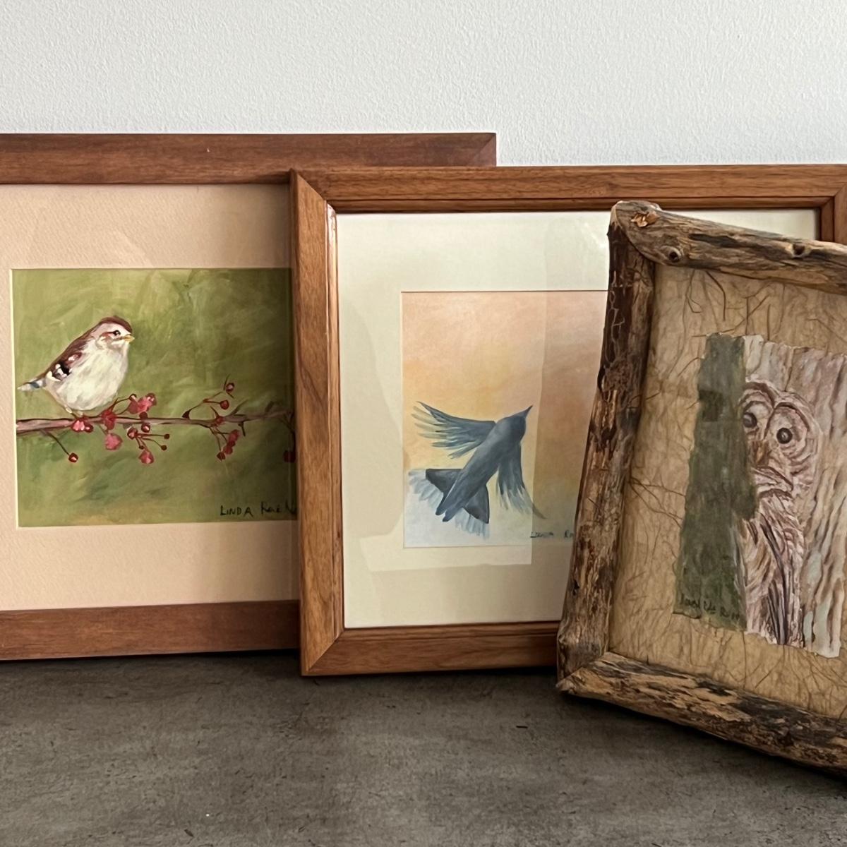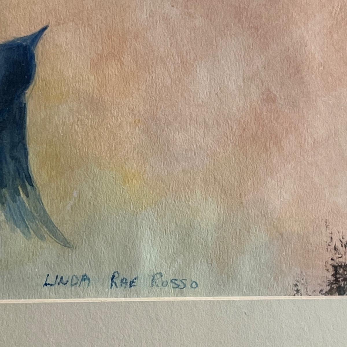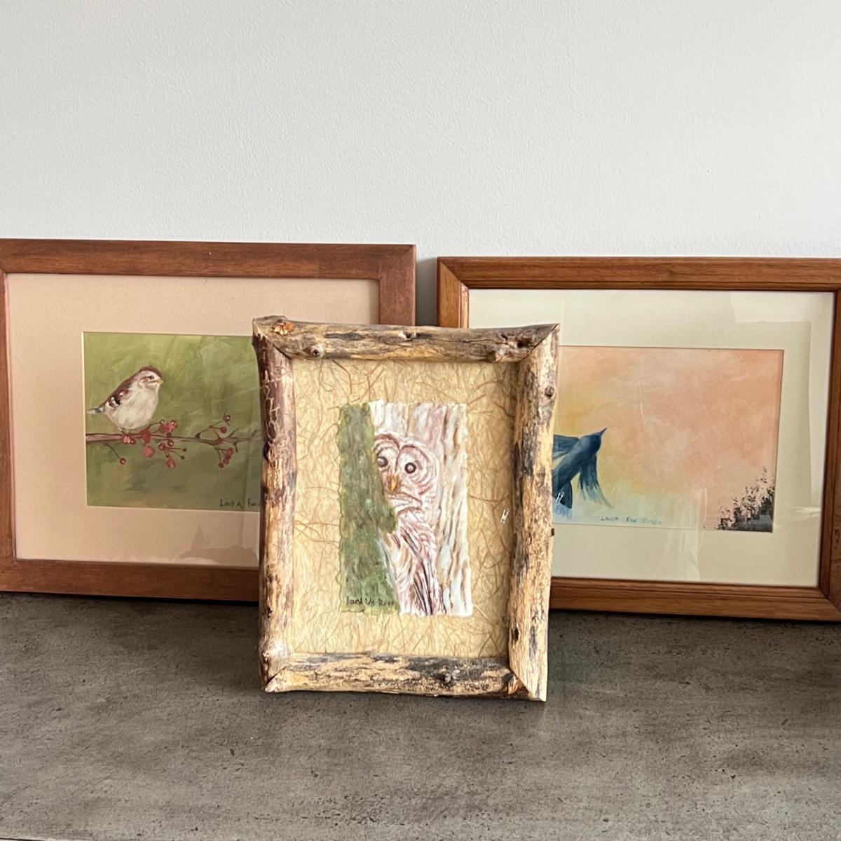 All three of these Linda Rae Russo prints are signed by the artist. Her card states the originals were oils on canvas. The two larger prints are under glass and in similar wood frames. The Bluebird frame is slightly smaller. The larger frame has one very minor ding, see images. Also under glass, the owl is mounted on a lovely natural fiber paper and has a hand made frame made from raw, weathered wood.