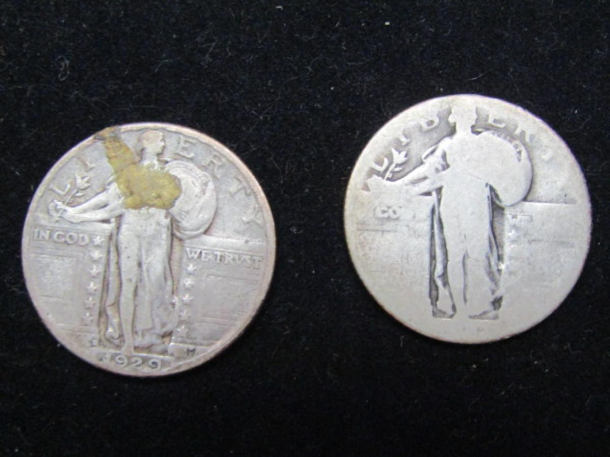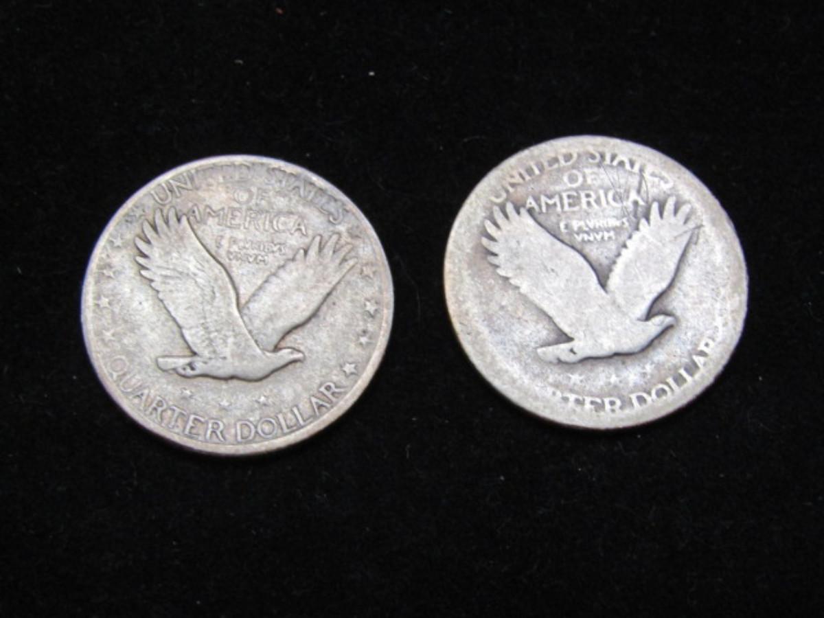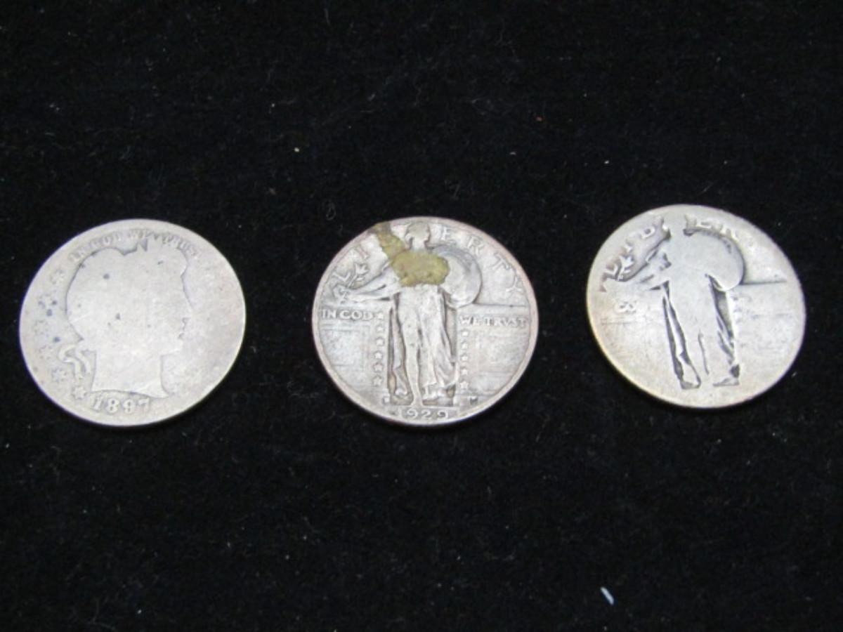 Three Silver Quarters (C). One 1897 Barber, Two Standing Liberty. Heavy Wear.