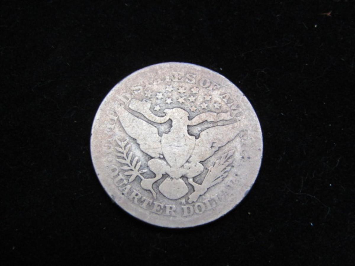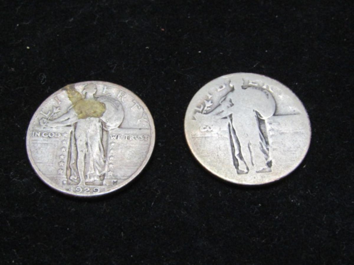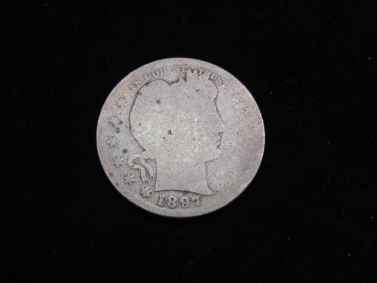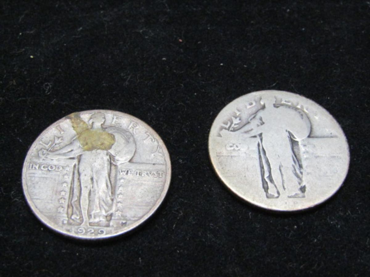 Three Silver Quarters (C). One 1897 Barber, Two Standing Liberty. Heavy Wear.
