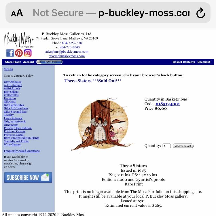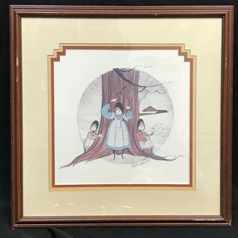 Overall in good condition. There is some scuffing, and a gouge on the frame. This is number 55 from a limited edition series of 1000 prints. “Three Sisters“ has been long since been discontinued since it’s initial run in 1985, and P. Buckley Moss appraises this work at $265 today, against an original retail price of $70. Starting bid is only $1. Don’t miss this chance!