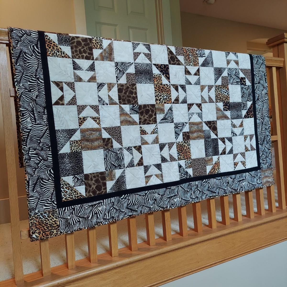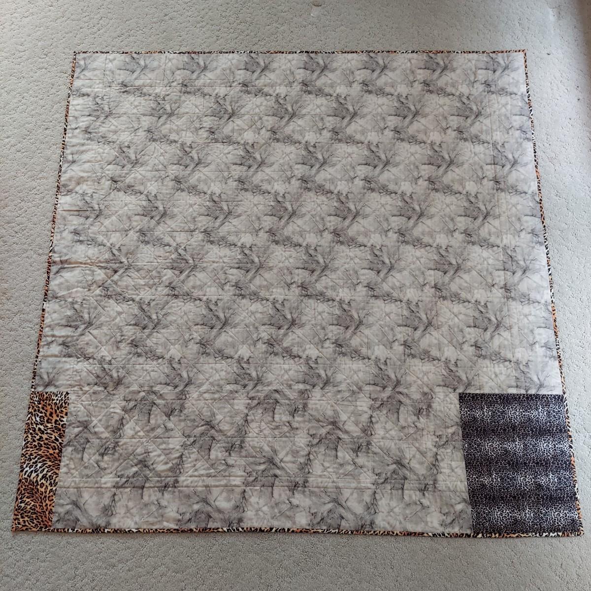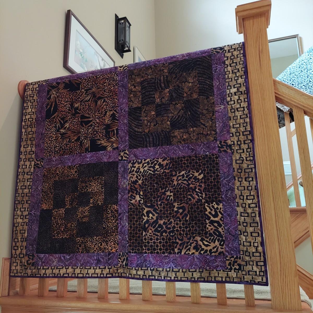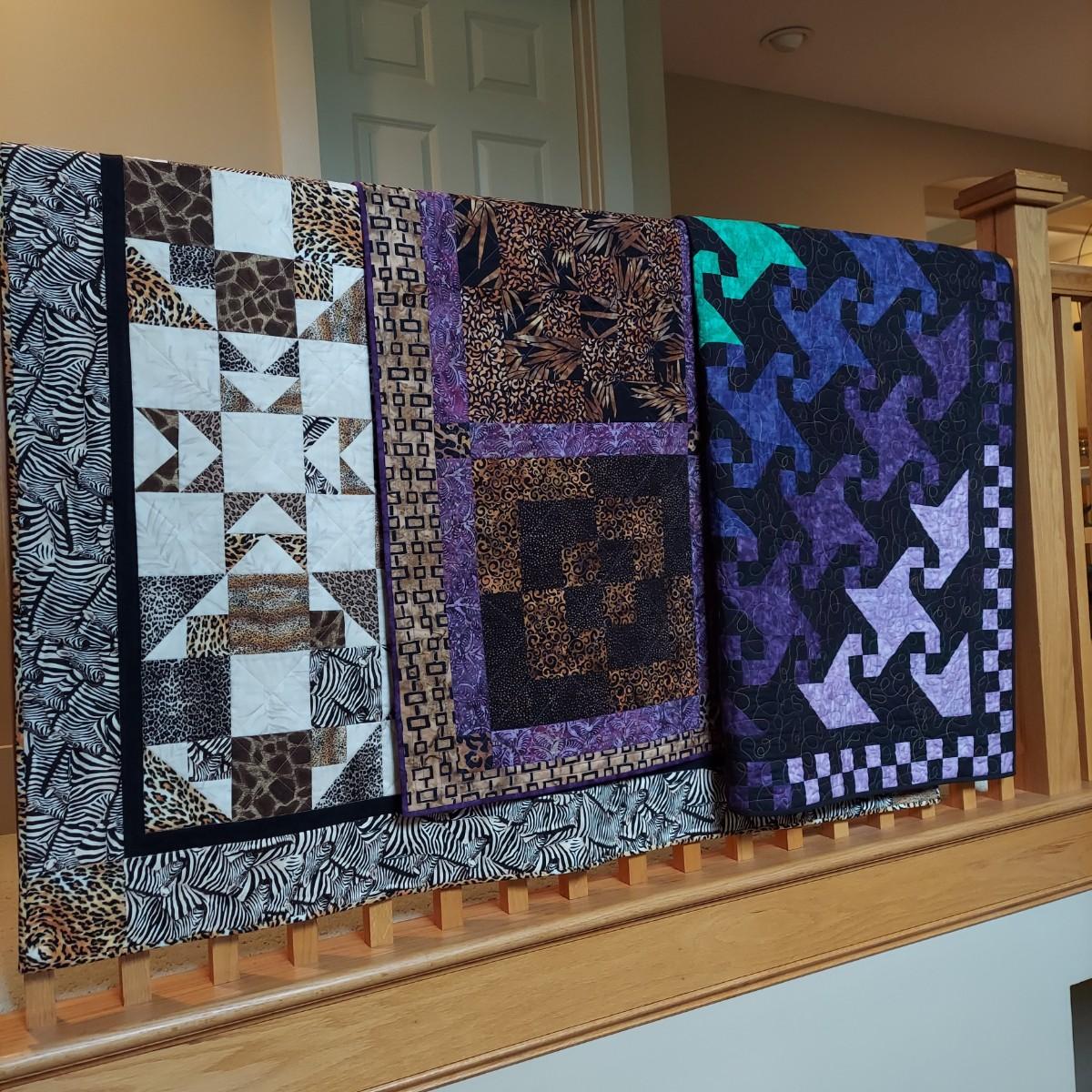 Three small decorative quilts. Originally hung over the banister as home decor, but could also be hung on a wall or would be beautiful as bed toppers. The black background with rainbow panels is approximately 66" x 55". The neutral tone animal print is approximately 57" x 57". The purple with leopard print is approximately 42" x 55". Shipping available.