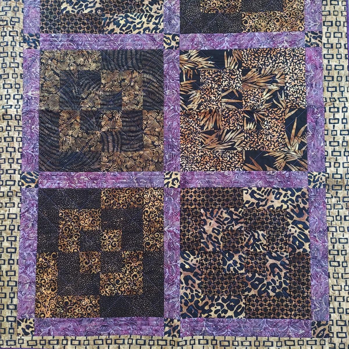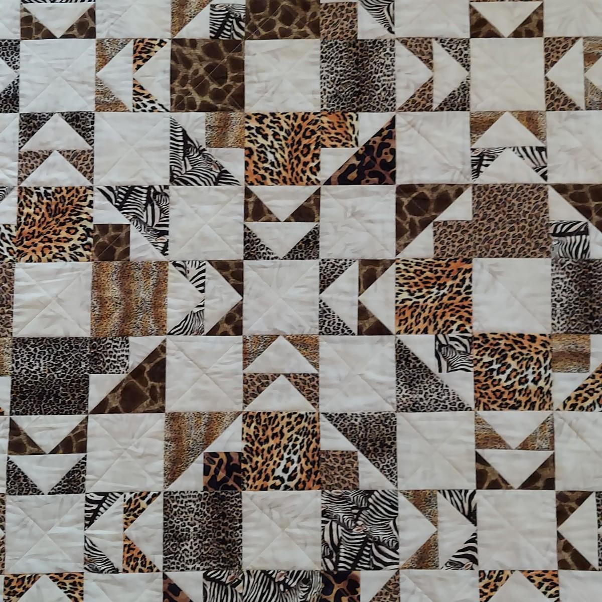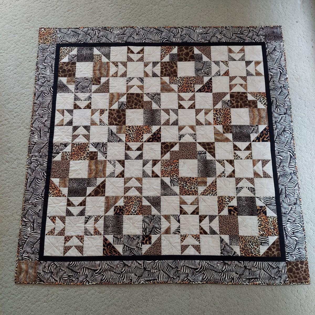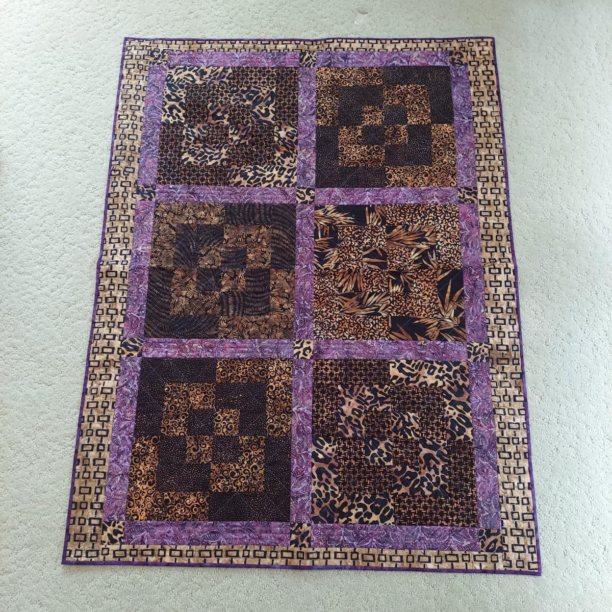 Three small decorative quilts. Originally hung over the banister as home decor, but could also be hung on a wall or would be beautiful as bed toppers. The black background with rainbow panels is approximately 66" x 55". The neutral tone animal print is approximately 57" x 57". The purple with leopard print is approximately 42" x 55". Shipping available.