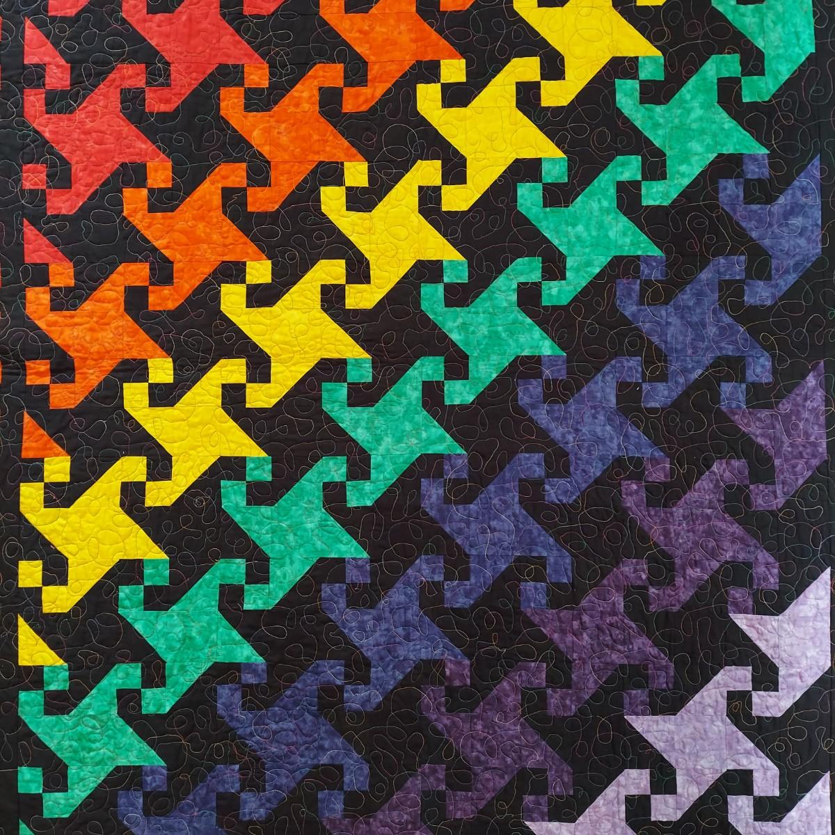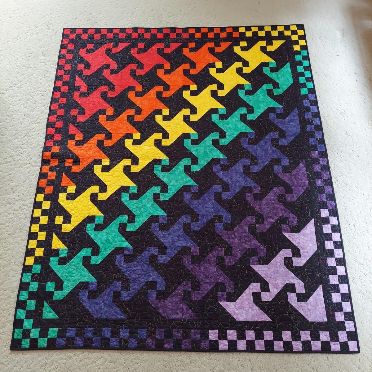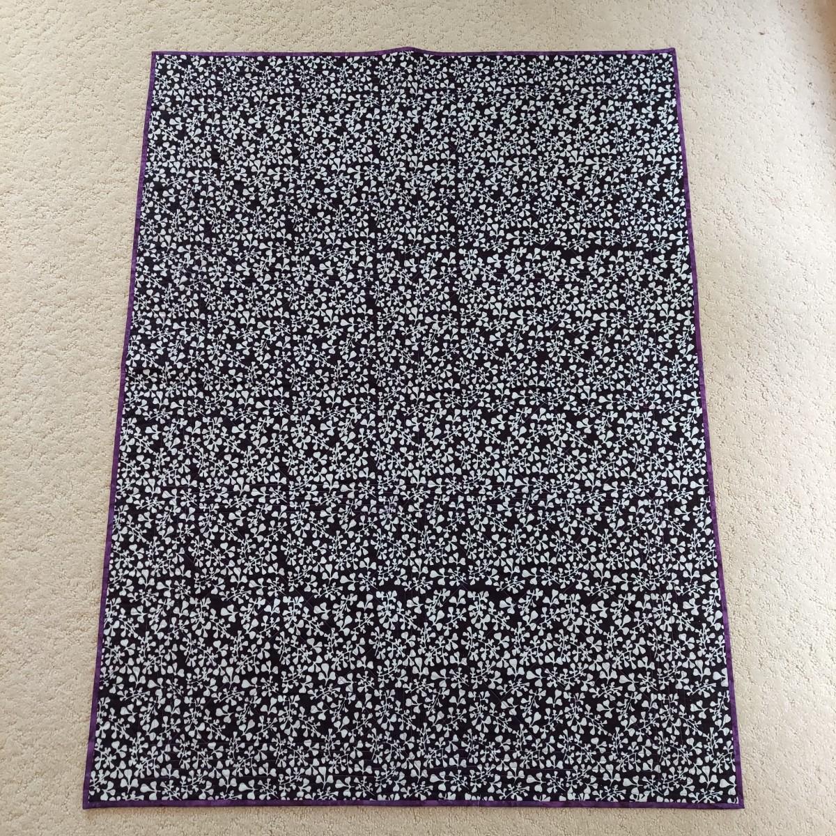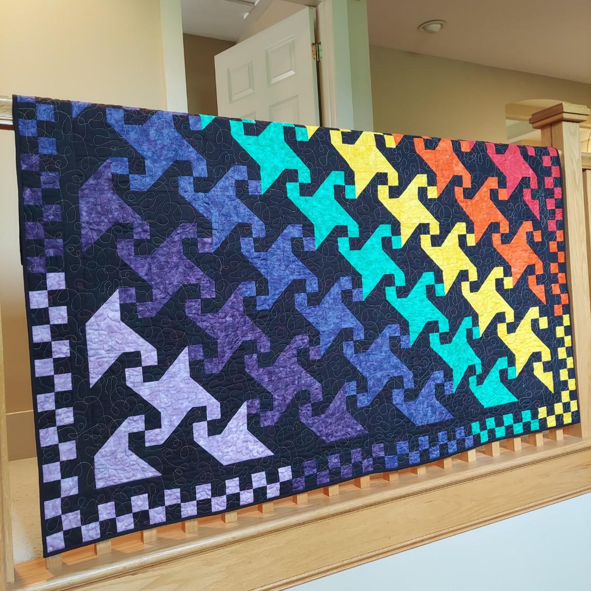 Three small decorative quilts. Originally hung over the banister as home decor, but could also be hung on a wall or would be beautiful as bed toppers. The black background with rainbow panels is approximately 66" x 55". The neutral tone animal print is approximately 57" x 57". The purple with leopard print is approximately 42" x 55". Shipping available.
