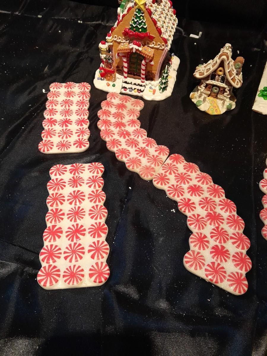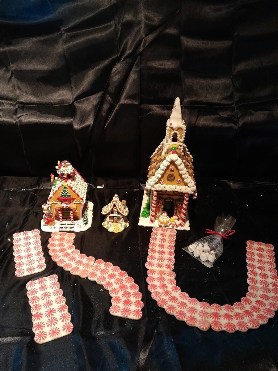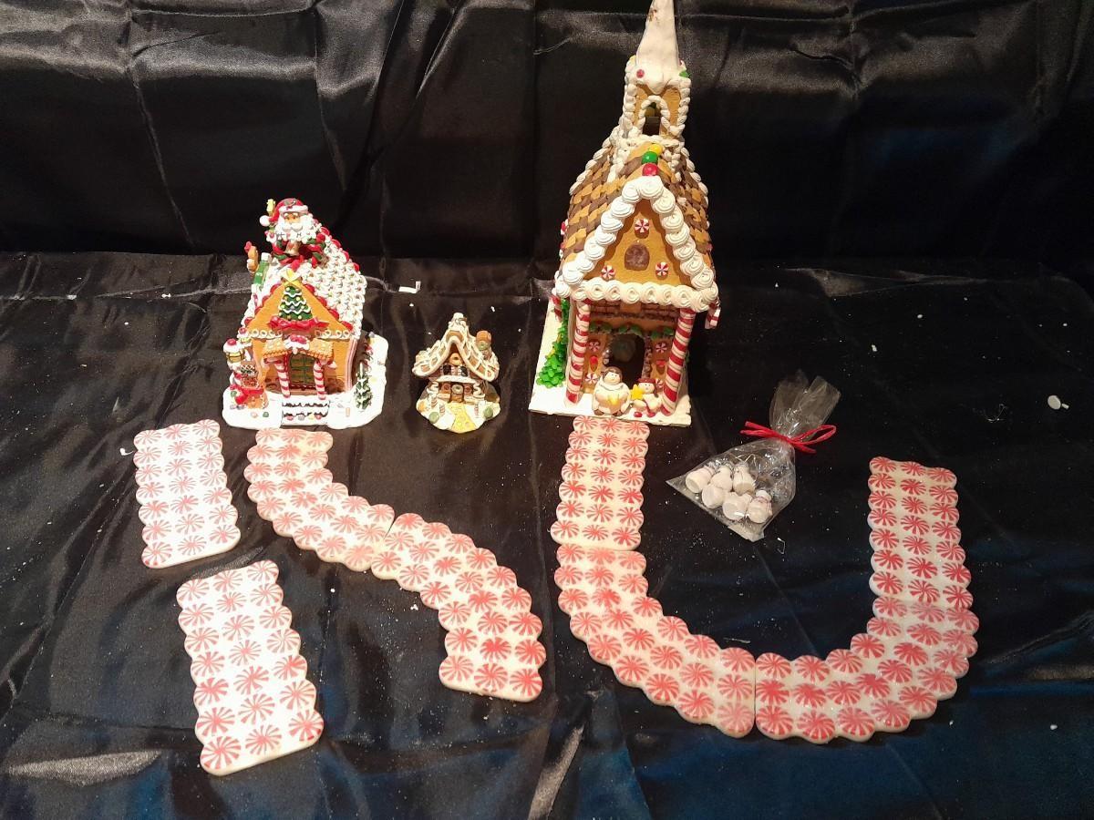 THREE SMALL GINGERBREAD HOUSES WITH PEPPERMINT WALKWAY