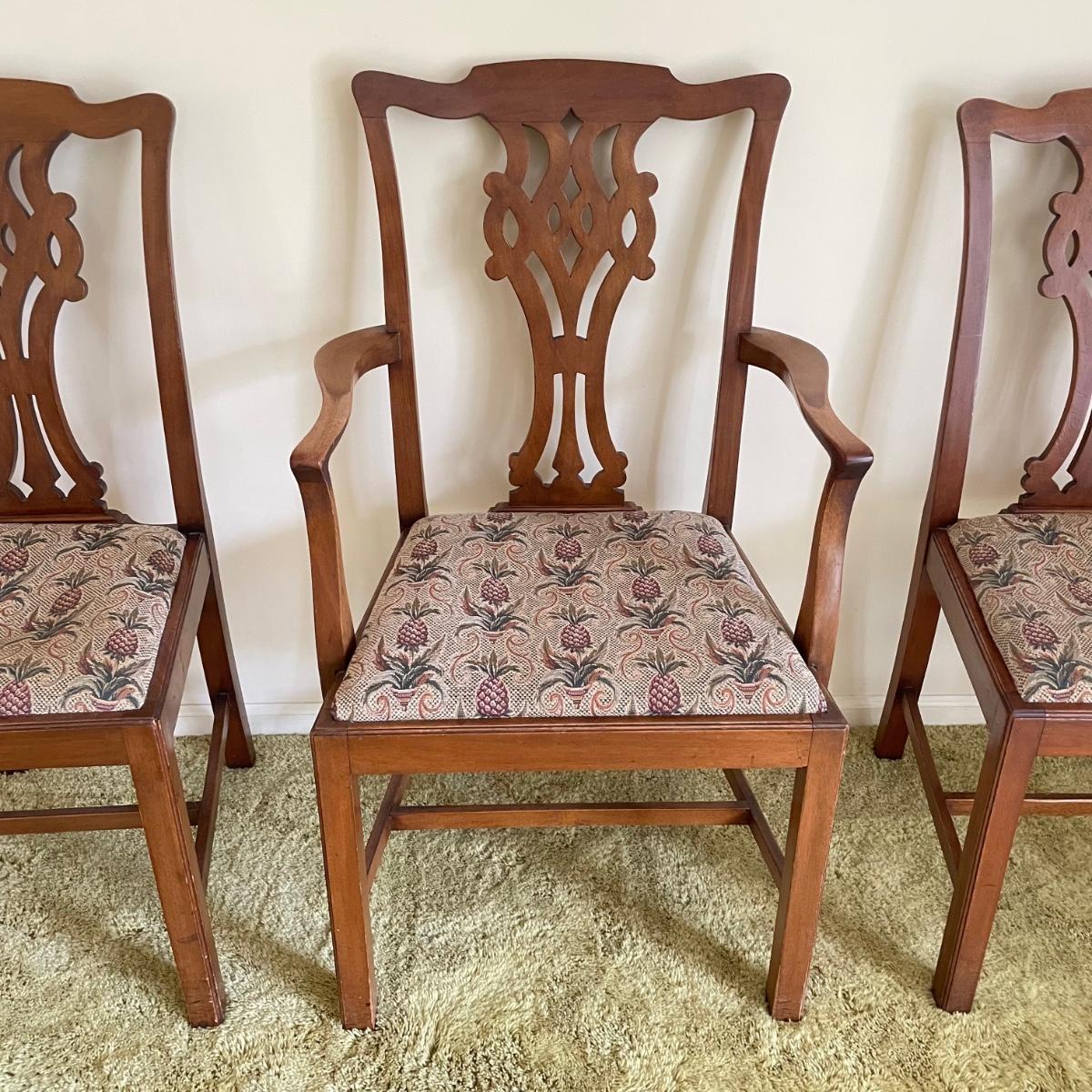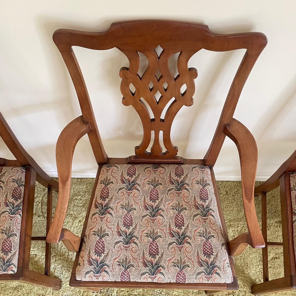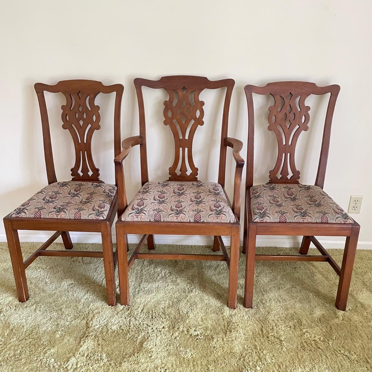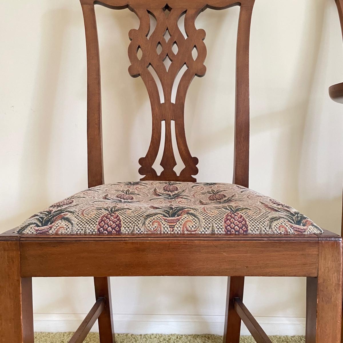 Three solid wood chairs with pineapple upholstery; one has armrests. The cushions have sunken down a bit, but chairs are finely crafted and in very nice condition. The armrest chair is a bit wider and a slightly lighter shade wood frame than the other two. It measures 21.5” x 23” x 40” with a seat height at 18”. See images. Local pick up only.