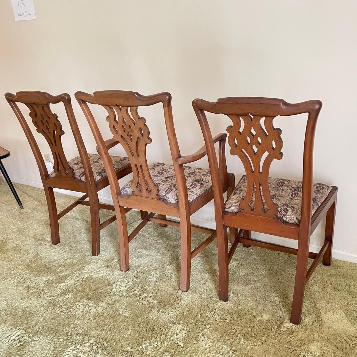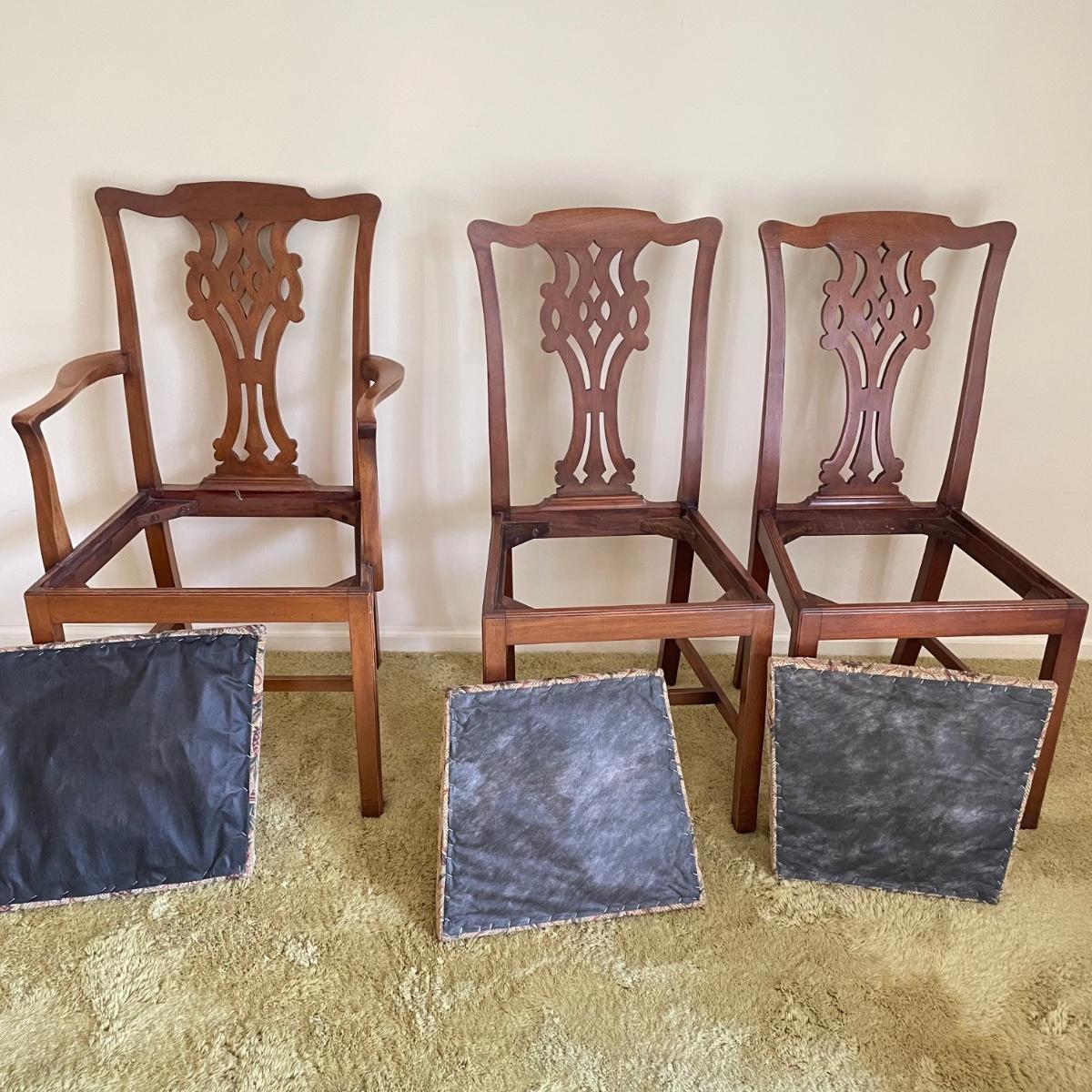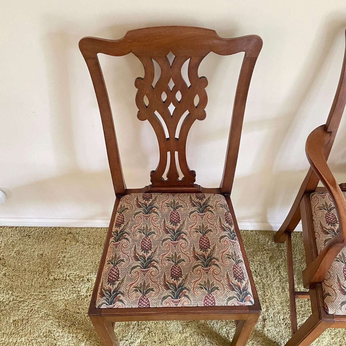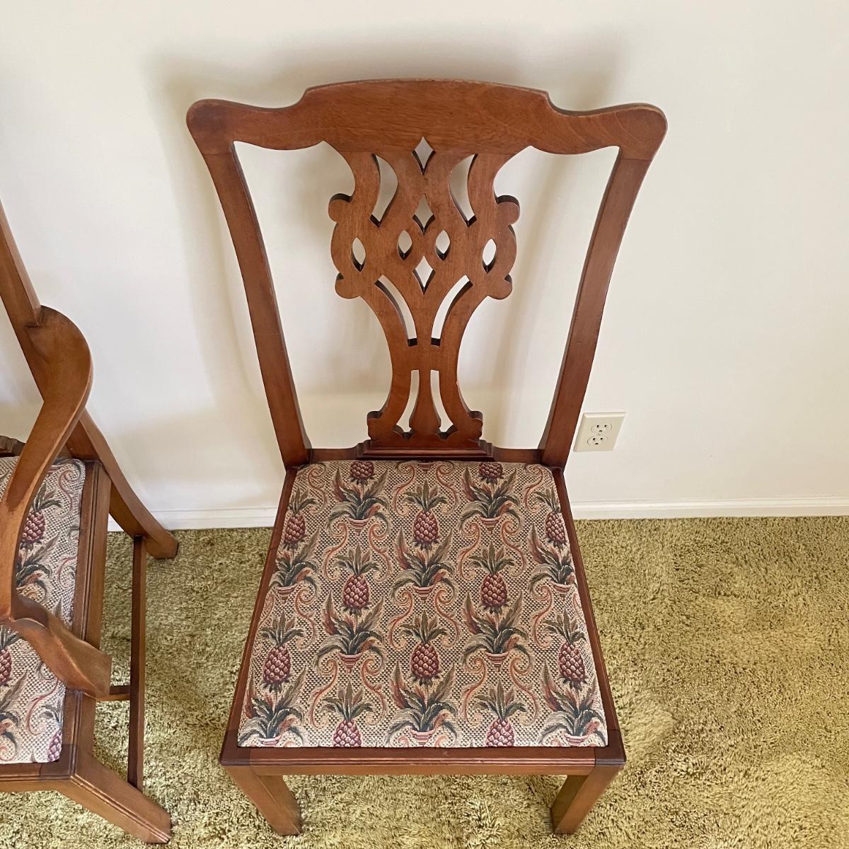 Three solid wood chairs with pineapple upholstery; one has armrests. The cushions have sunken down a bit, but chairs are finely crafted and in very nice condition. The armrest chair is a bit wider and a slightly lighter shade wood frame than the other two. It measures 21.5” x 23” x 40” with a seat height at 18”. See images. Local pick up only.