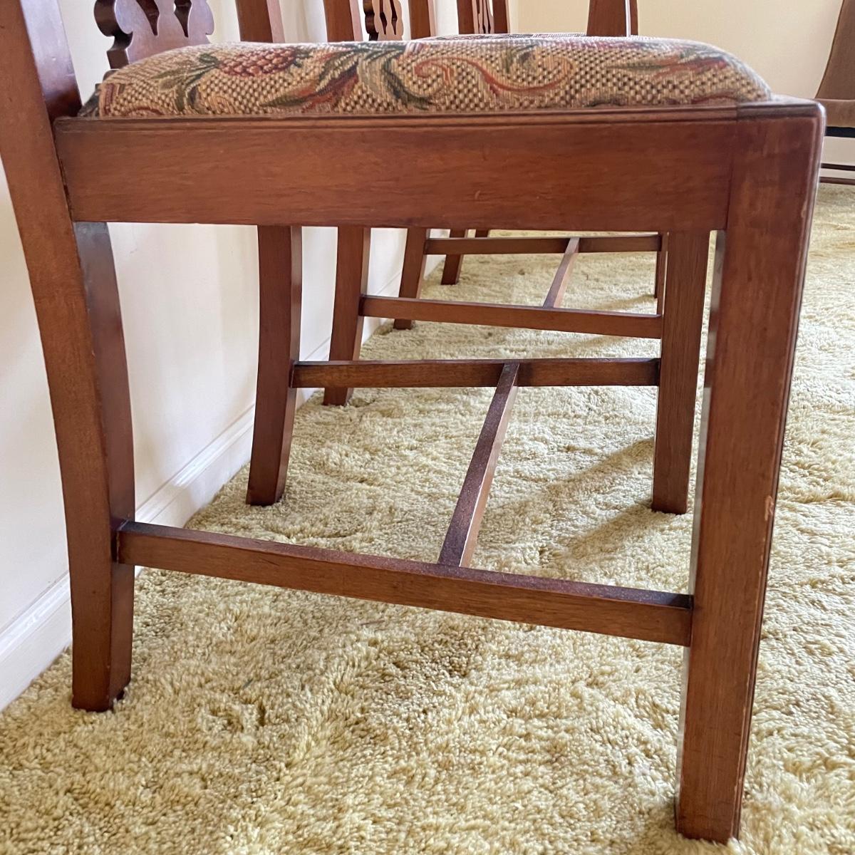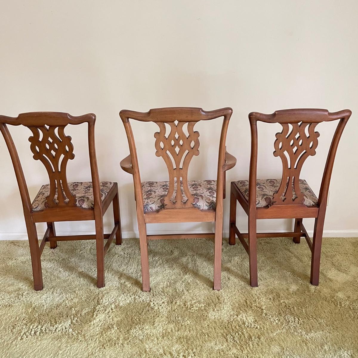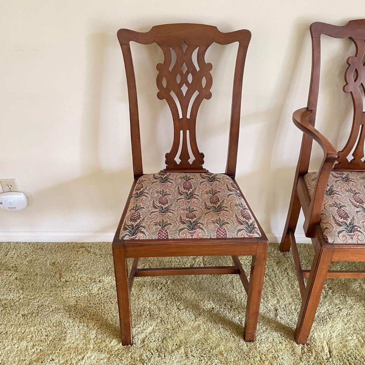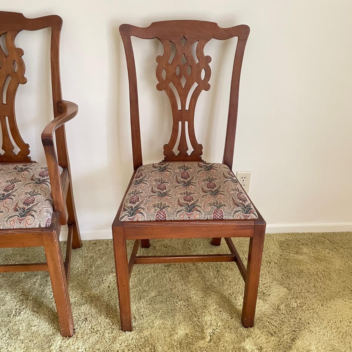 Three solid wood chairs with pineapple upholstery; one has armrests. The cushions have sunken down a bit, but chairs are finely crafted and in very nice condition. The armrest chair is a bit wider and a slightly lighter shade wood frame than the other two. It measures 21.5” x 23” x 40” with a seat height at 18”. See images. Local pick up only.
