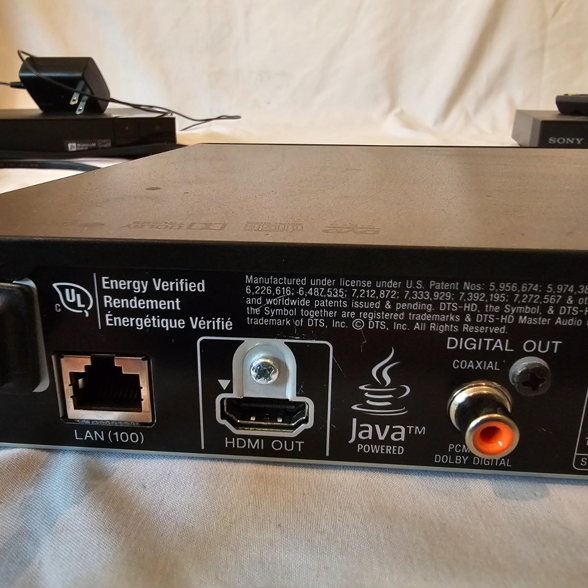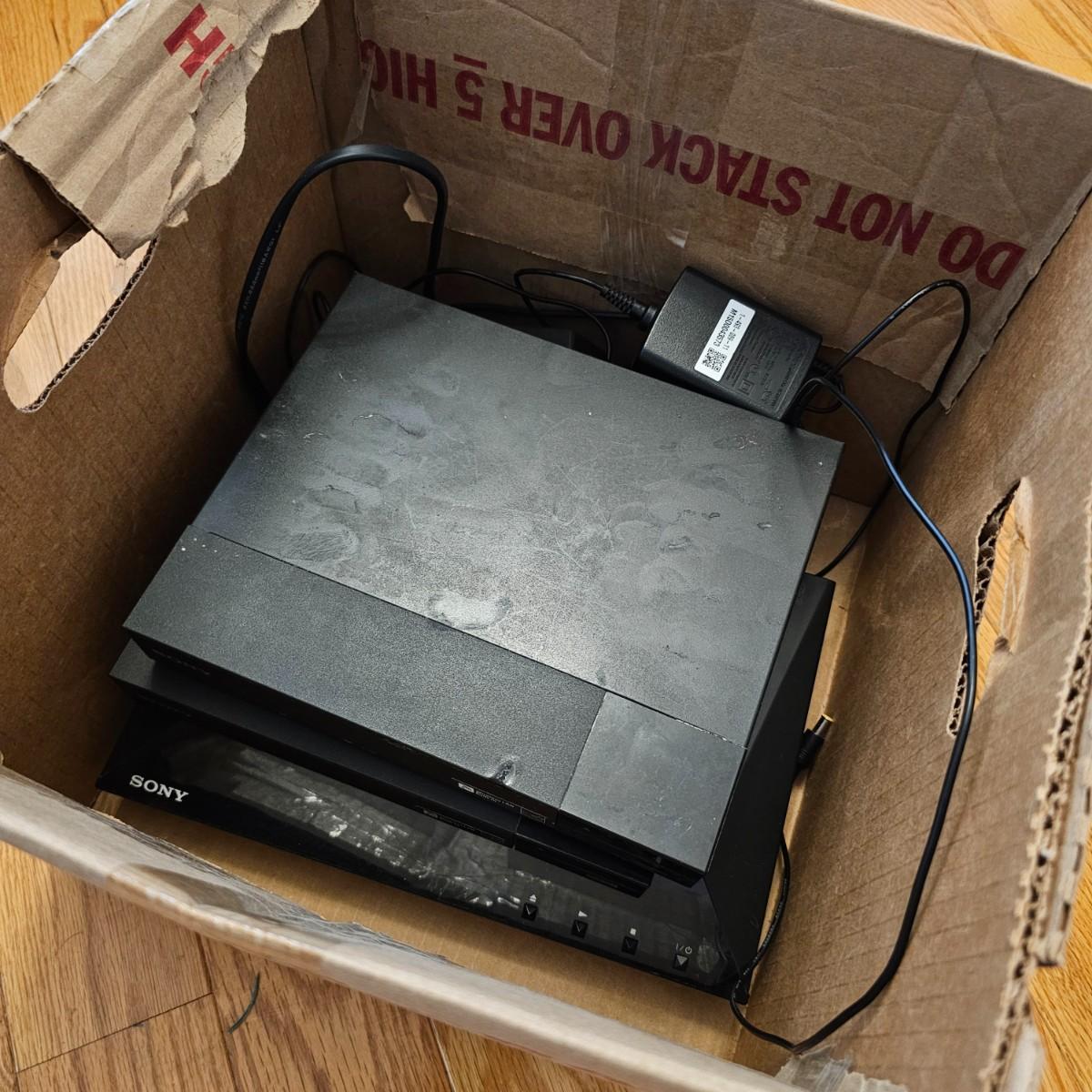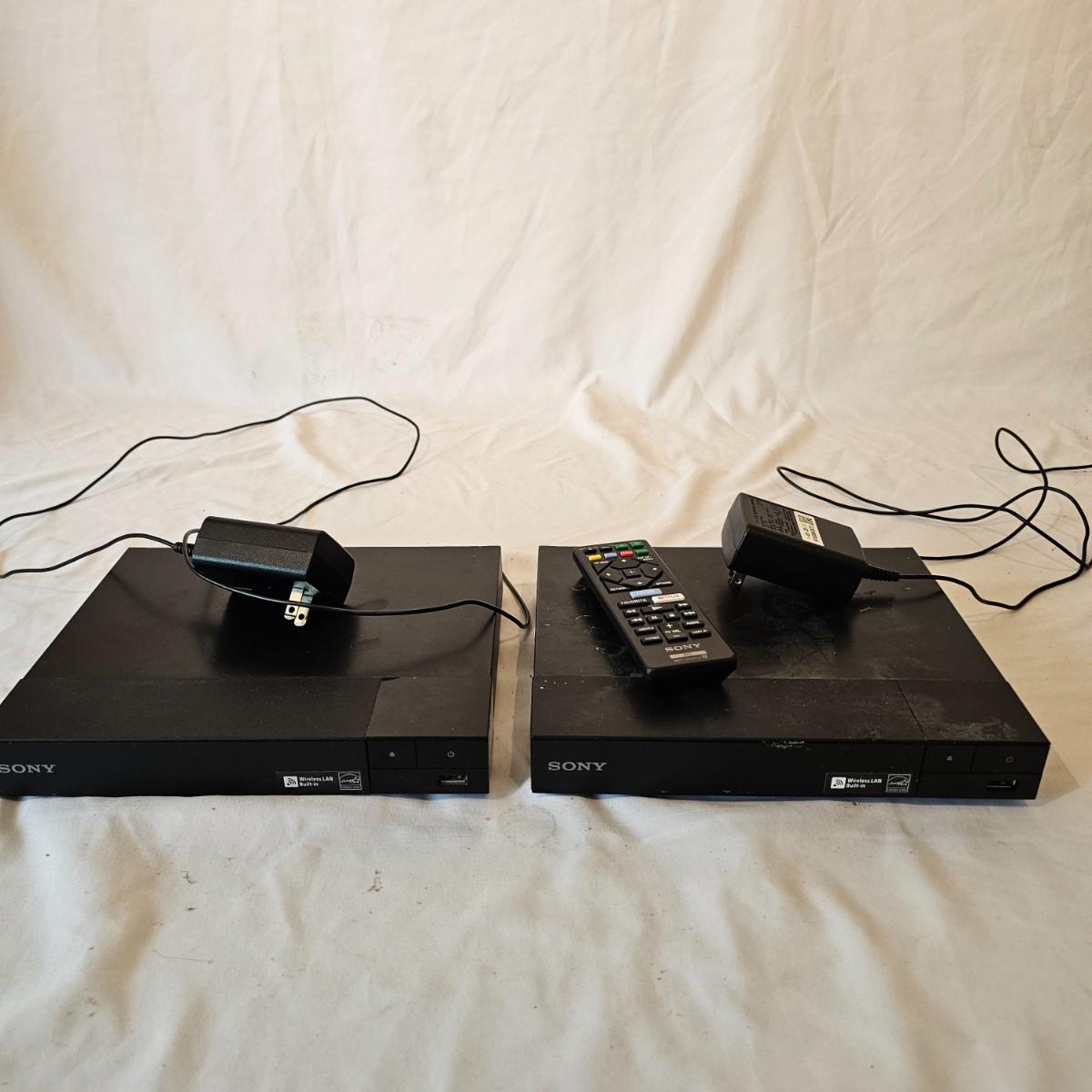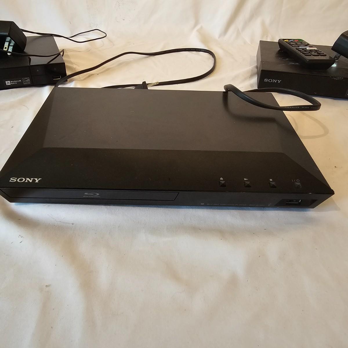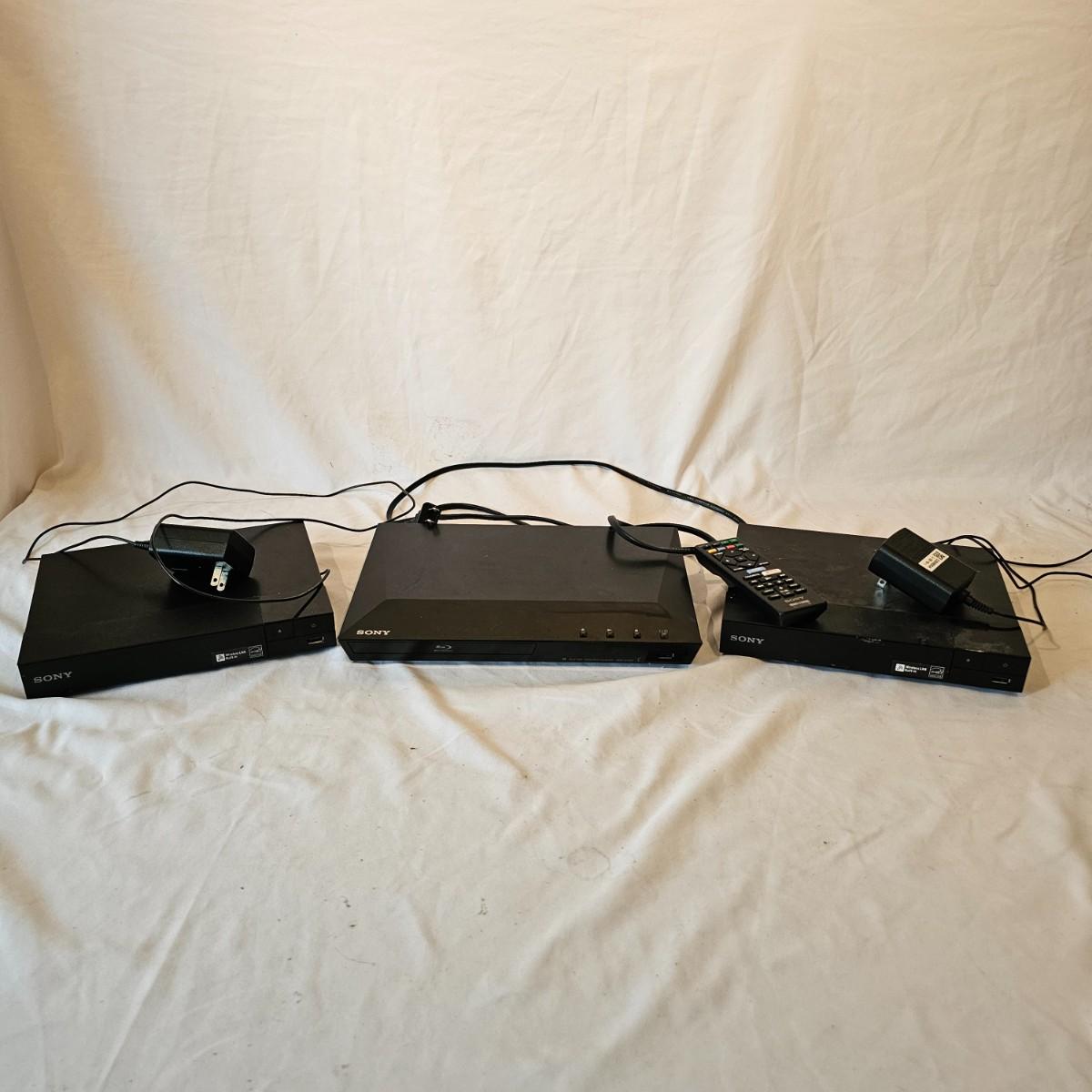 A trio of Sony items, blu-ray and DVD players. Power supplies for each but only one remote. All items powered on when plugged in. Two players are same model and measure 9" x 7.5" x 1.5"H. Case on one has slight blemishes. Third item is 11.5" x 7.5" x 1.5"H. See photos for details. Shipping available.