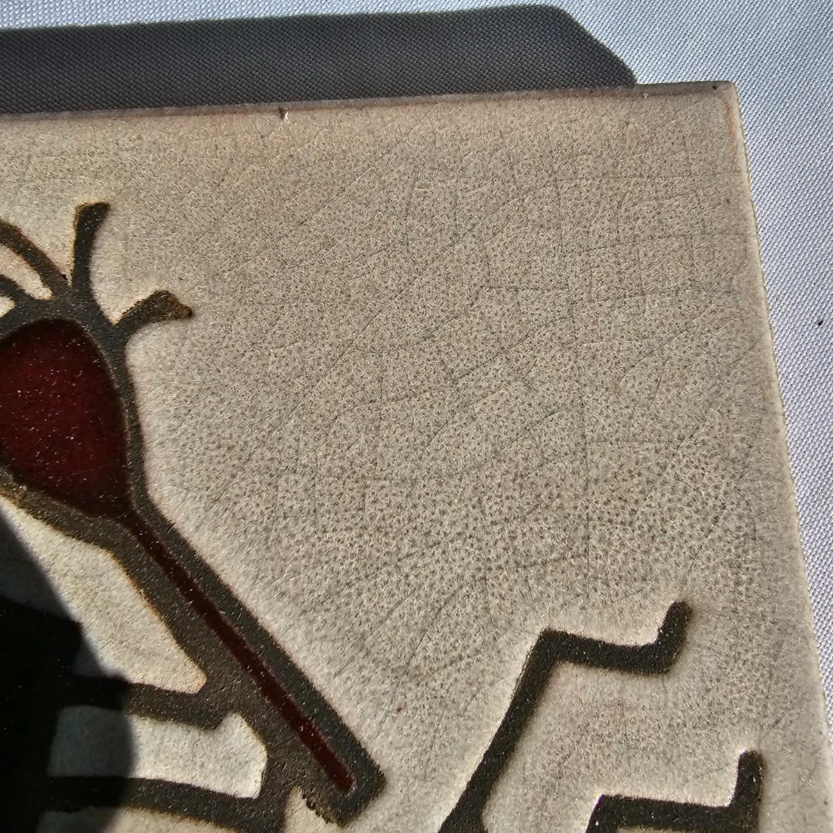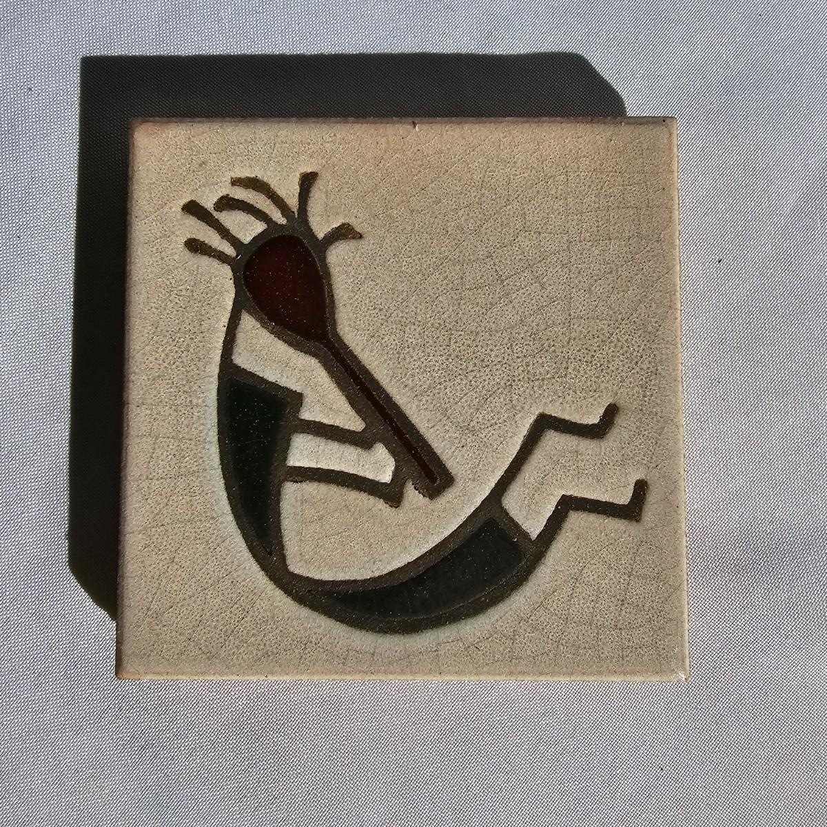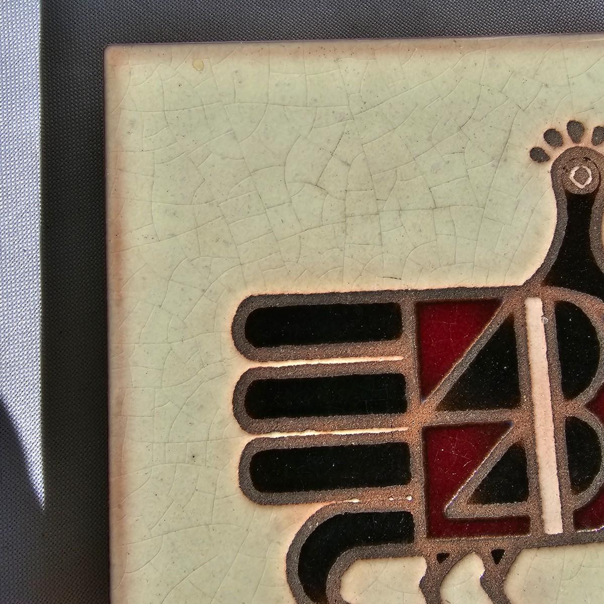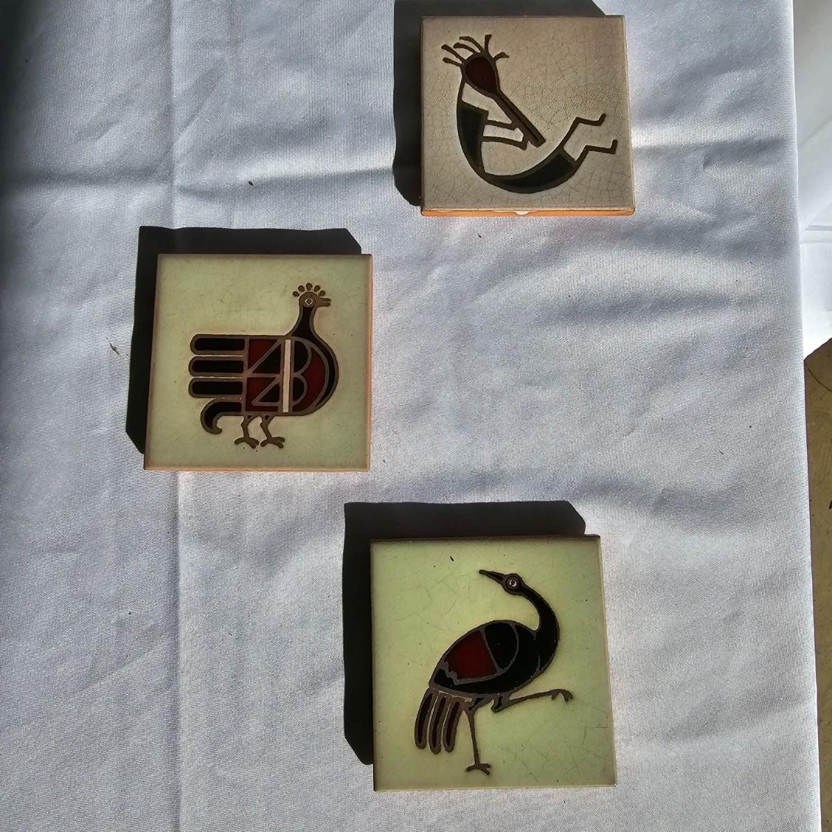 A trio of coaster tiles in a Southwest style. Label signifies that they are Arius Santa Fe tiles. Each tile is glazed, has cork feet on bottom. Shipping available.
