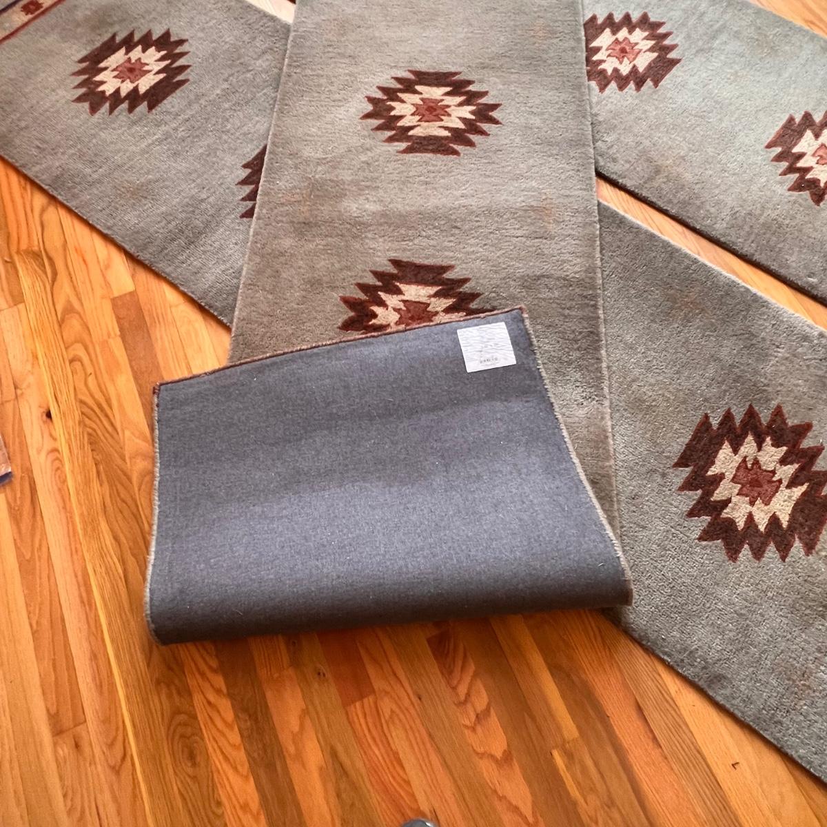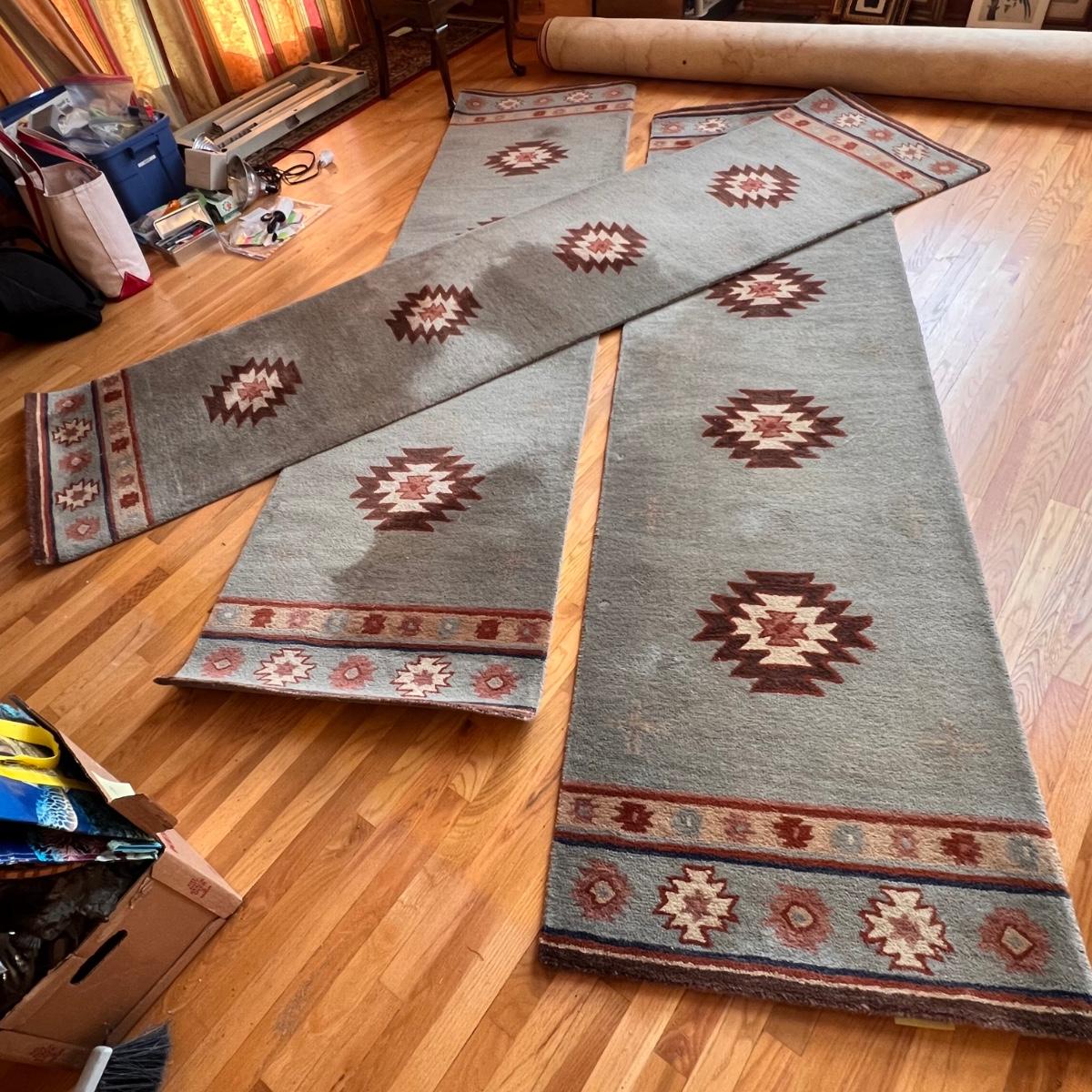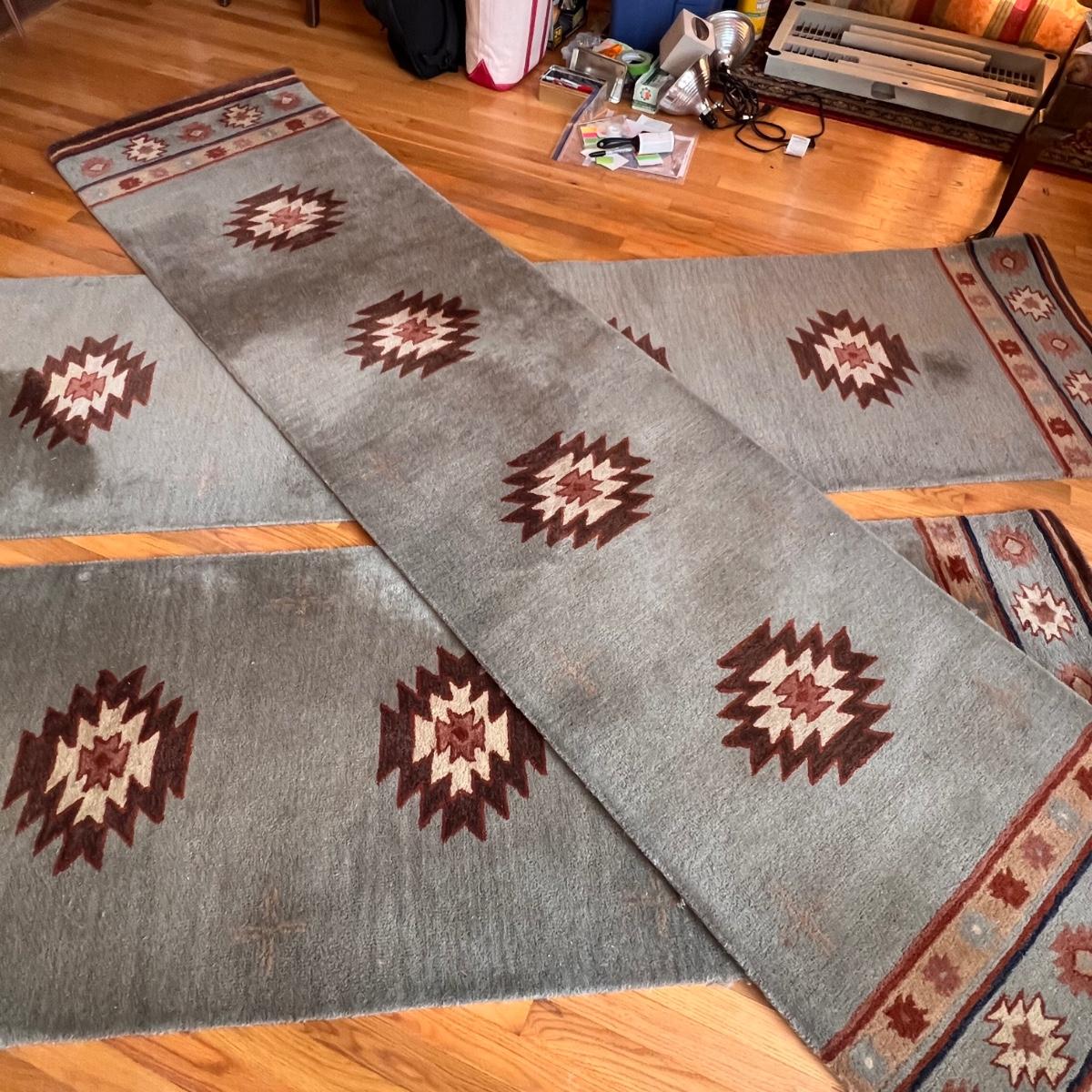 These three matching runner rugs have a medium blue background with a southwestern design. There are significant stains throughout that may possibly come clean. See photos for condition and size.