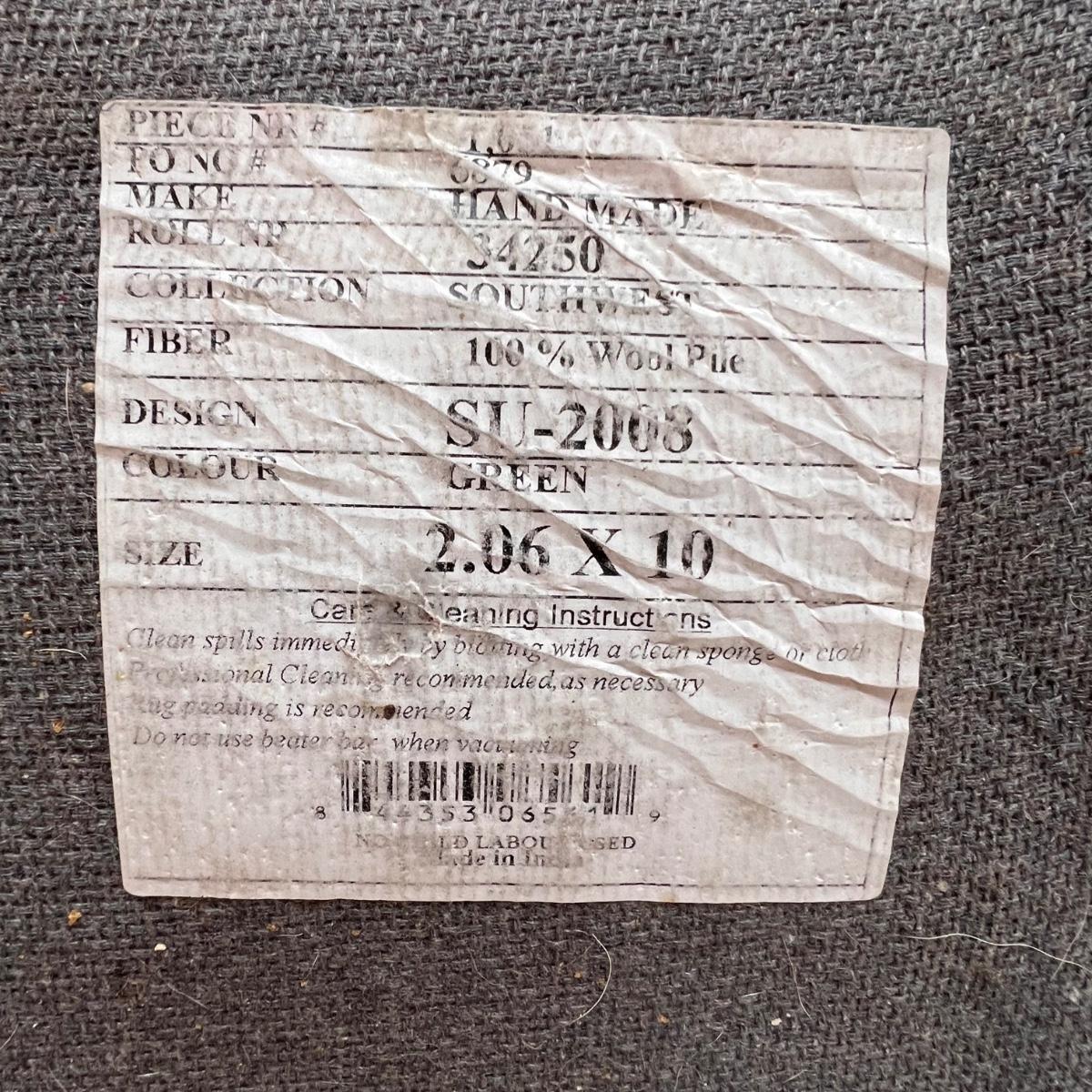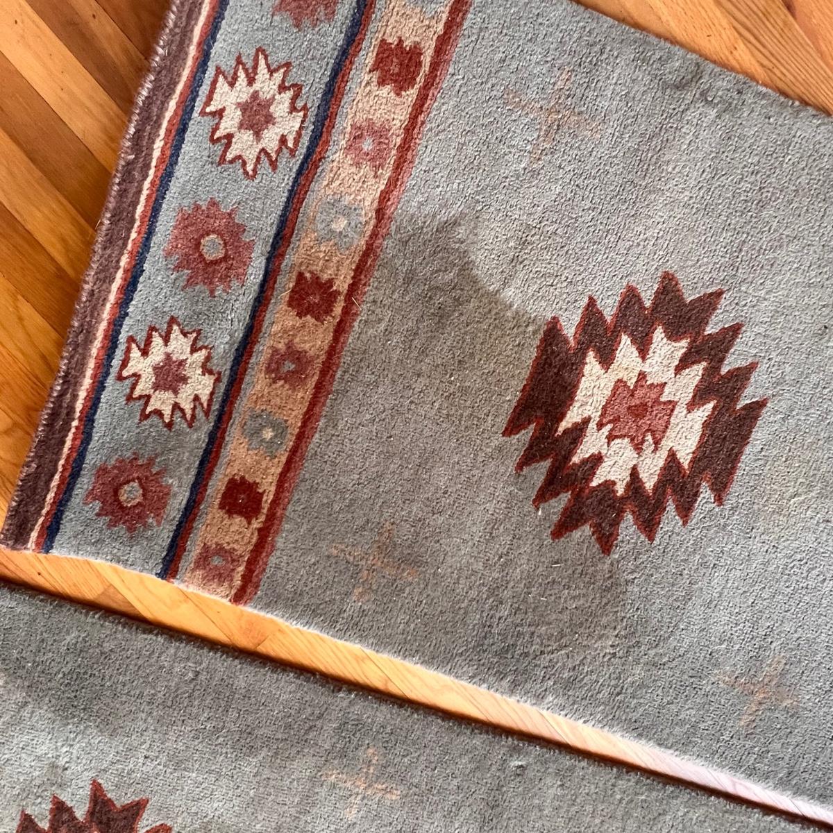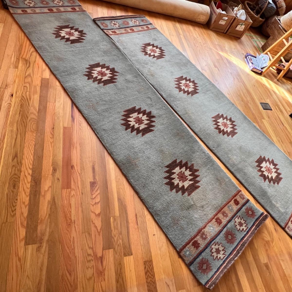 These three matching runner rugs have a medium blue background with a southwestern design. There are significant stains throughout that may possibly come clean. See photos for condition and size.