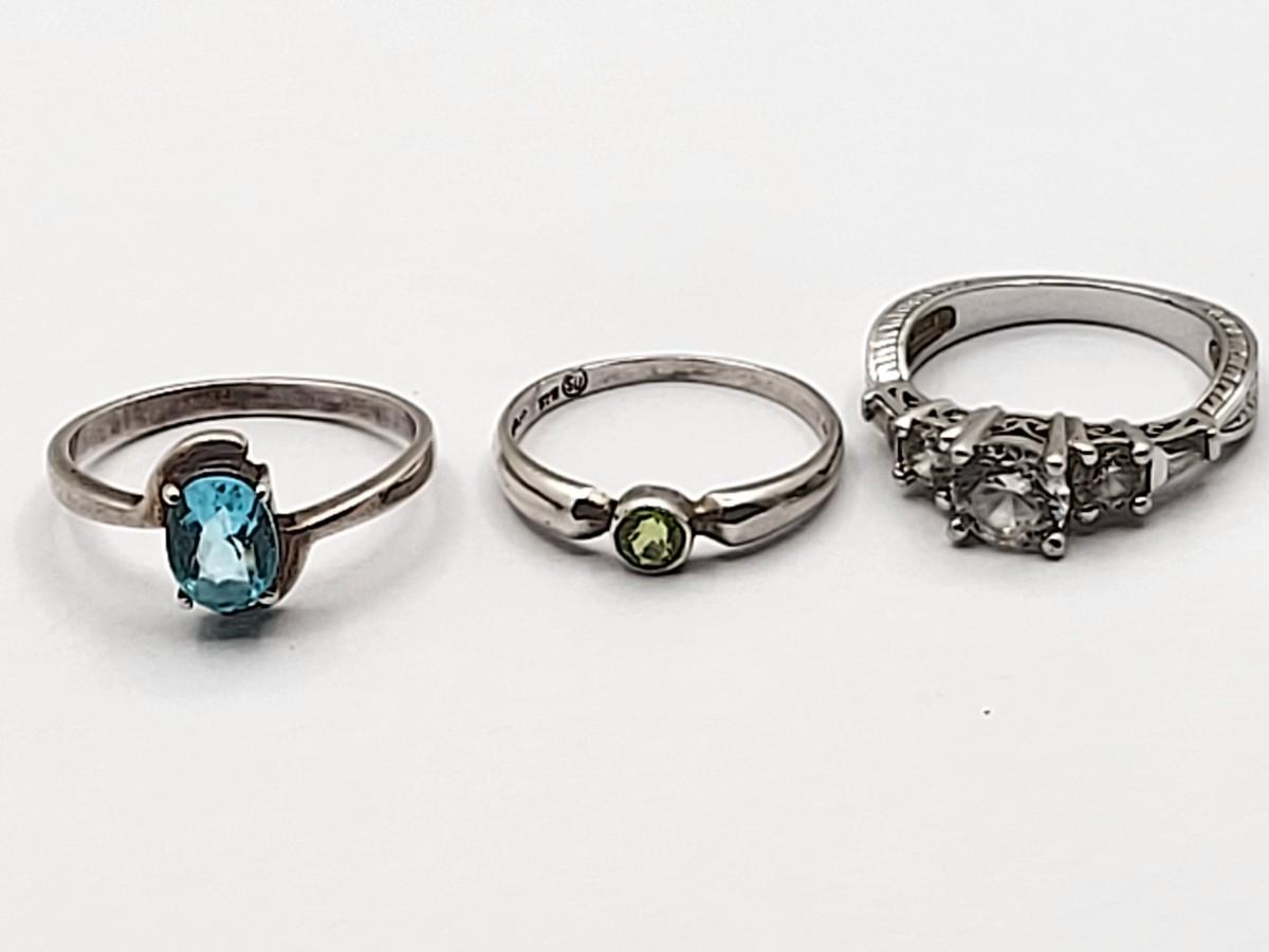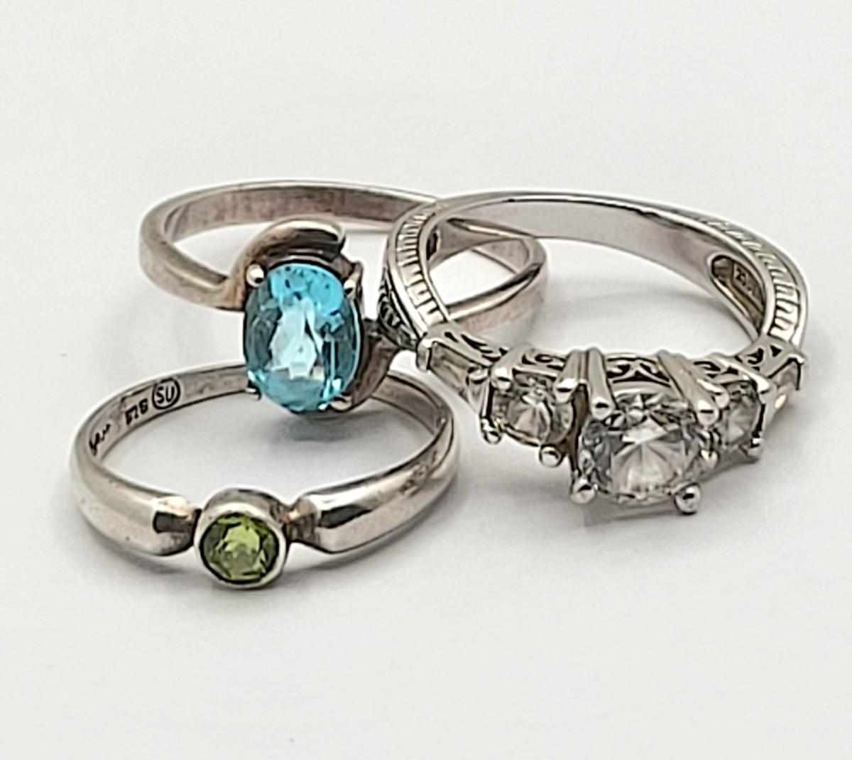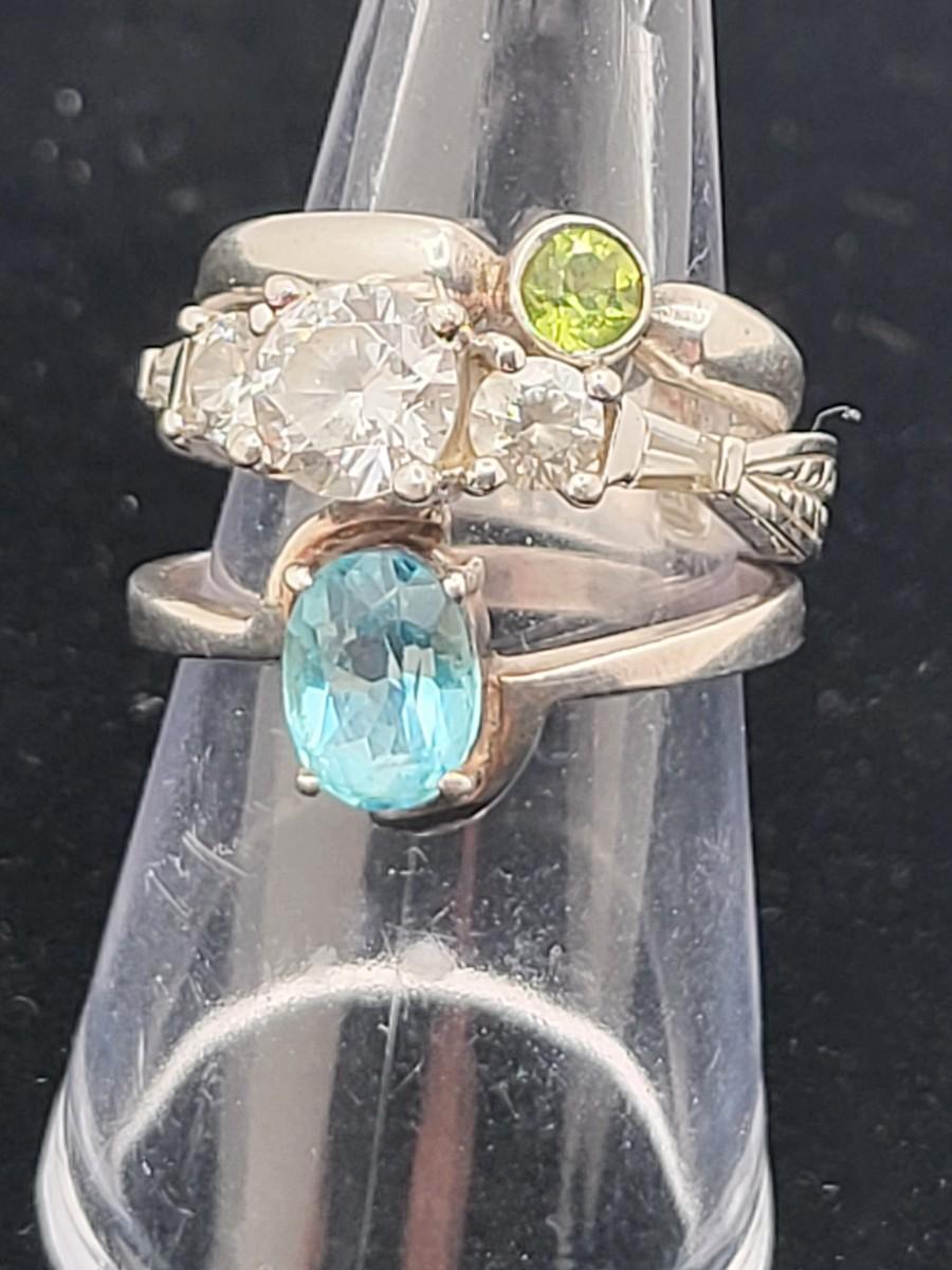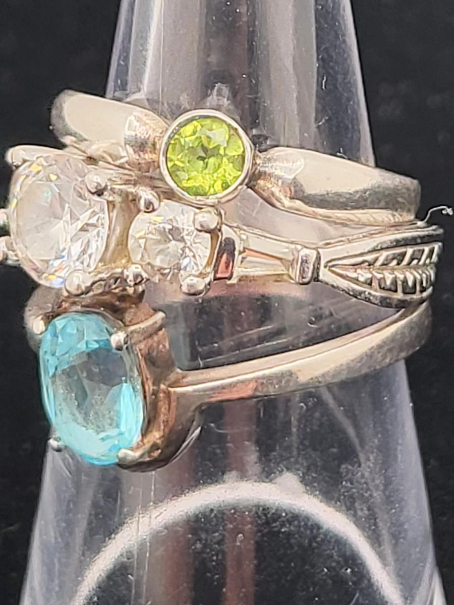 Trio of sterling silver rings: Vintage clear CZ size 7. Center round stone, two round side stones and two baguettes. Marked Korea JJJ. Light blue stone solitaire 925, size 9. Peridot green dainty ring size 6. Marked 925 SU. Total weight 7.8 grams.