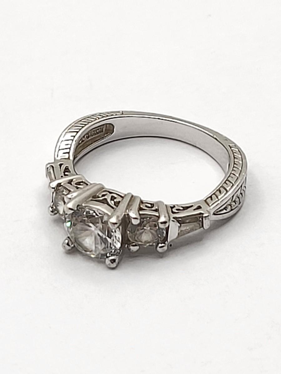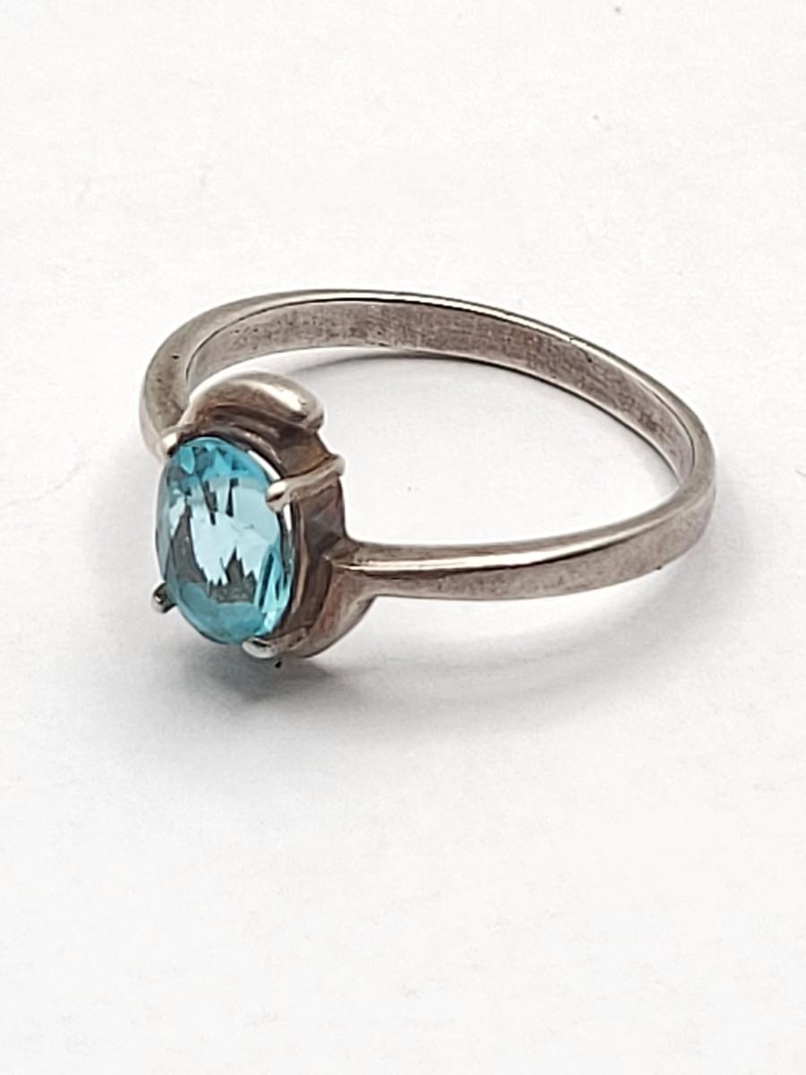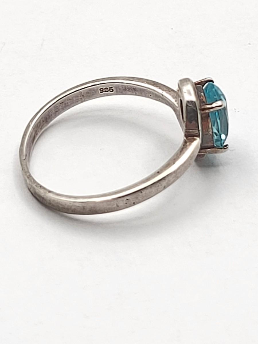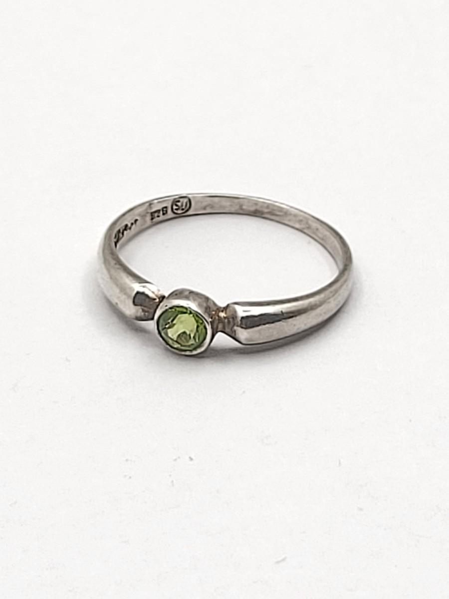 Trio of sterling silver rings: Vintage clear CZ size 7. Center round stone, two round side stones and two baguettes. Marked Korea JJJ. Light blue stone solitaire 925, size 9. Peridot green dainty ring size 6. Marked 925 SU. Total weight 7.8 grams.
