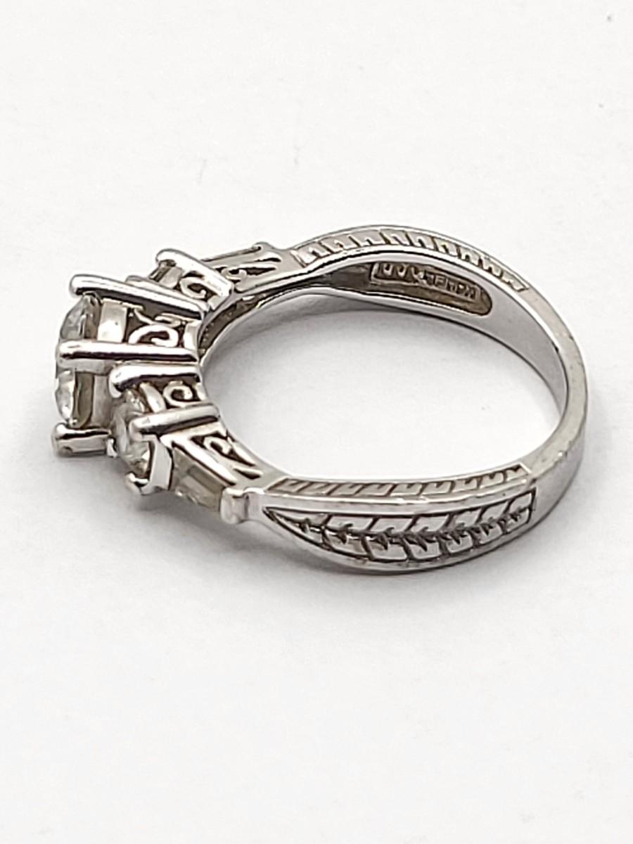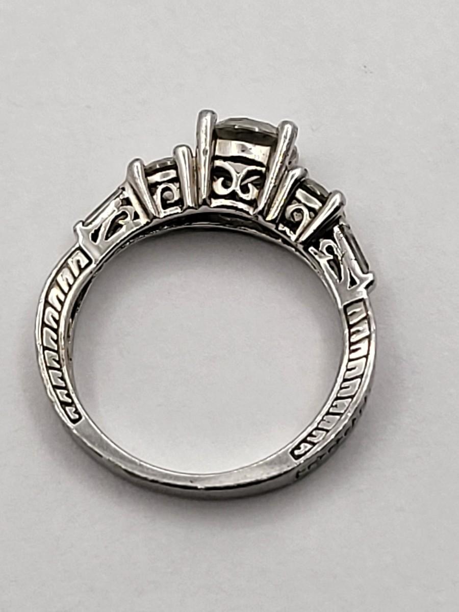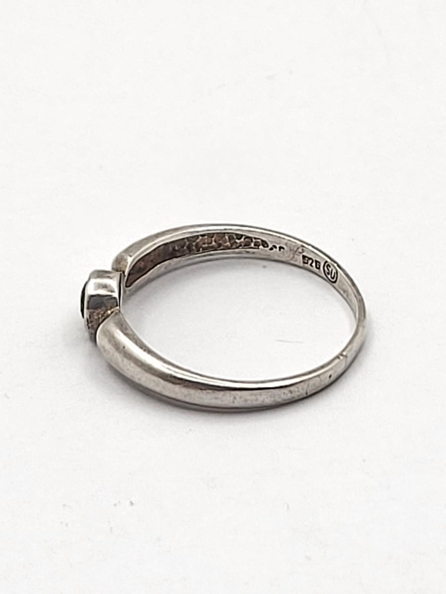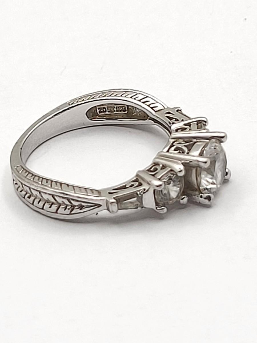 Trio of sterling silver rings: Vintage clear CZ size 7. Center round stone, two round side stones and two baguettes. Marked Korea JJJ. Light blue stone solitaire 925, size 9. Peridot green dainty ring size 6. Marked 925 SU. Total weight 7.8 grams.