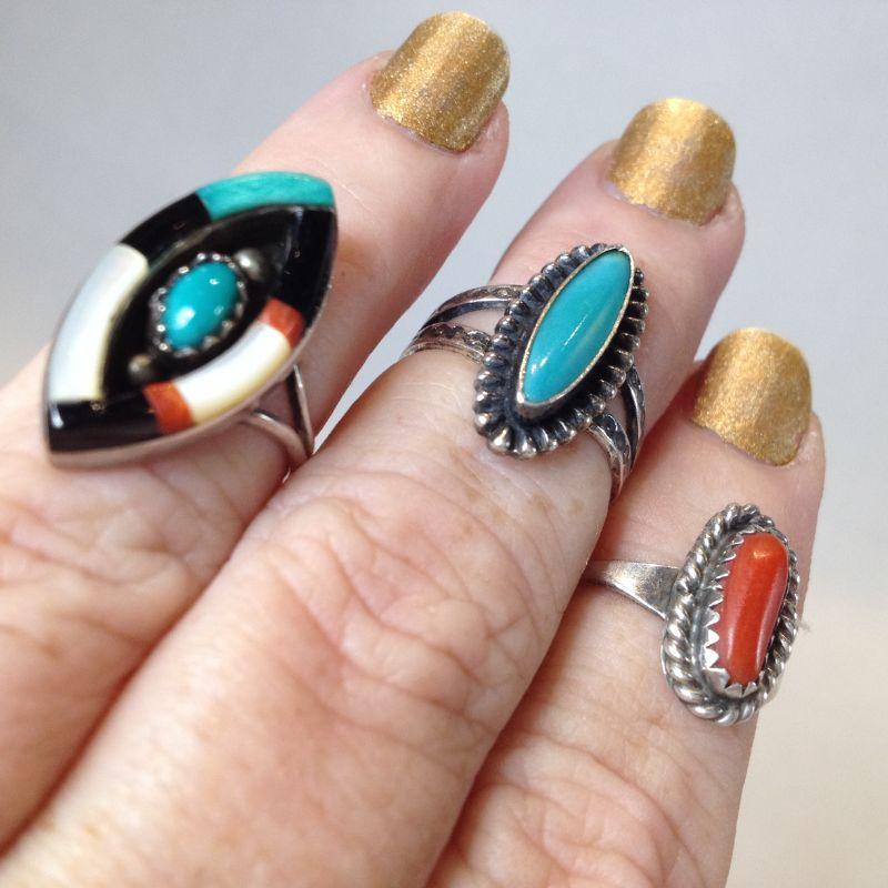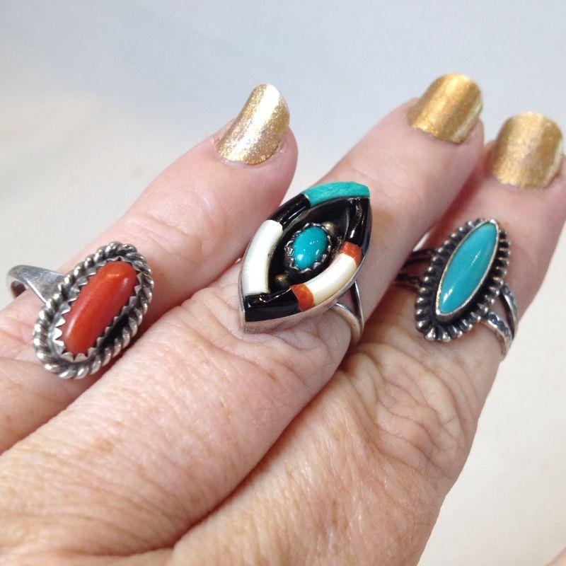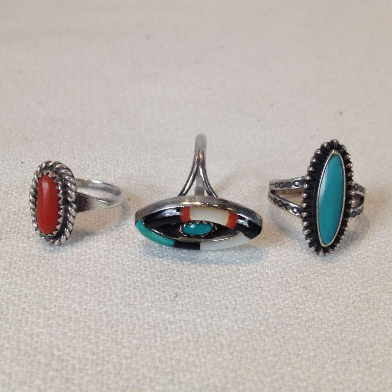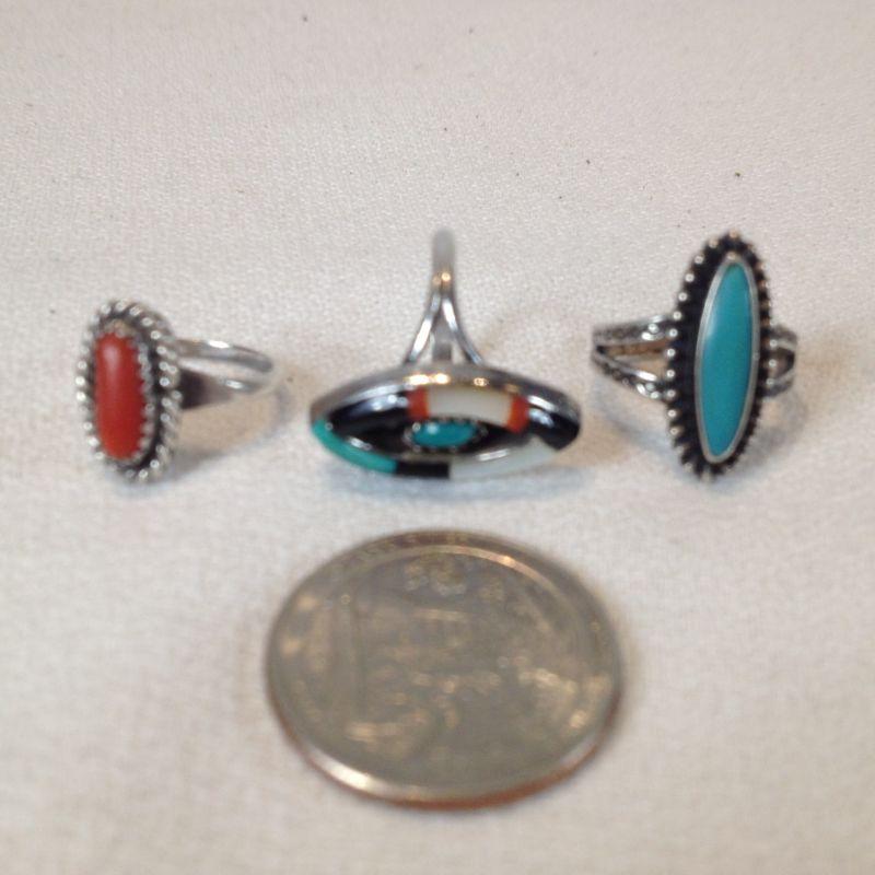This lot is a group of 3 unmarked sterling silver rings with semi-precious stones and/or glass. Very Lovely! They are small-sized. The coral one is a size 4.5, the multi-stone one is 4.25 and the turquoise one is a size 5. The starting bid is $12.00.