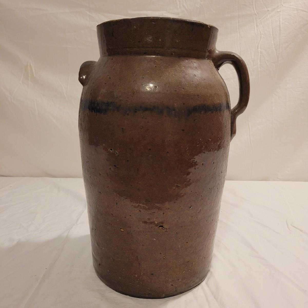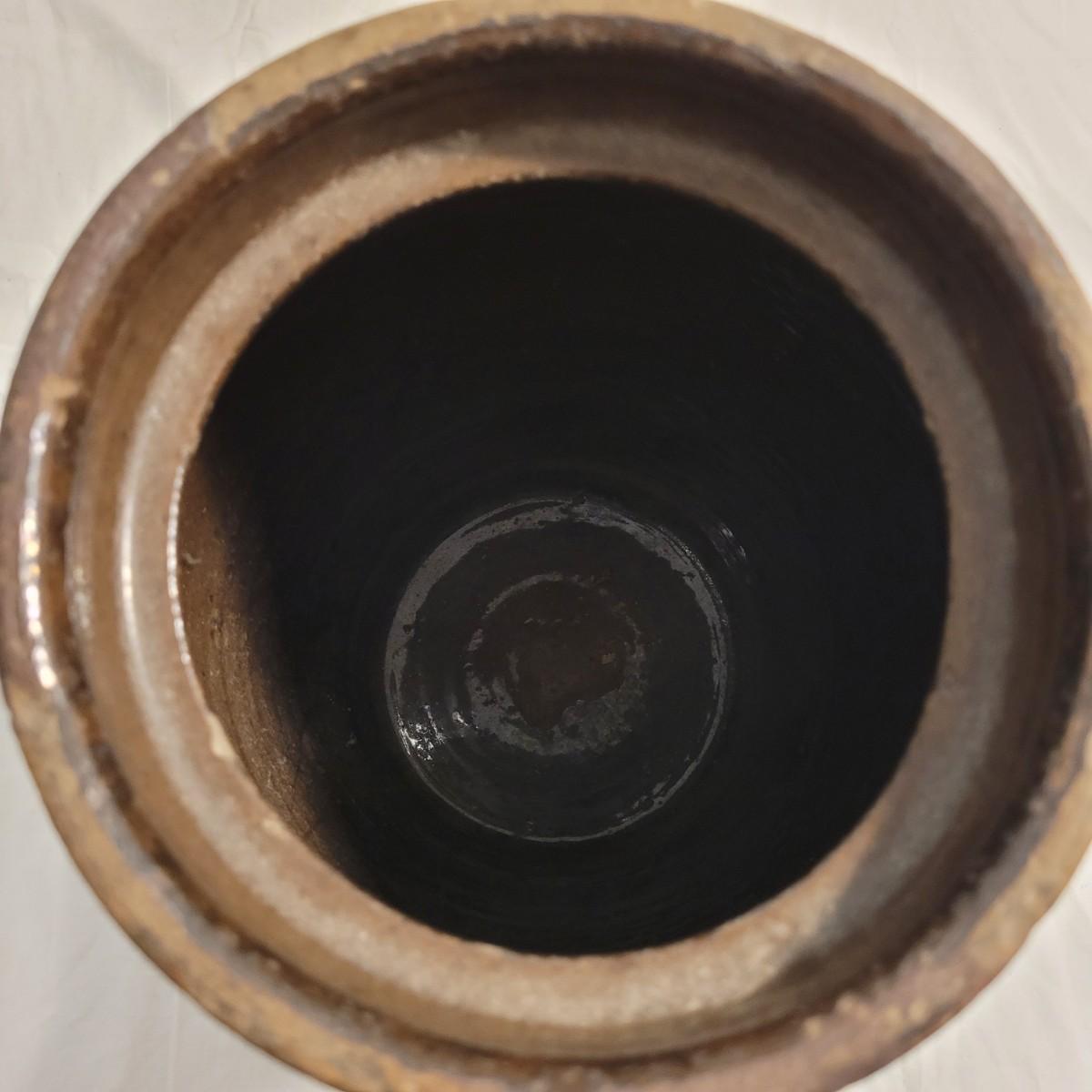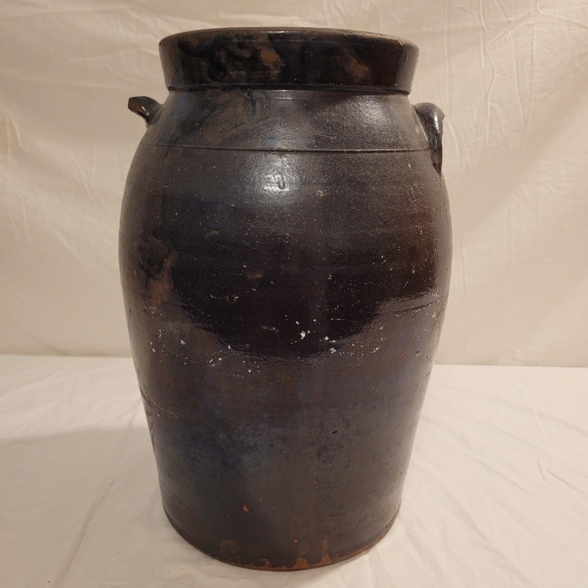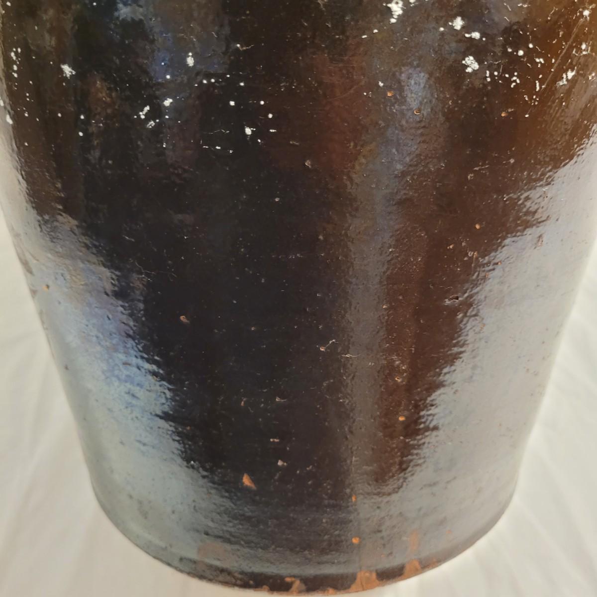 This lot includes three stoneware crocks that appear to be antique. They are of varying sizes but appear to be from two to four gallon vessels. The first and tallest crock features two half handles on the sides. It is glazed in brown and measures 10" x 10" x 18"H. It has a crack near the rim and does not have a lid. The second crock is shorter and glazed in black. It is a butter churn with broken handle and includes its wooden lid. The last and smallest crock is also a butter churn, glazed in brown and black and includes its wooden lid. All have a unique glaze that resembles raku.