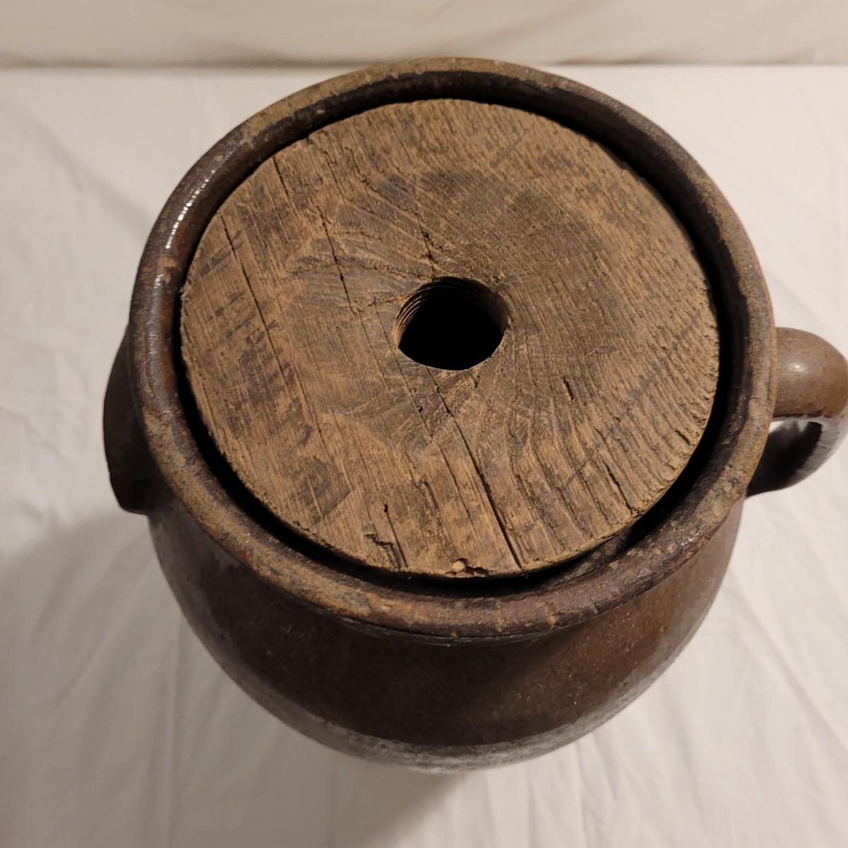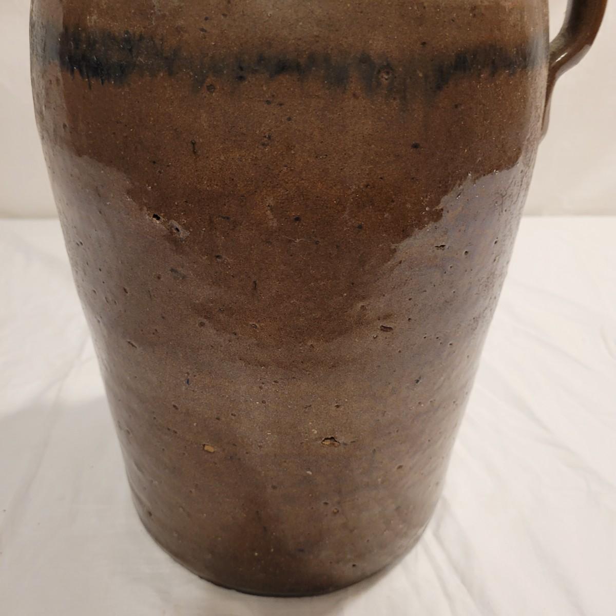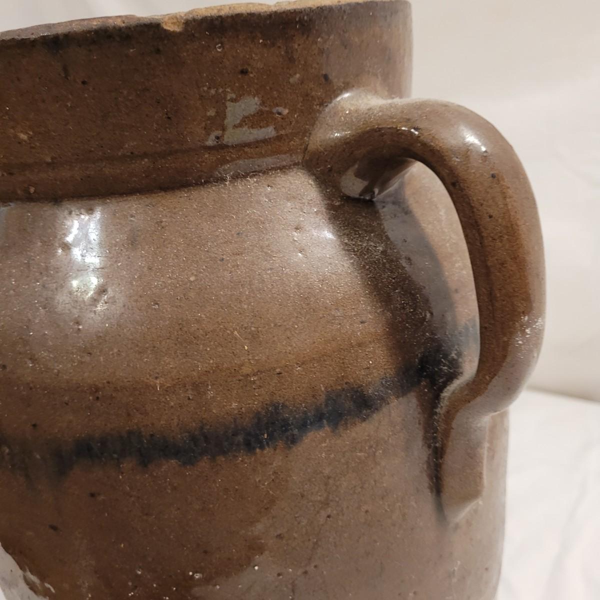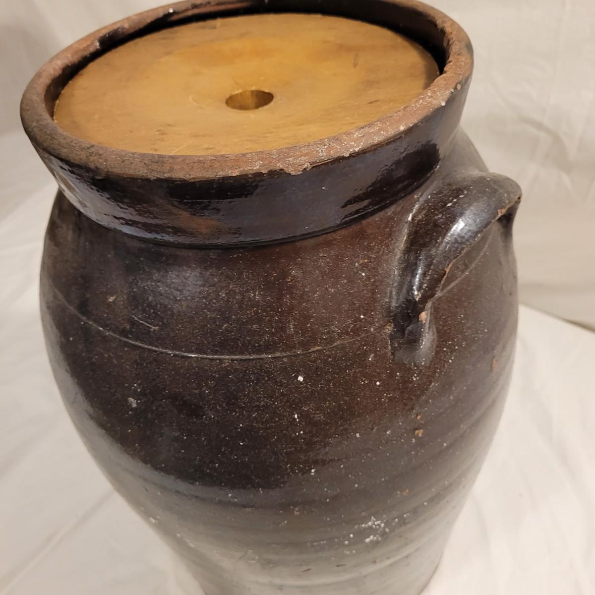 This lot includes three stoneware crocks that appear to be antique. They are of varying sizes but appear to be from two to four gallon vessels. The first and tallest crock features two half handles on the sides. It is glazed in brown and measures 10" x 10" x 18"H. It has a crack near the rim and does not have a lid. The second crock is shorter and glazed in black. It is a butter churn with broken handle and includes its wooden lid. The last and smallest crock is also a butter churn, glazed in brown and black and includes its wooden lid. All have a unique glaze that resembles raku.