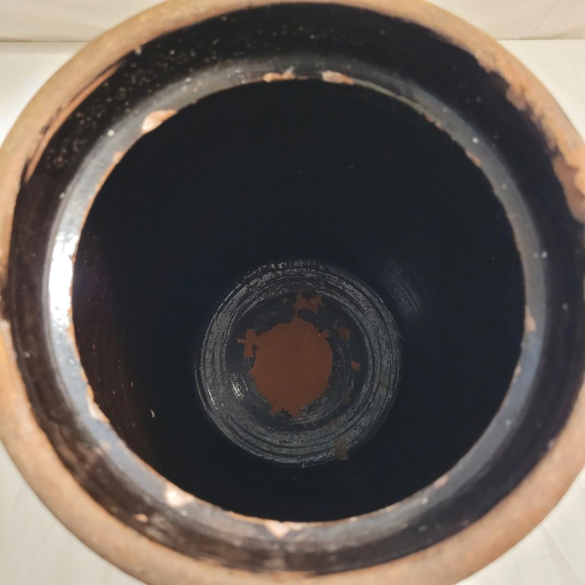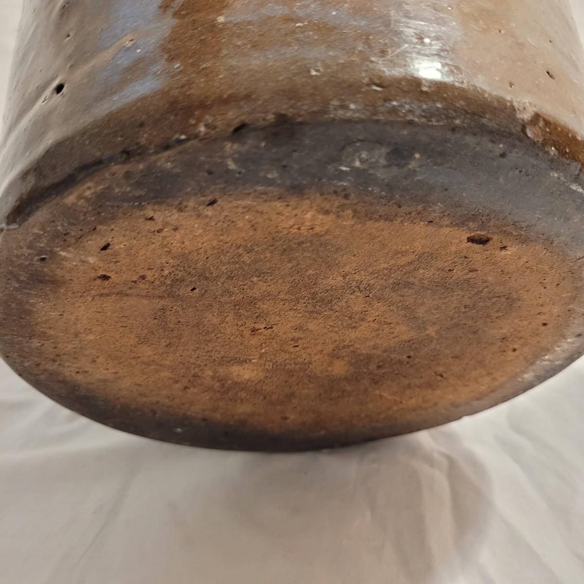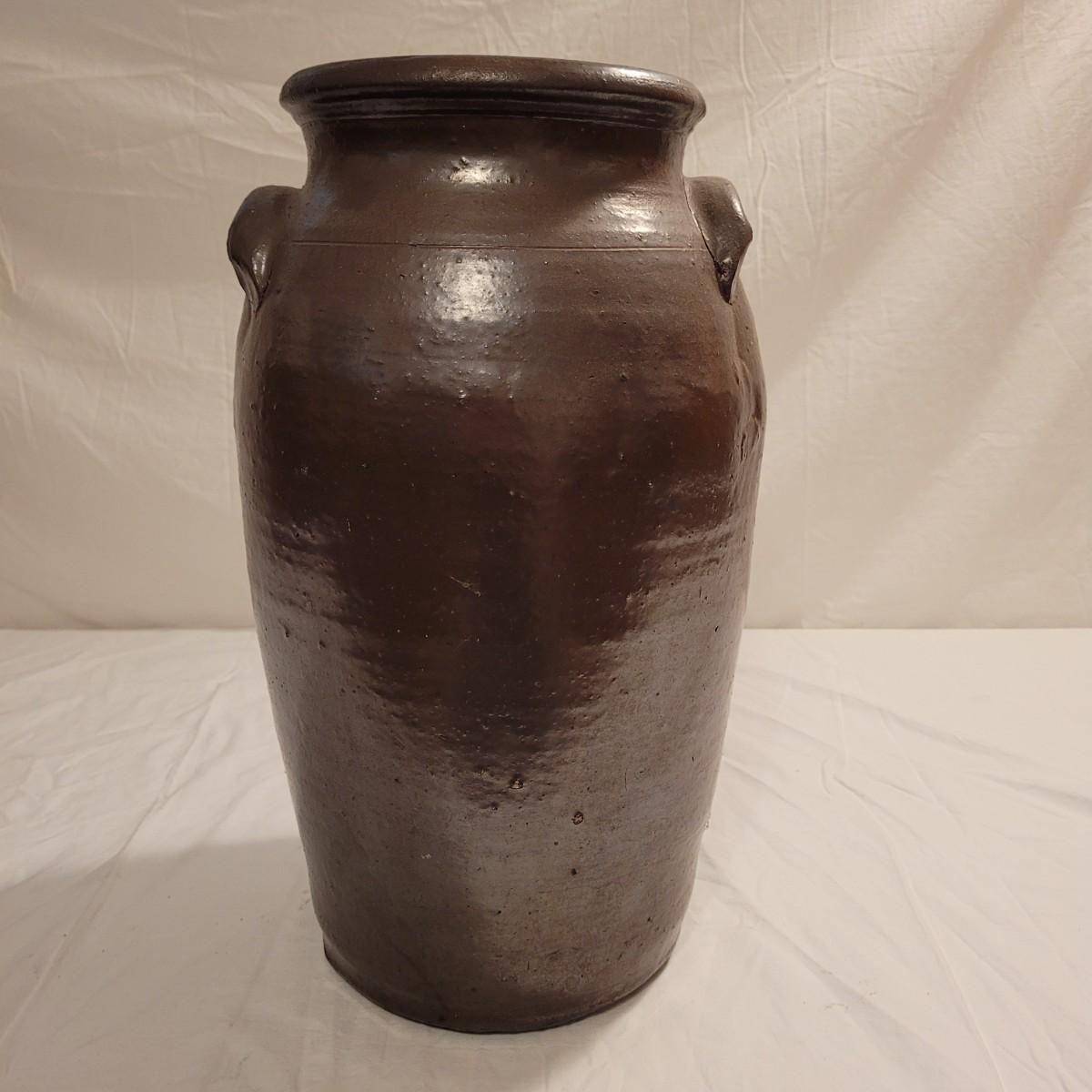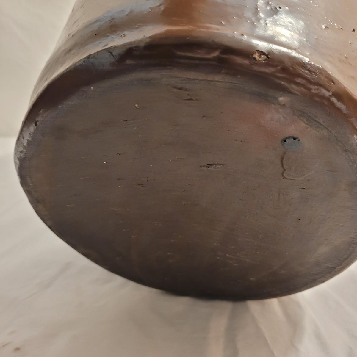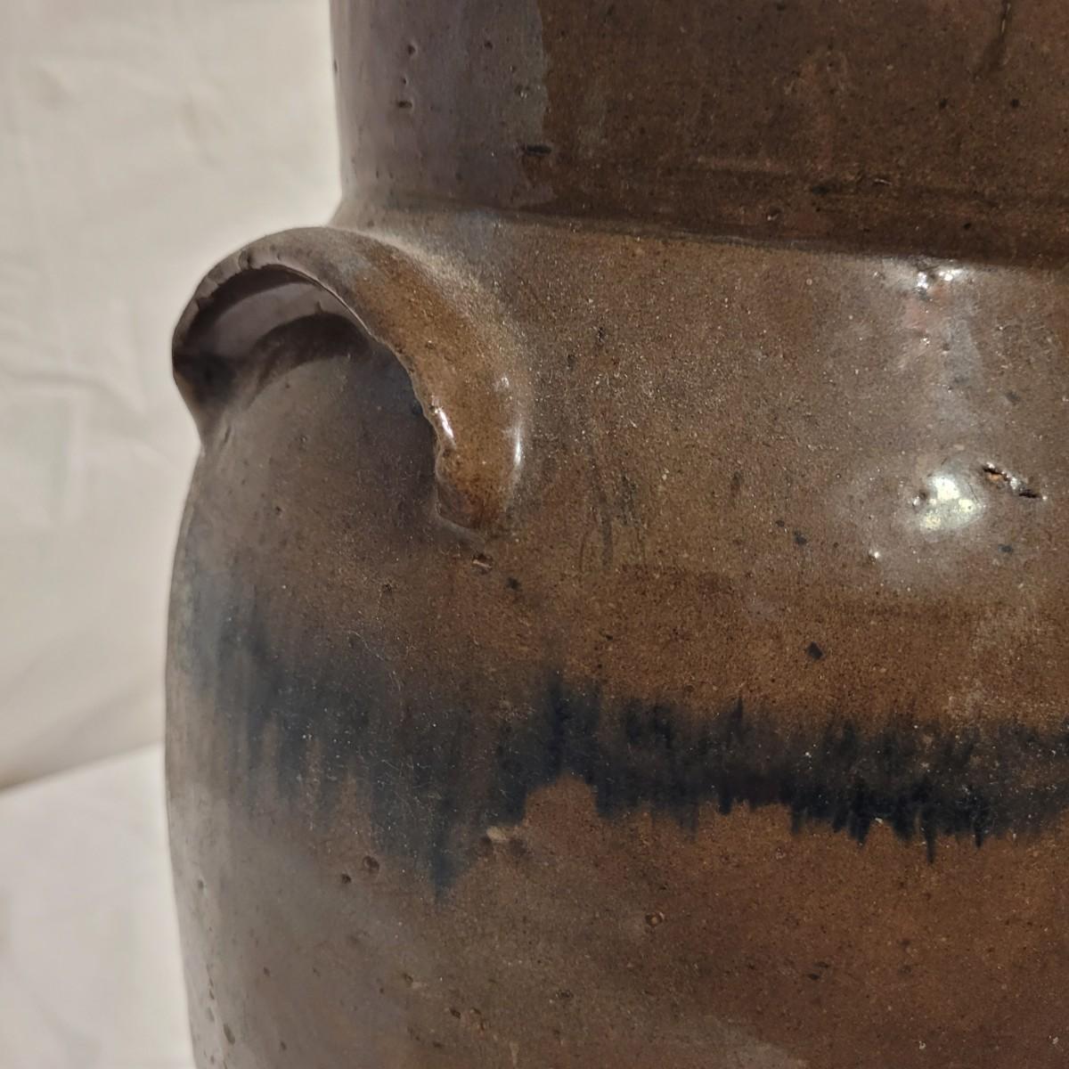 This lot includes three stoneware crocks that appear to be antique. They are of varying sizes but appear to be from two to four gallon vessels. The first and tallest crock features two half handles on the sides. It is glazed in brown and measures 10" x 10" x 18"H. It has a crack near the rim and does not have a lid. The second crock is shorter and glazed in black. It is a butter churn with broken handle and includes its wooden lid. The last and smallest crock is also a butter churn, glazed in brown and black and includes its wooden lid. All have a unique glaze that resembles raku.