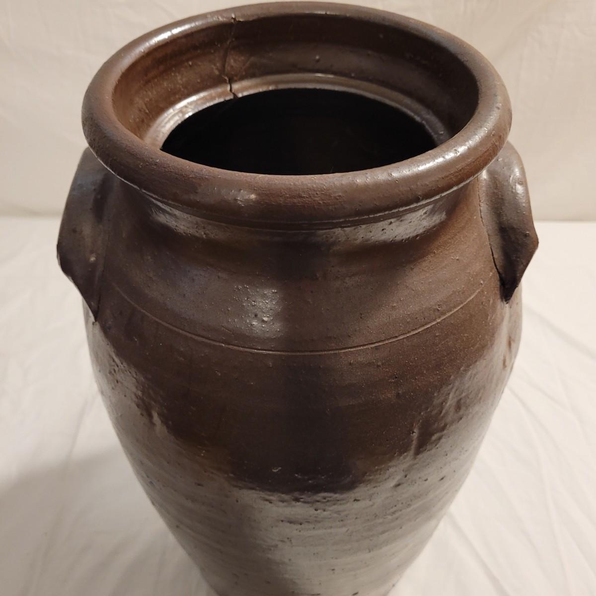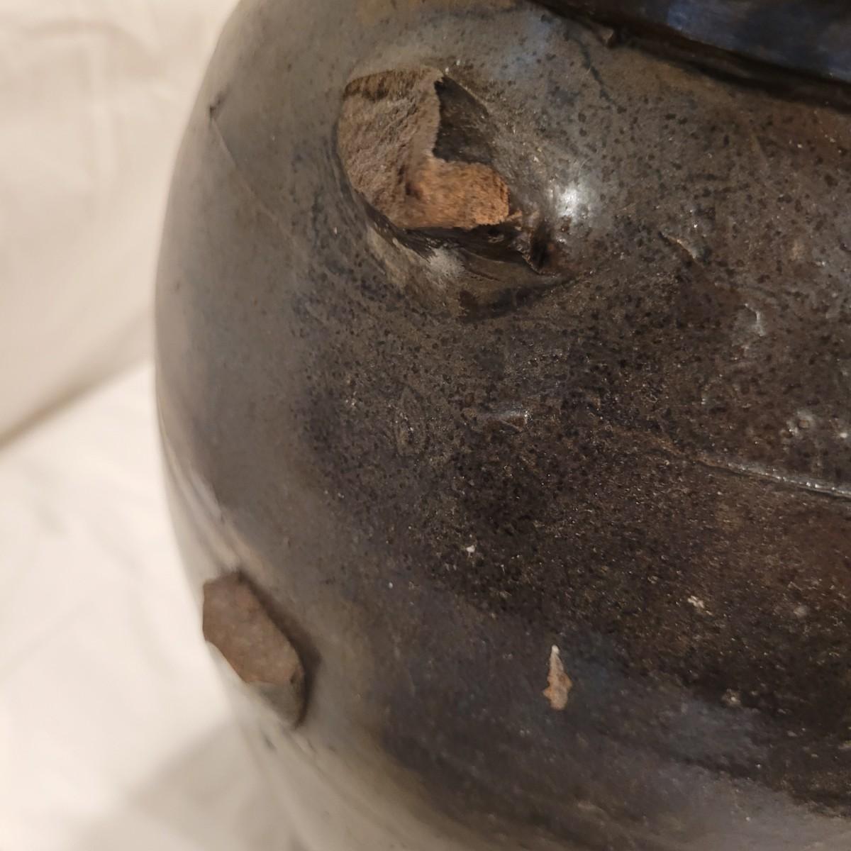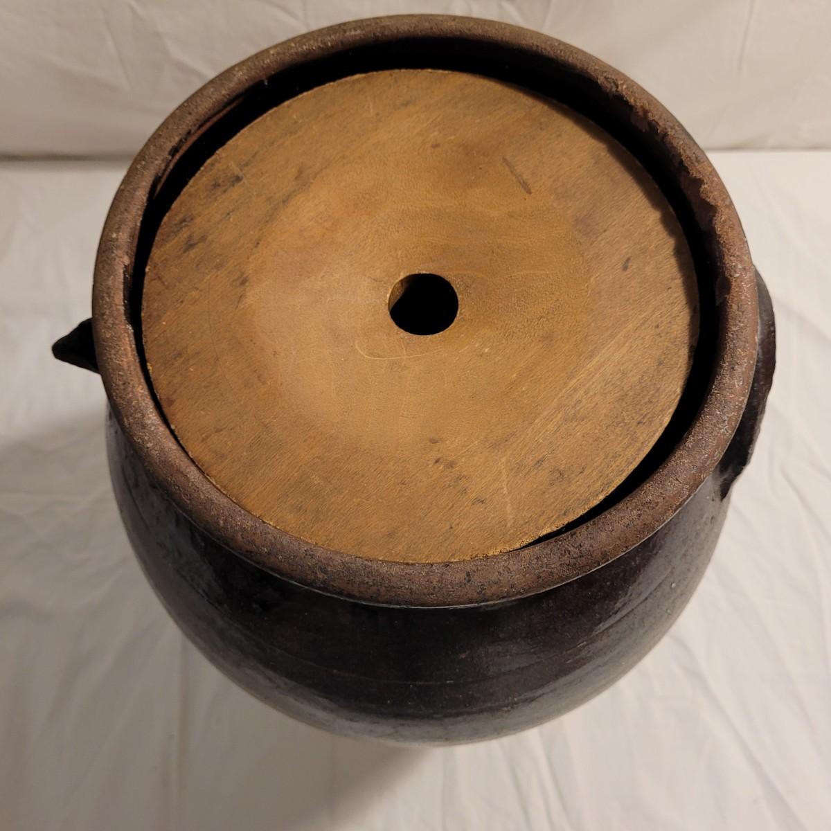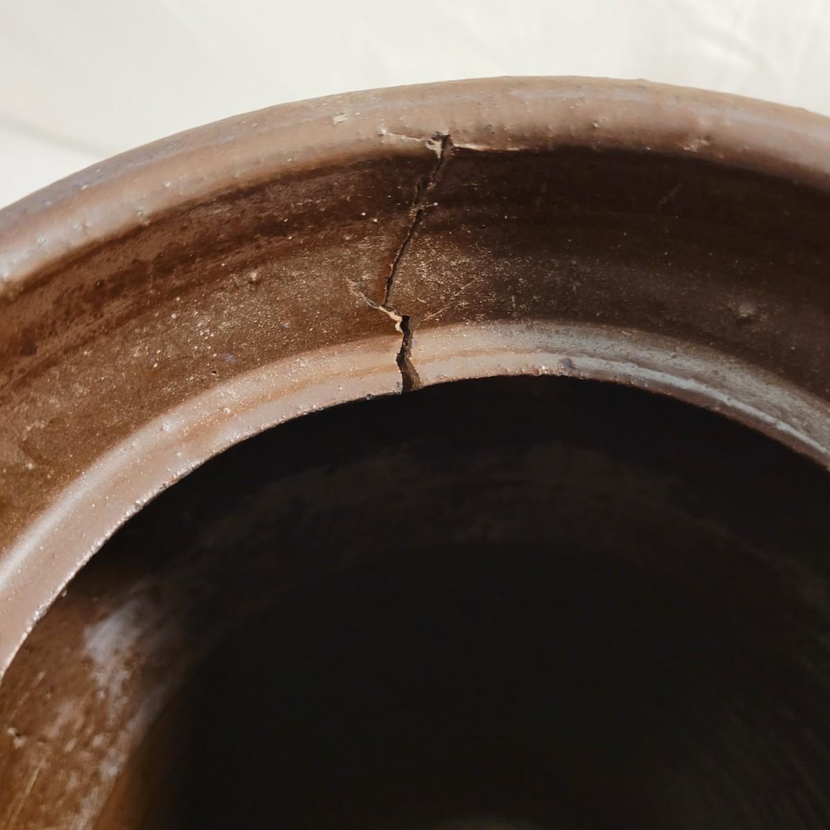 This lot includes three stoneware crocks that appear to be antique. They are of varying sizes but appear to be from two to four gallon vessels. The first and tallest crock features two half handles on the sides. It is glazed in brown and measures 10" x 10" x 18"H. It has a crack near the rim and does not have a lid. The second crock is shorter and glazed in black. It is a butter churn with broken handle and includes its wooden lid. The last and smallest crock is also a butter churn, glazed in brown and black and includes its wooden lid. All have a unique glaze that resembles raku.