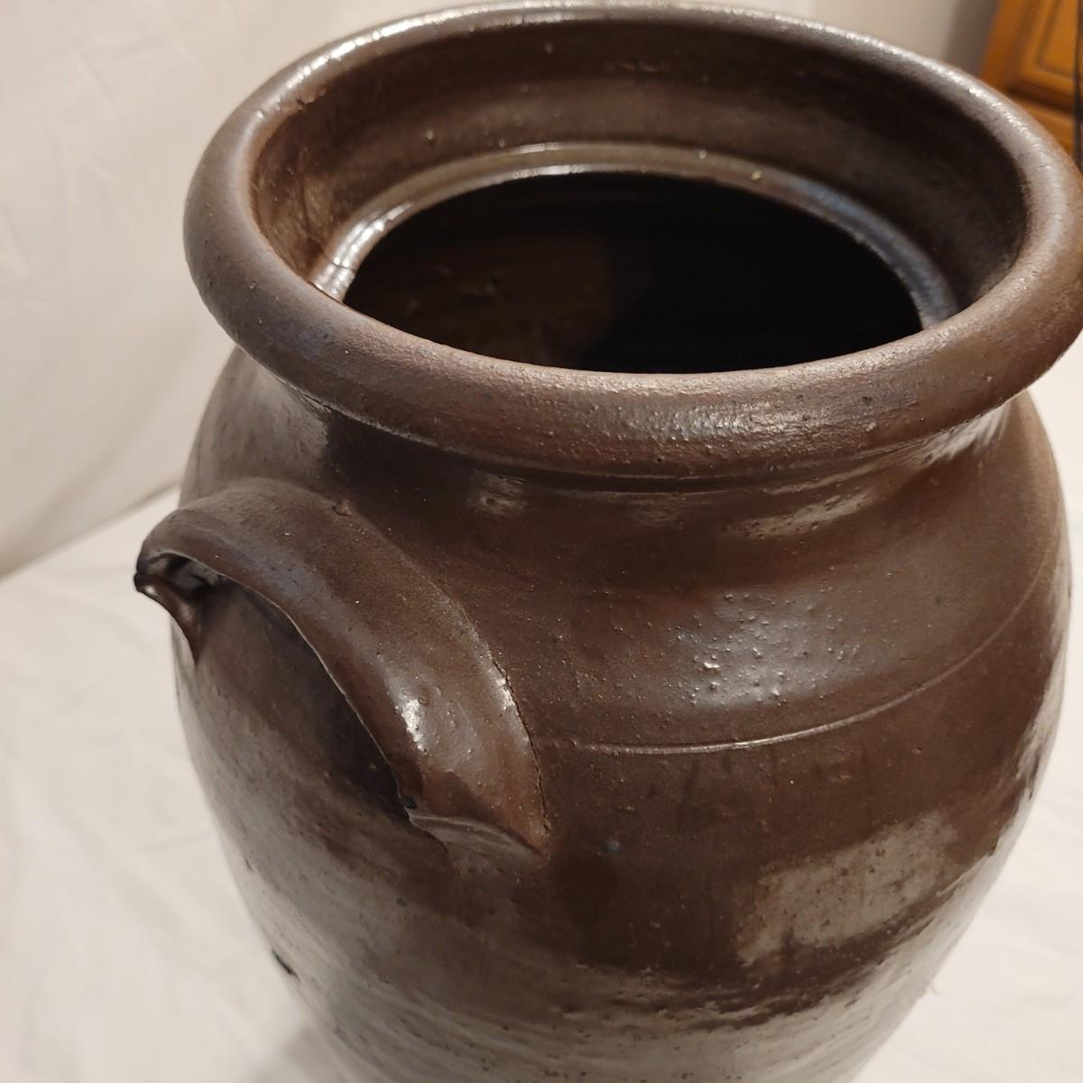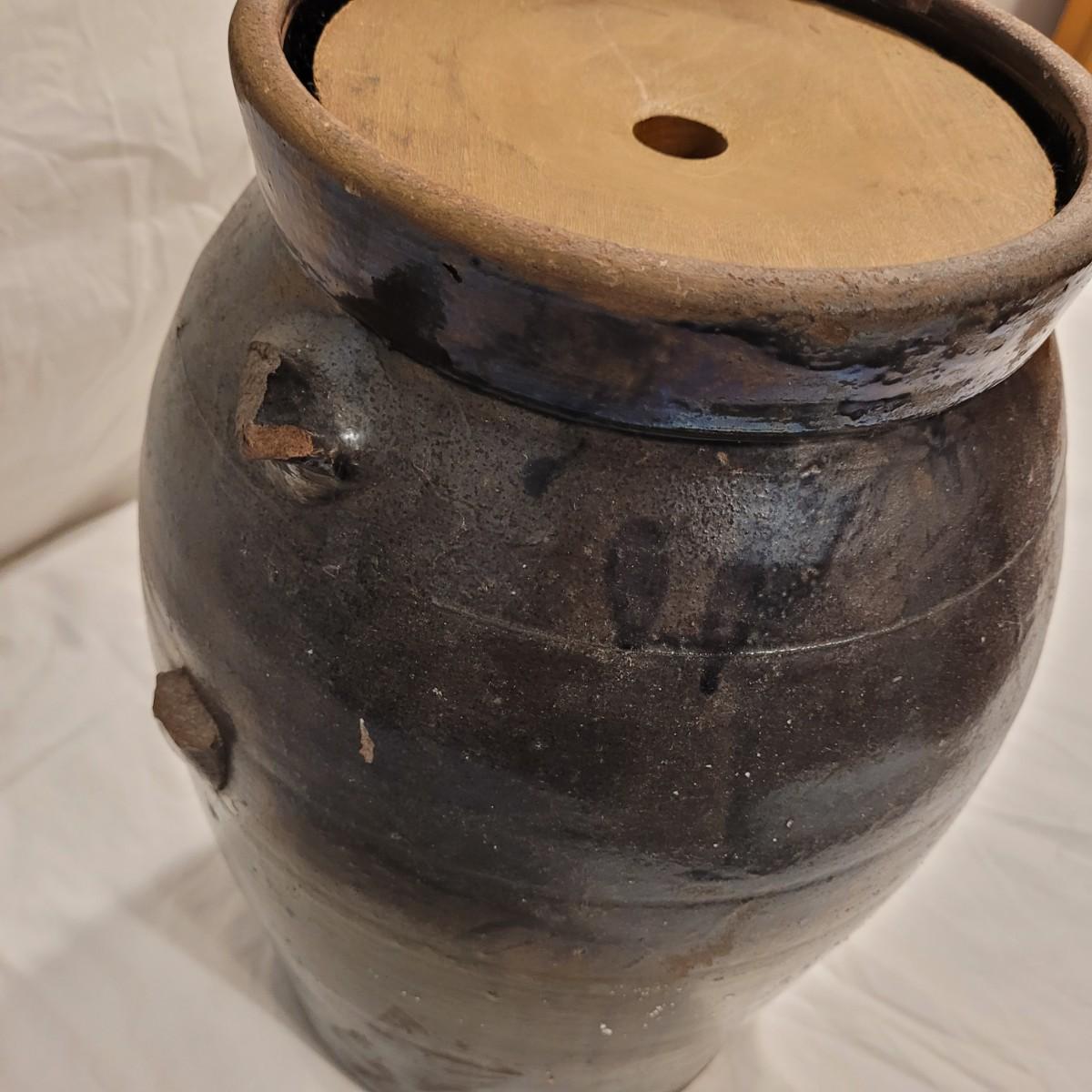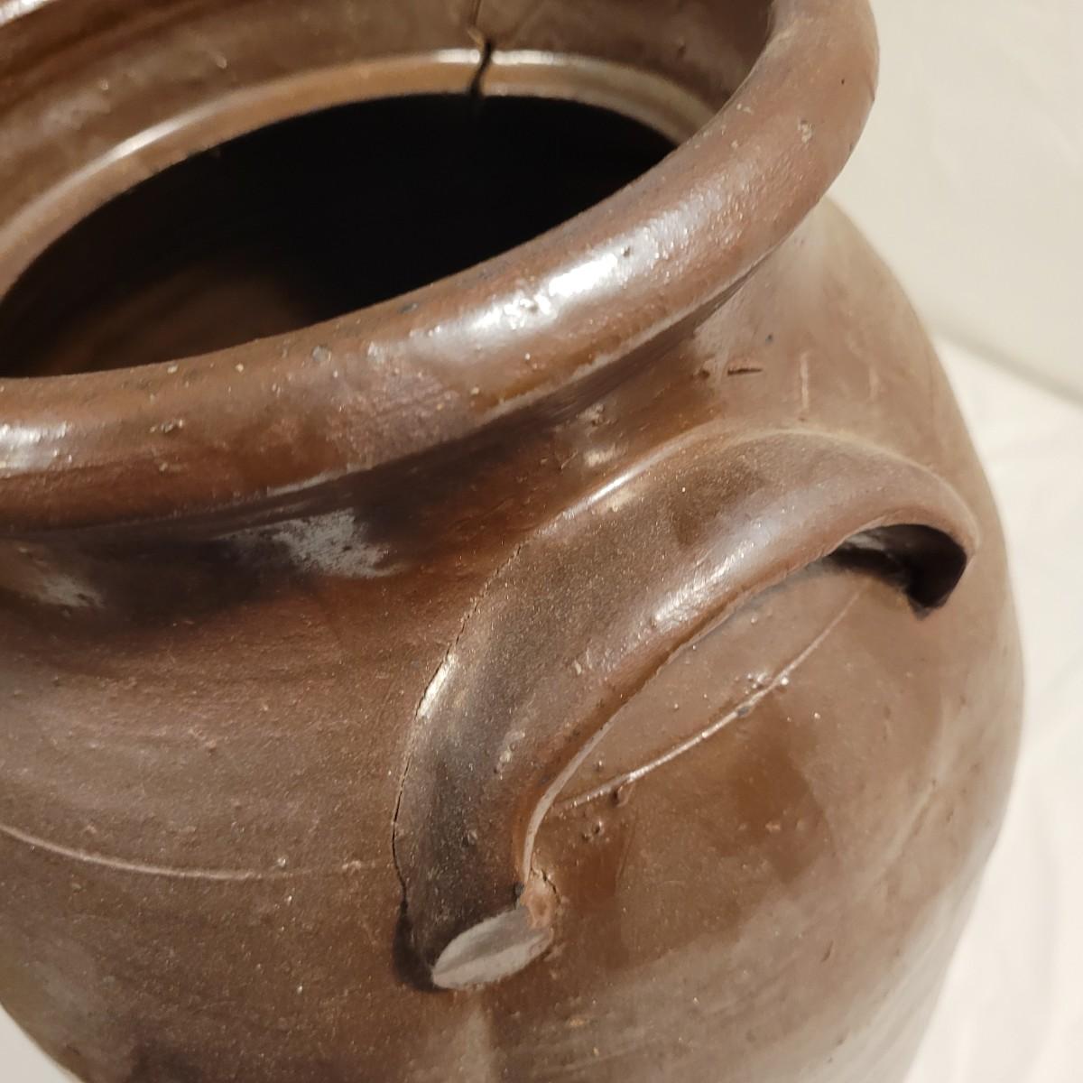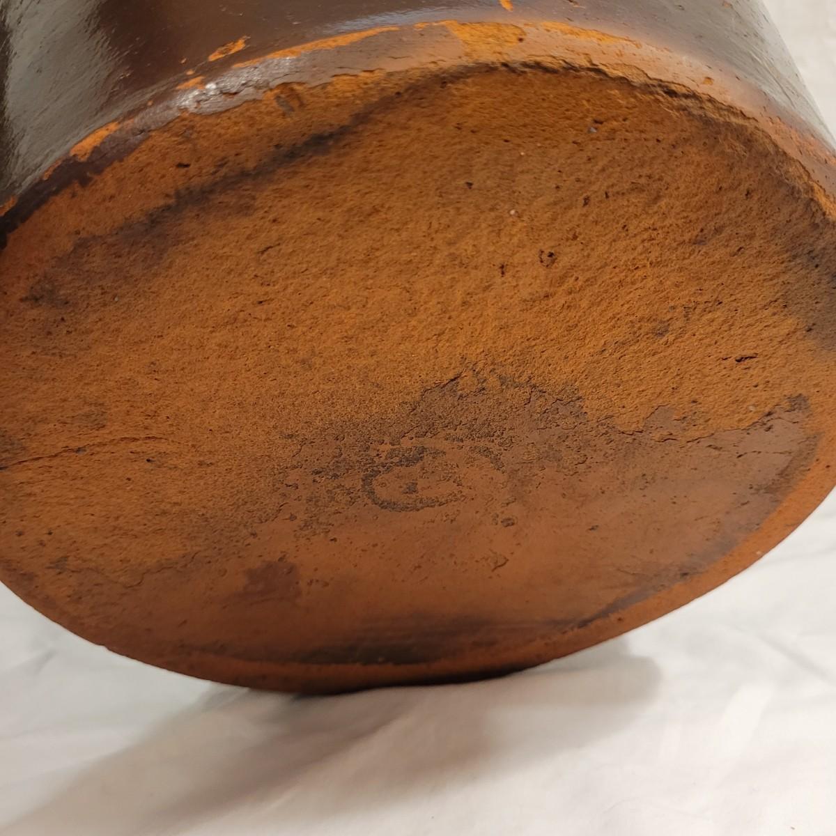 This lot includes three stoneware crocks that appear to be antique. They are of varying sizes but appear to be from two to four gallon vessels. The first and tallest crock features two half handles on the sides. It is glazed in brown and measures 10" x 10" x 18"H. It has a crack near the rim and does not have a lid. The second crock is shorter and glazed in black. It is a butter churn with broken handle and includes its wooden lid. The last and smallest crock is also a butter churn, glazed in brown and black and includes its wooden lid. All have a unique glaze that resembles raku.