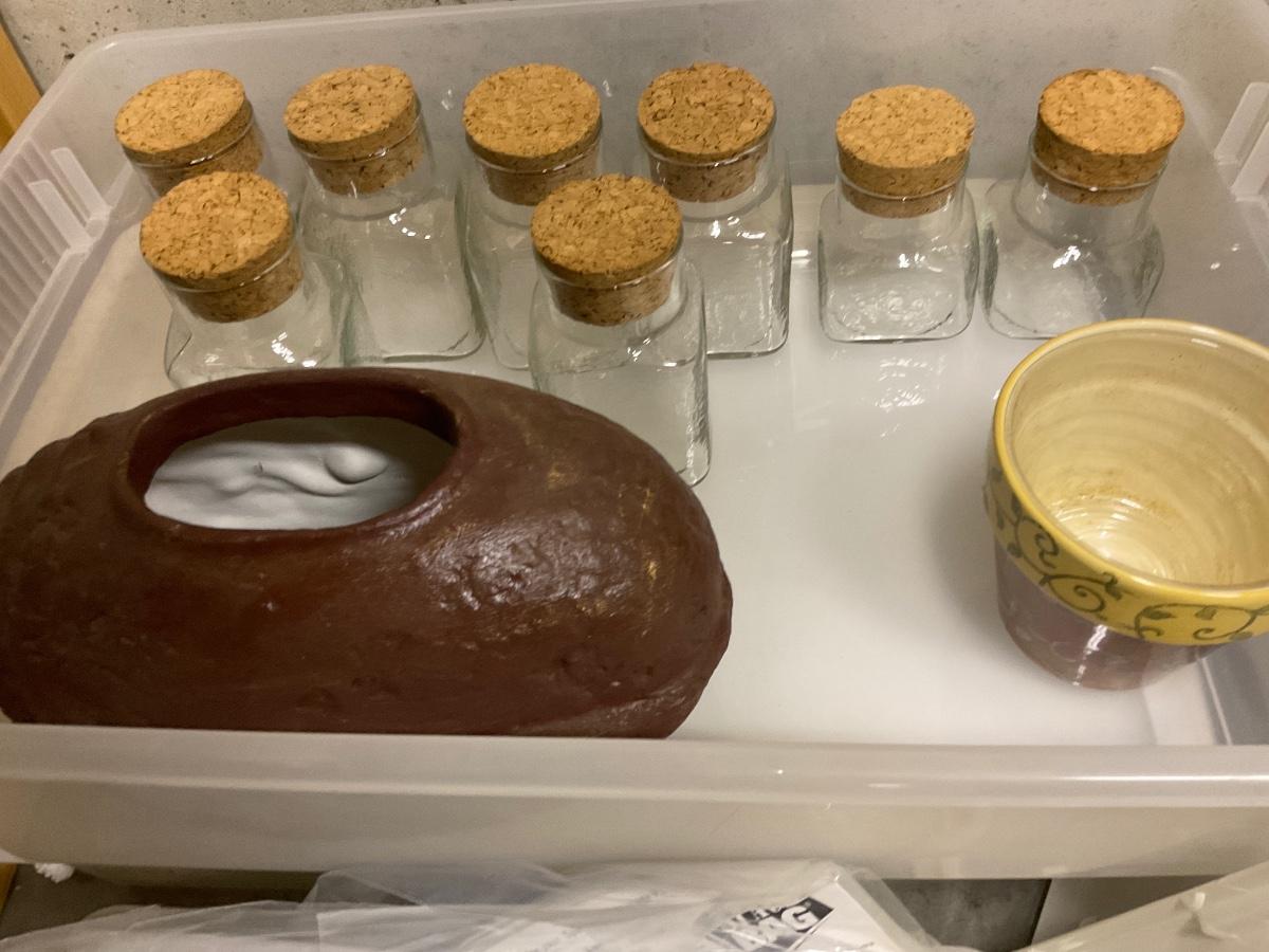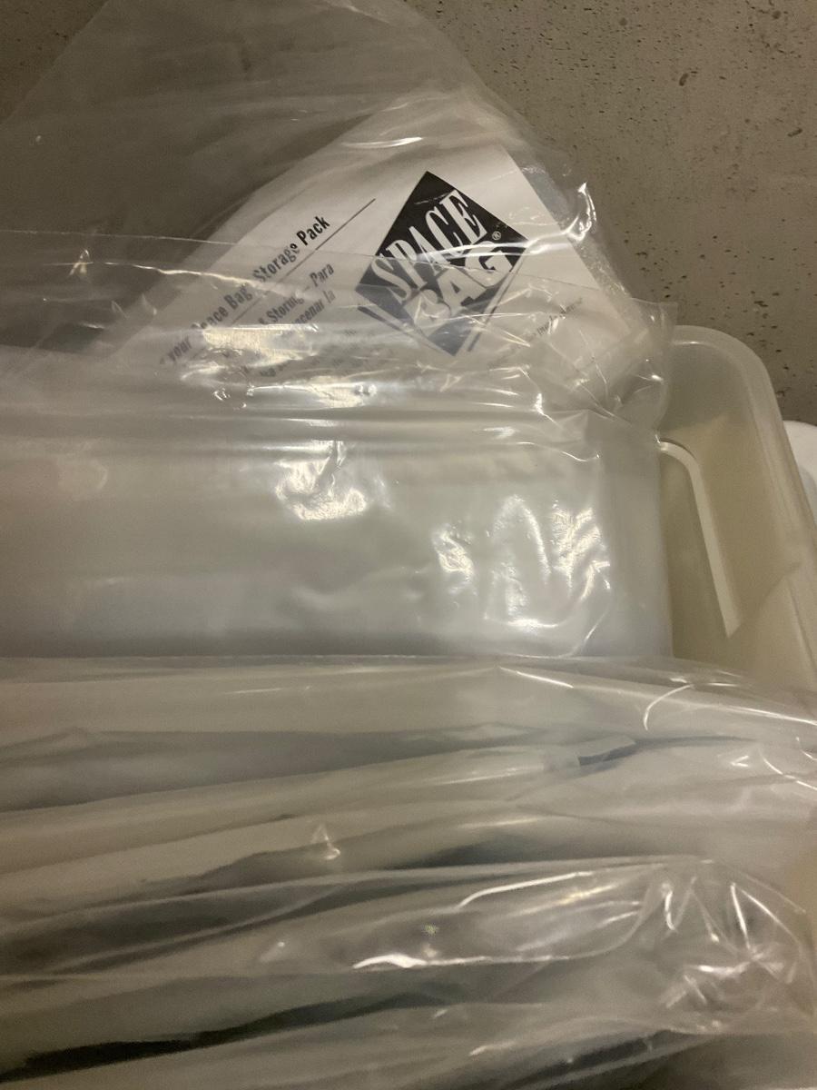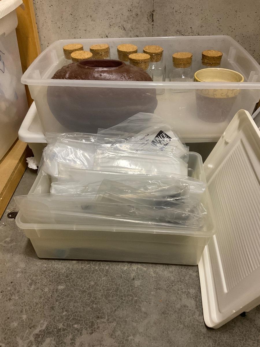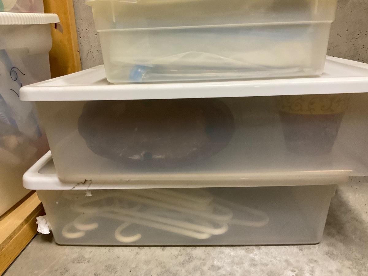 Three Storage Totes With Storage Jars, Hangers And Space Bags.
