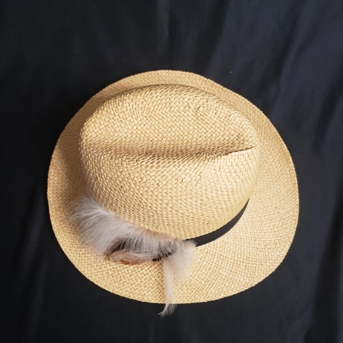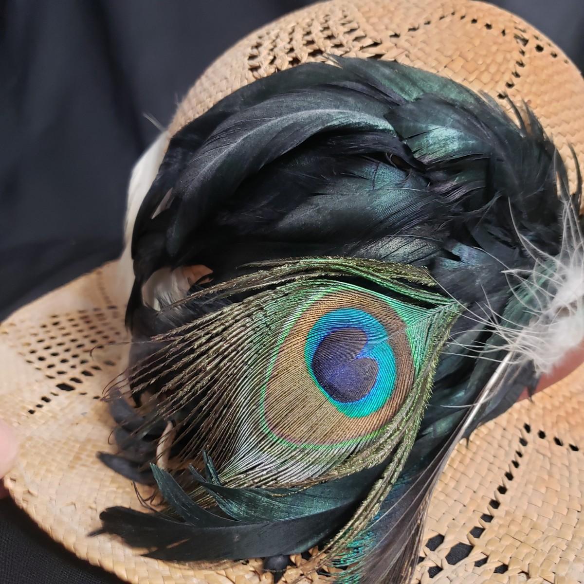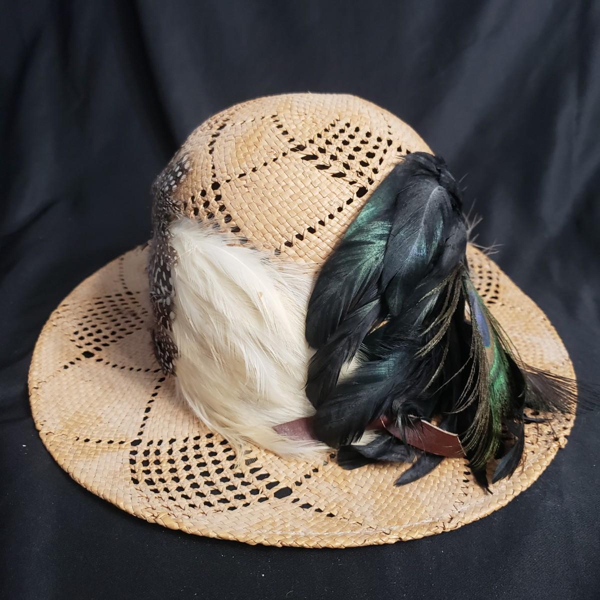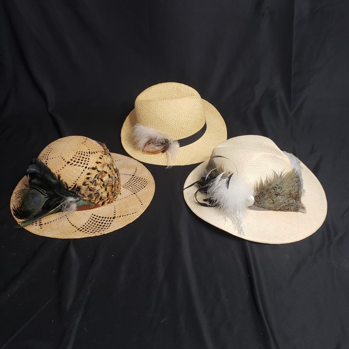 This three piece hat lot features straw hats with ornate feather arrangements. The first hat measures 13" x 11" x 5"H. The inside measurements are pictured. Someone try spend time 9n these feather arrangements! See pictures for details. The darker straw hat has a blemish on the top, where a piece of straw has come undone.