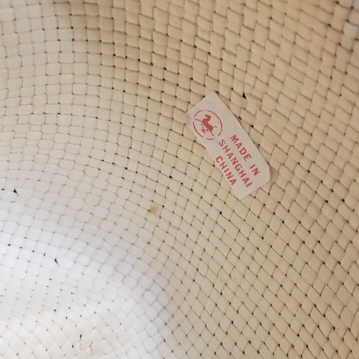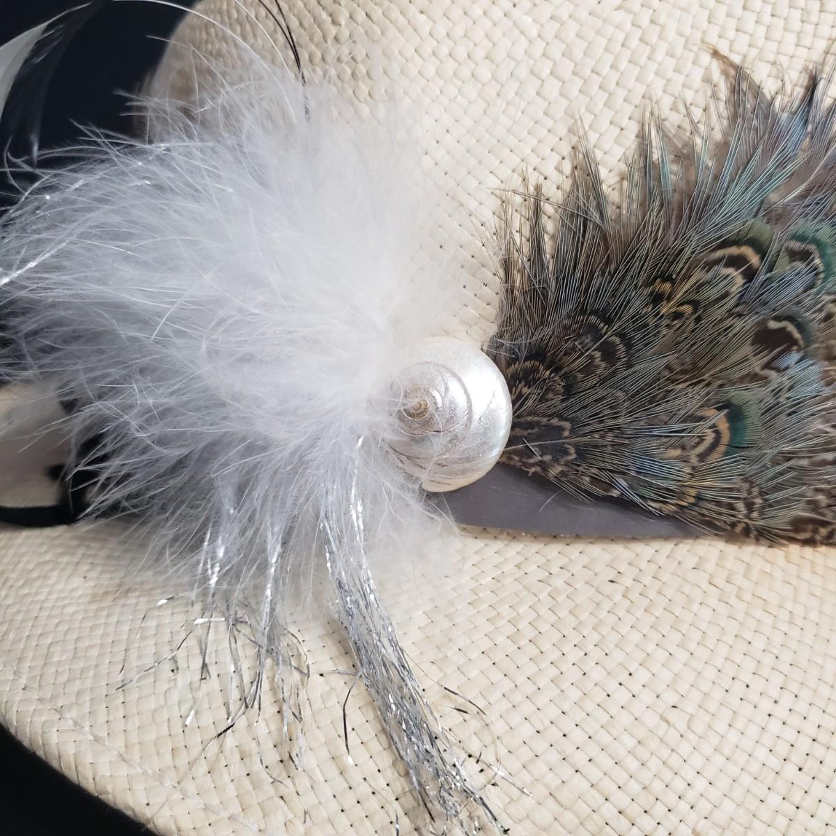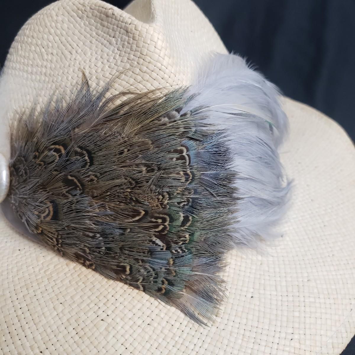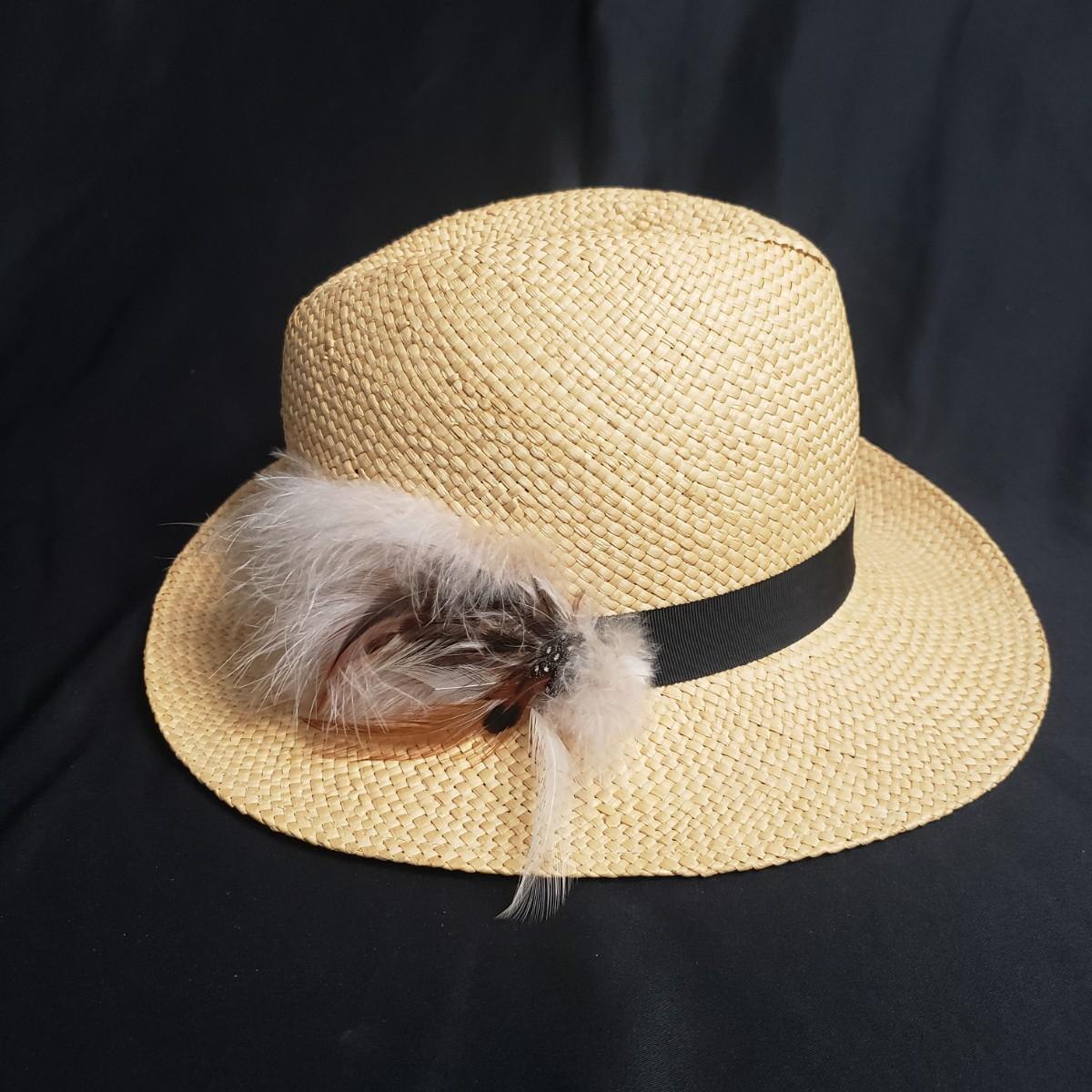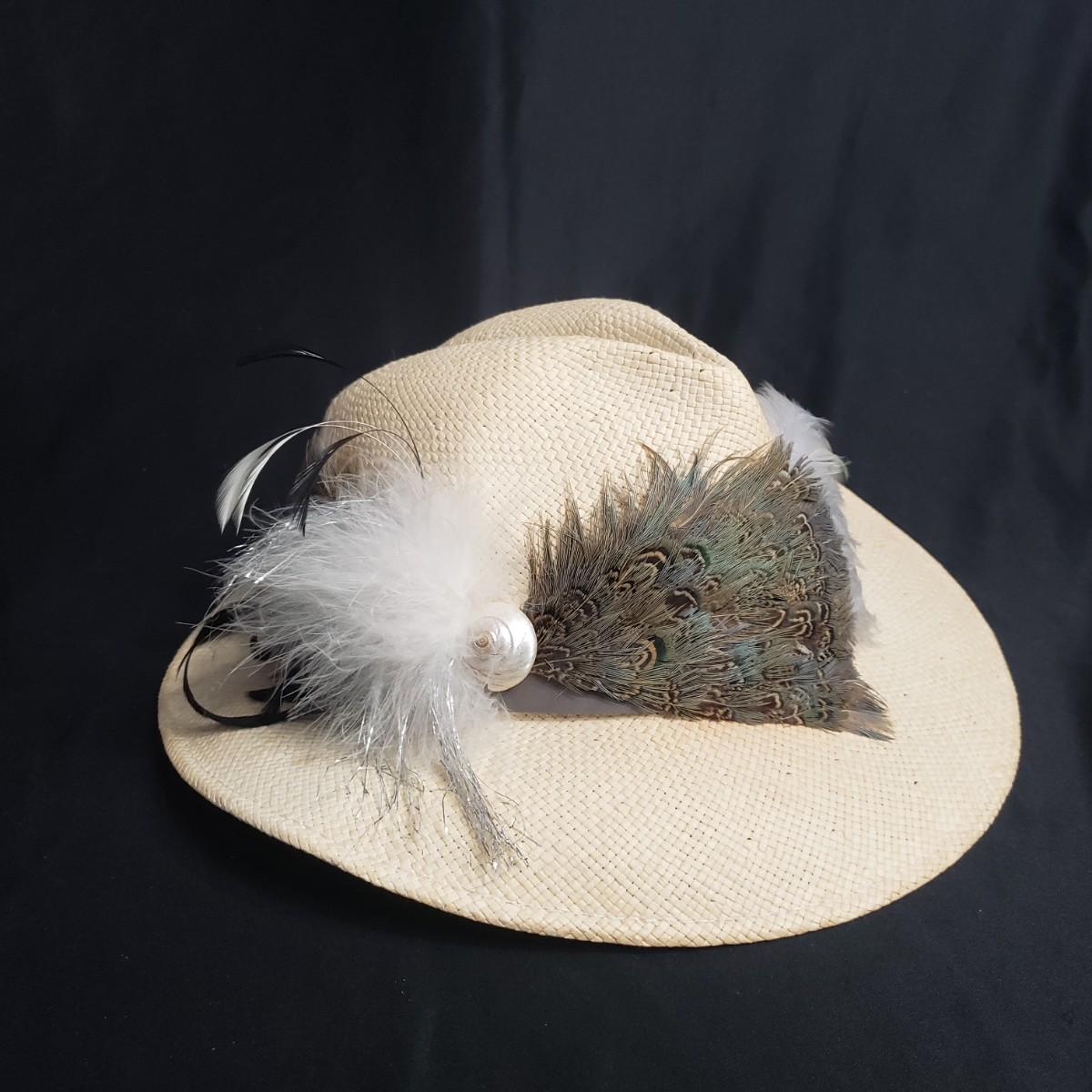 This three piece hat lot features straw hats with ornate feather arrangements. The first hat measures 13" x 11" x 5"H. The inside measurements are pictured. Someone try spend time 9n these feather arrangements! See pictures for details. The darker straw hat has a blemish on the top, where a piece of straw has come undone.