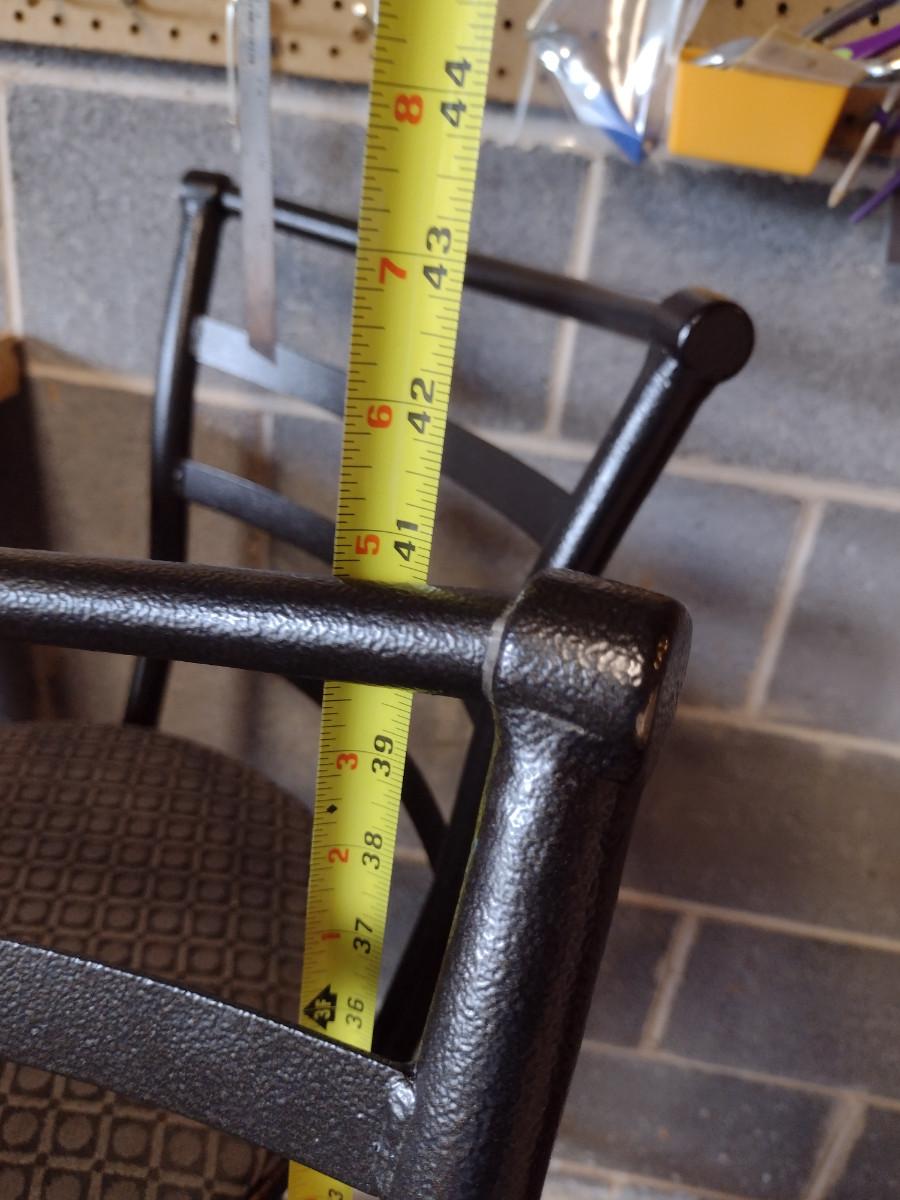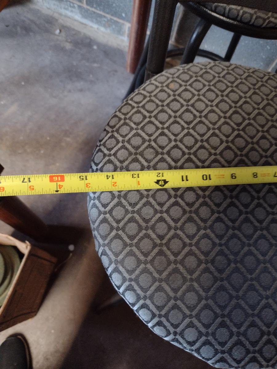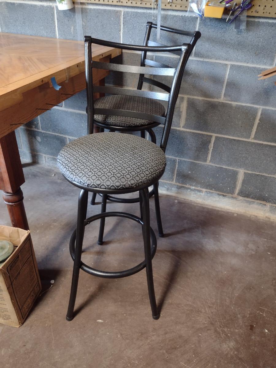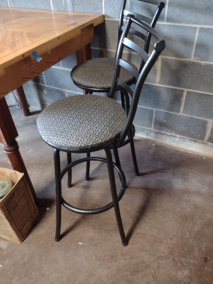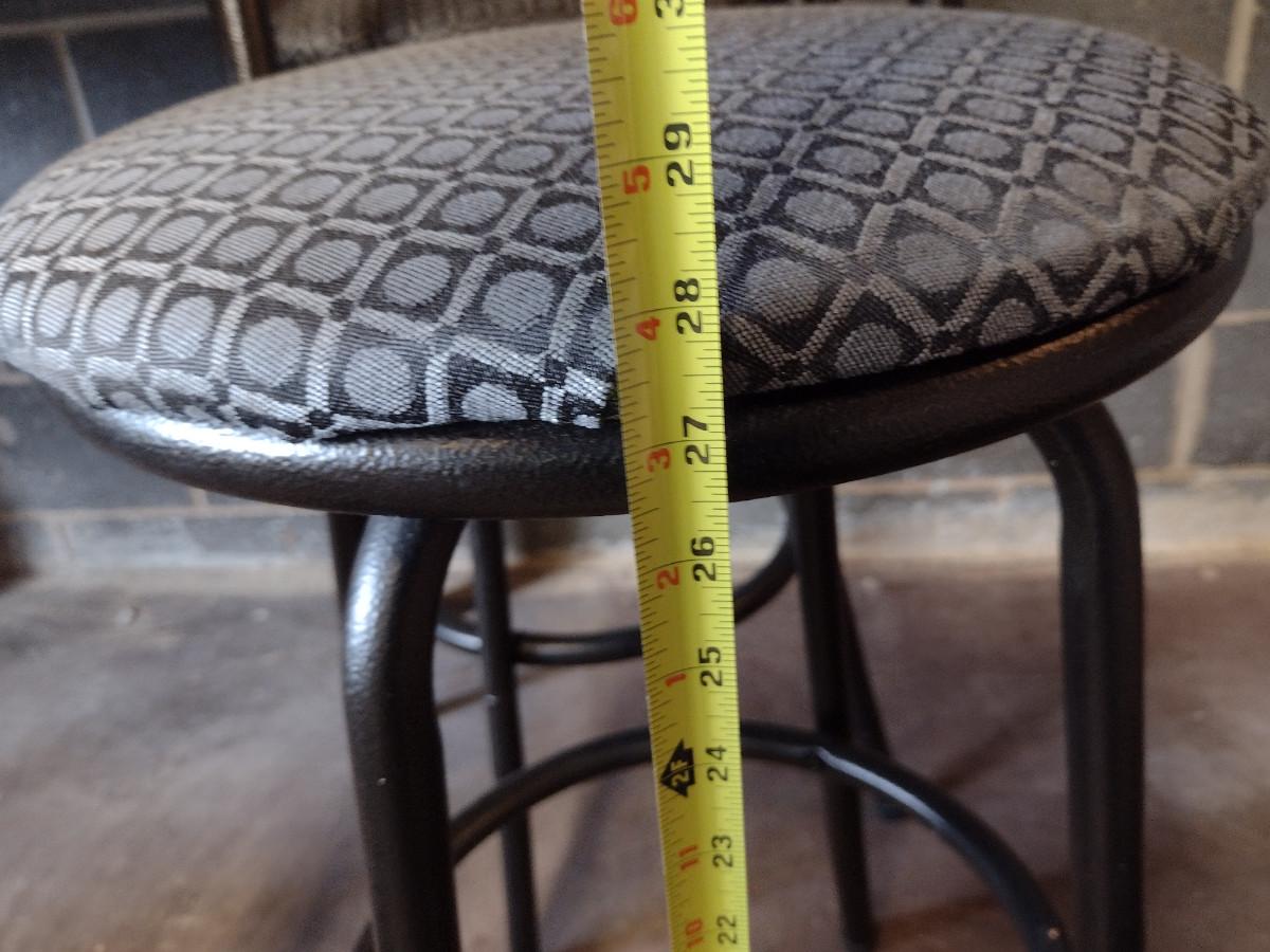 Three Swiveling Bar Stools with Upholstered Seats. Seats are 15 inches wide, 28" tall.