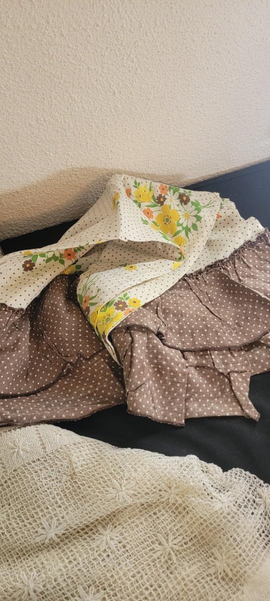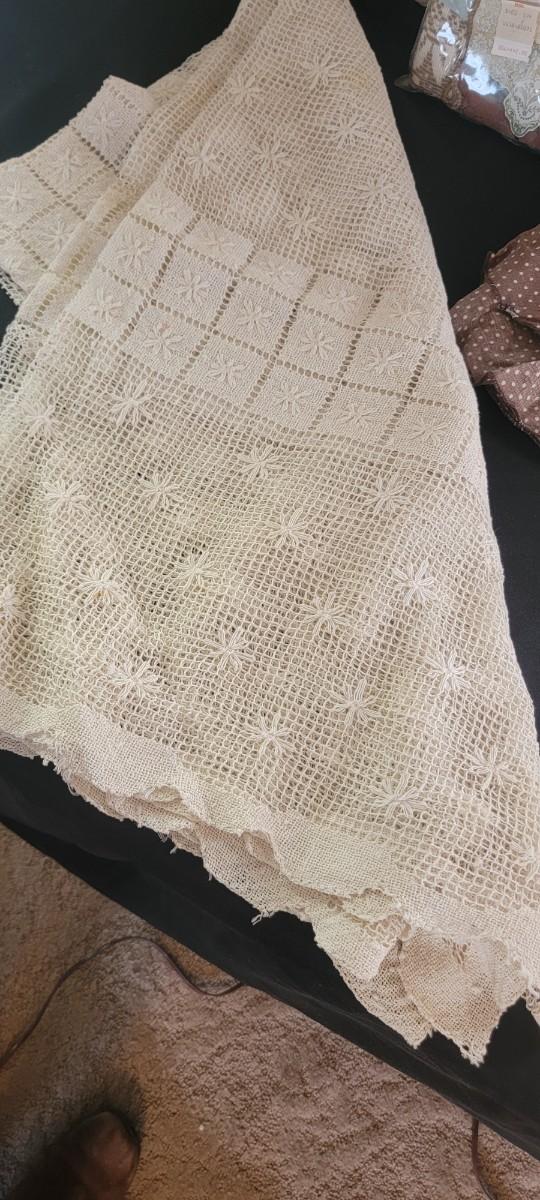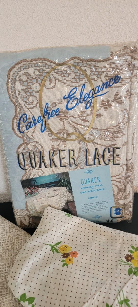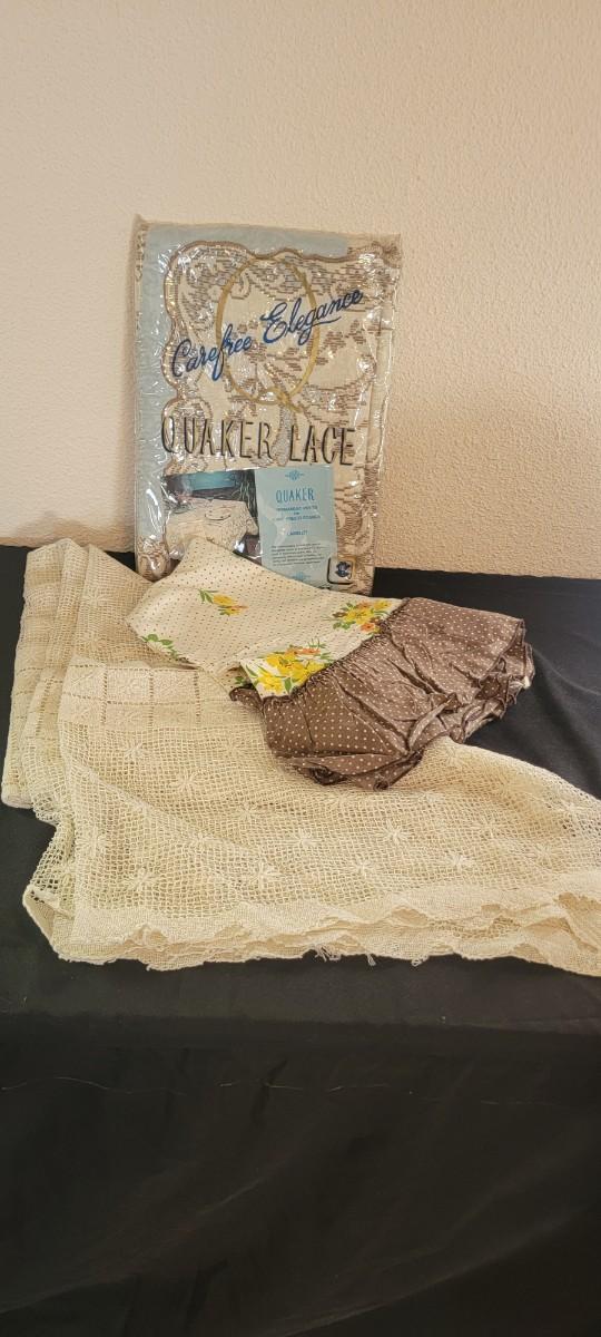 Quaker Lace Camelot 68 x 90, plus polka dot ruffled round, and lace table clothes