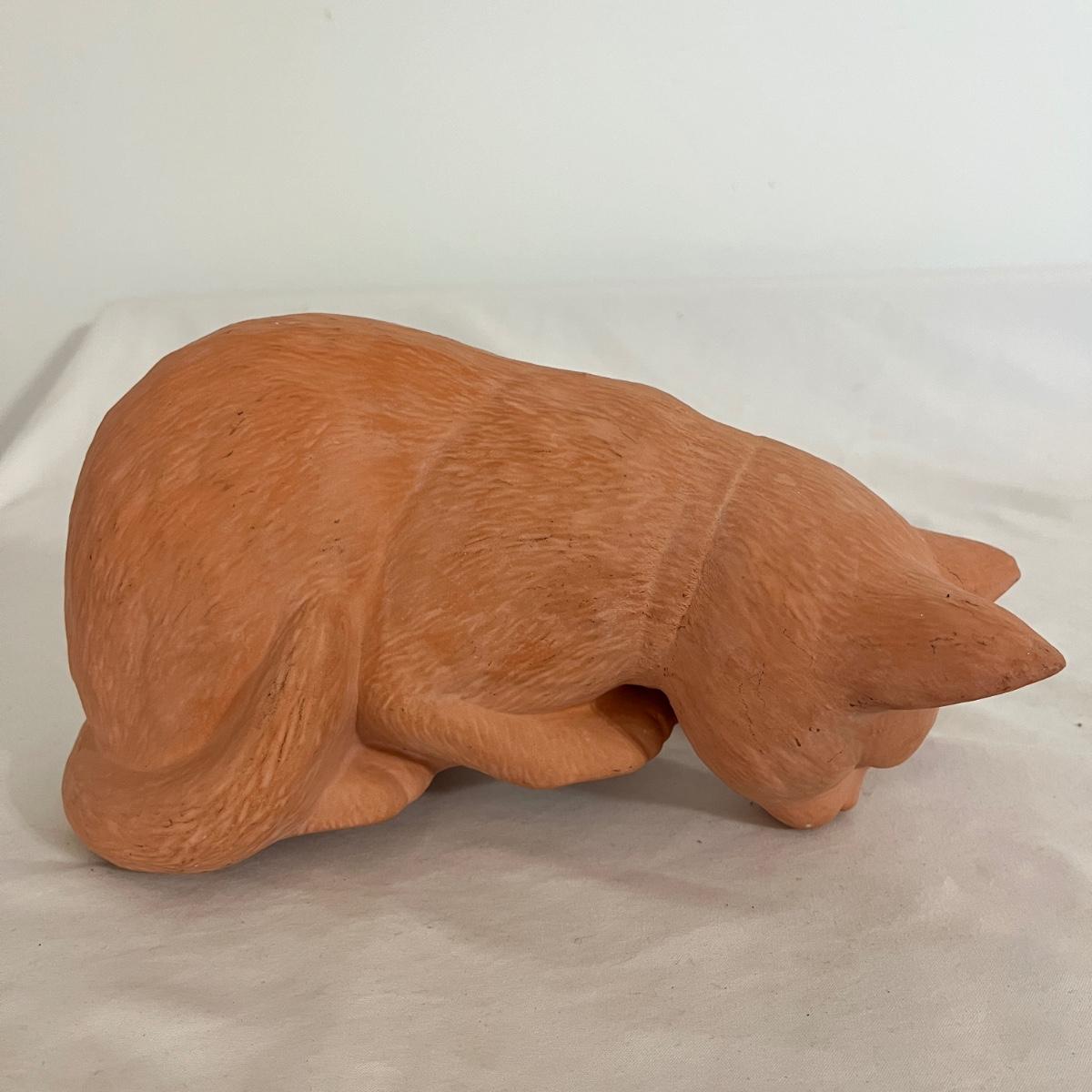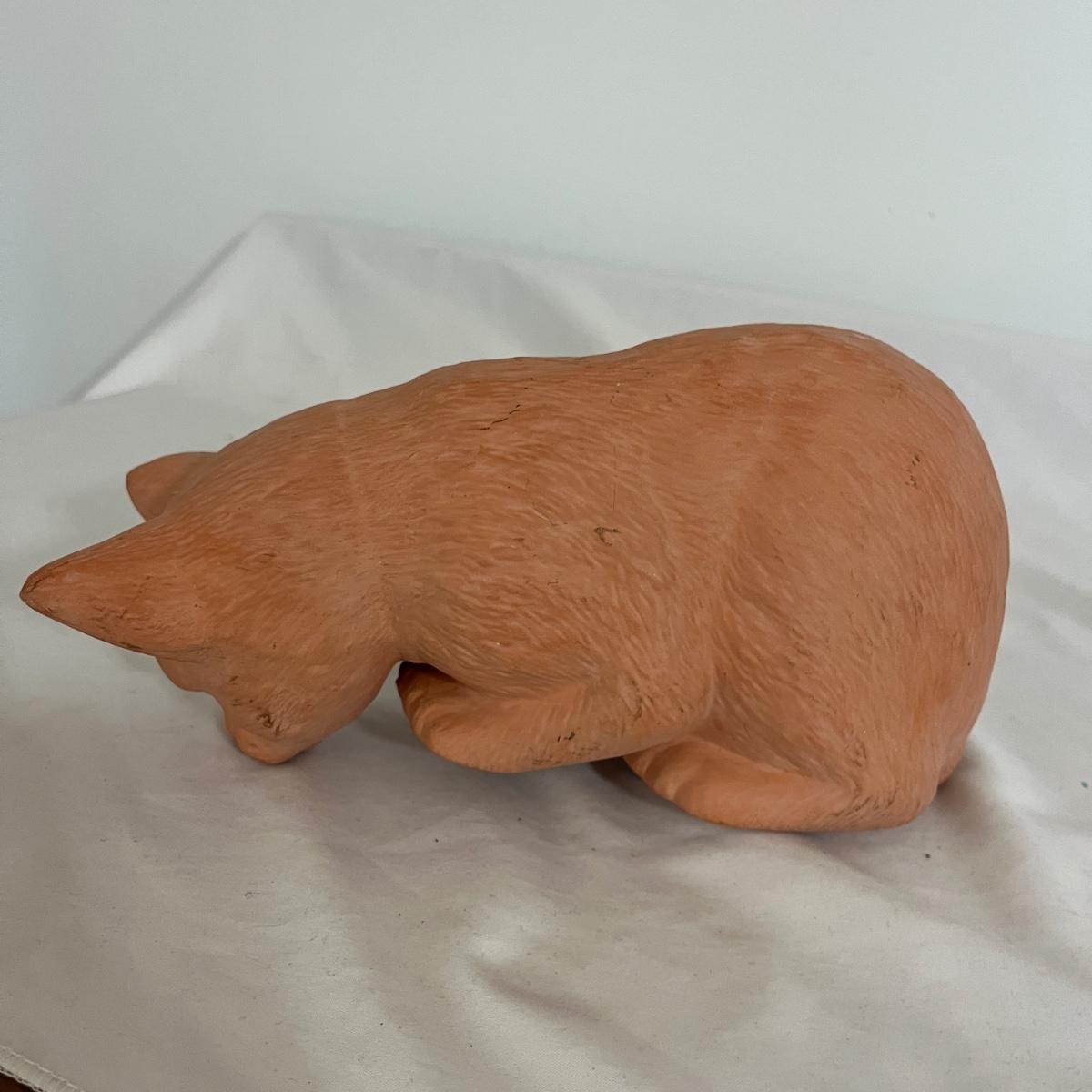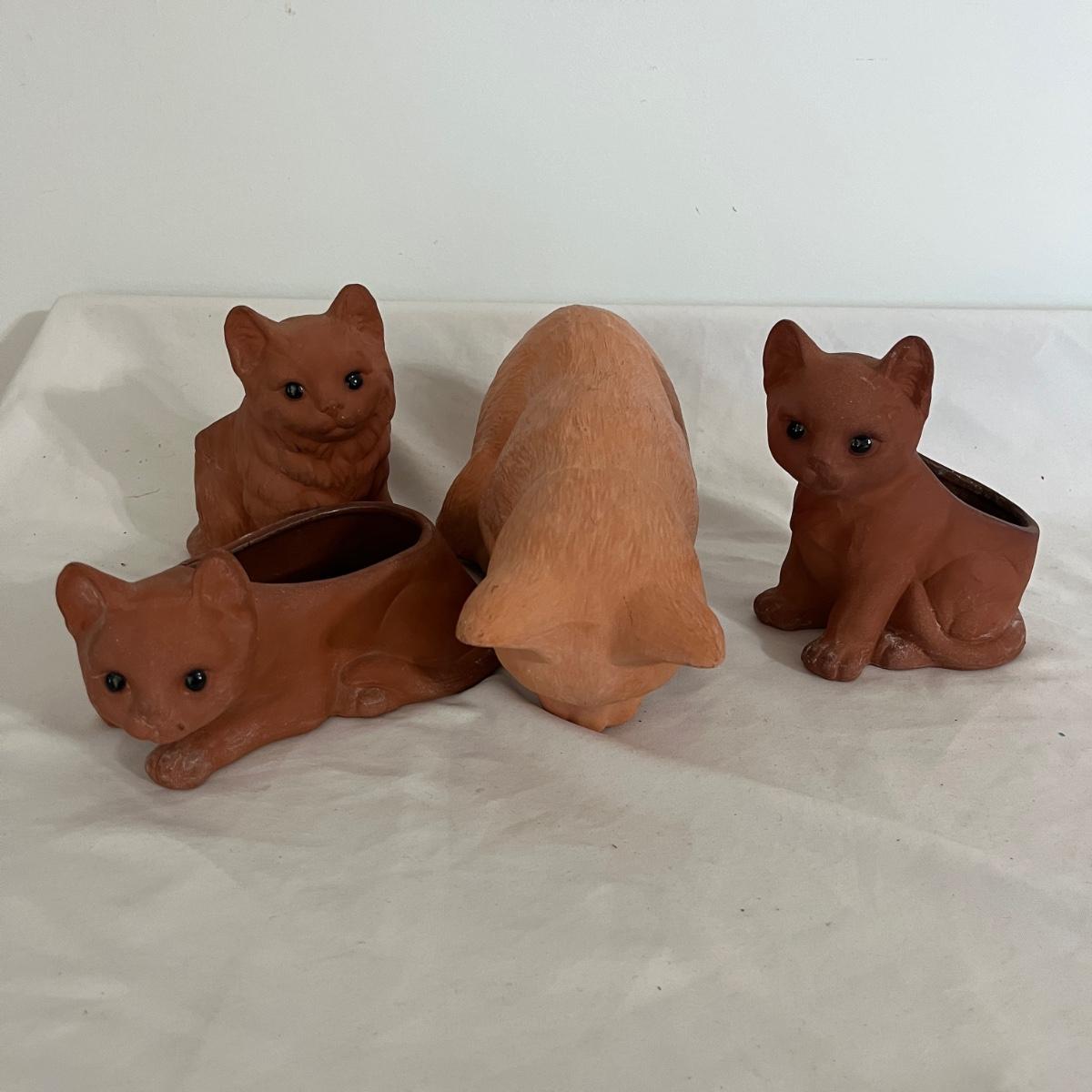 Lot includes three Takahashi ceramic cat planters and an unmarked ceramic cat figurine. Largest cat measures 5” x 10” x 5”H.