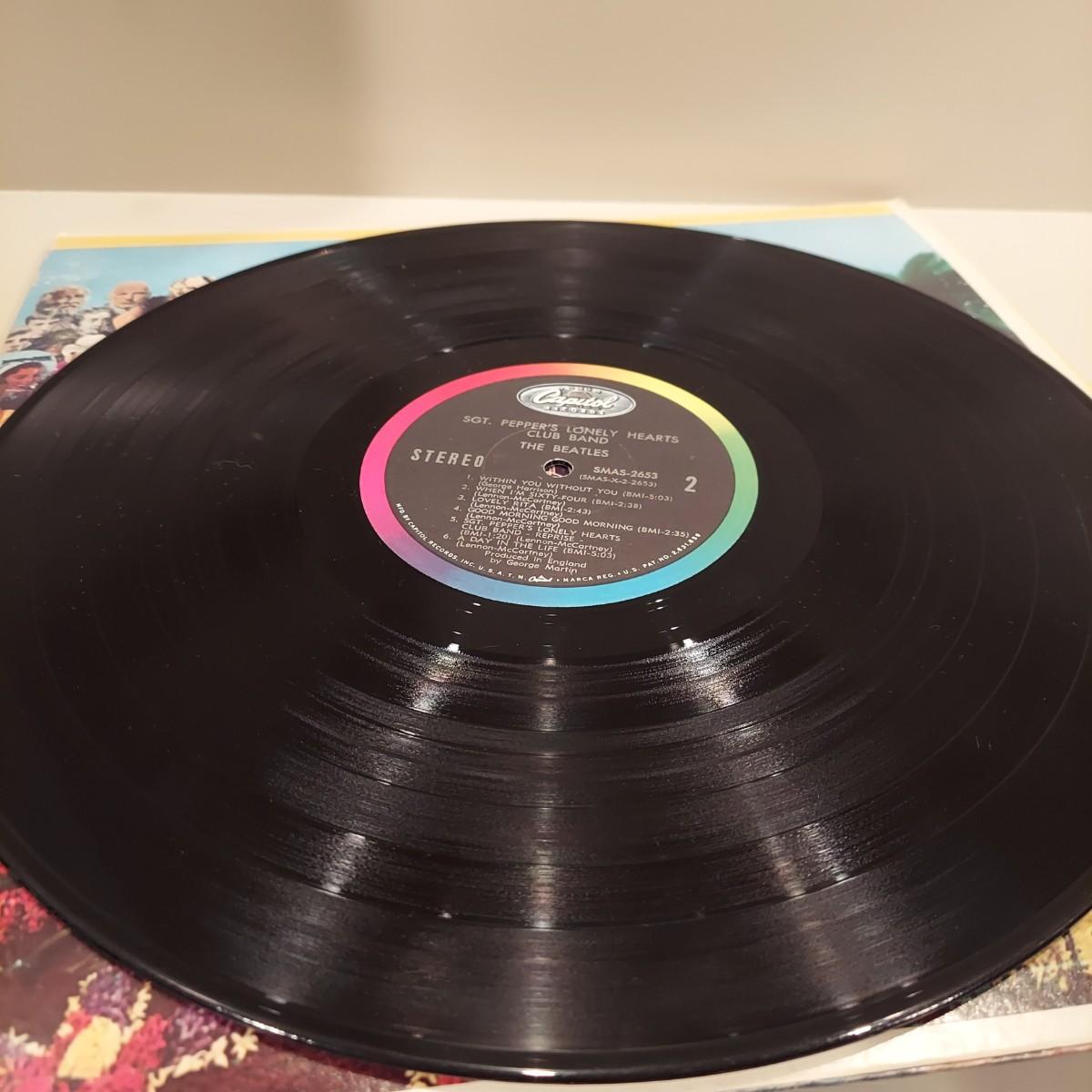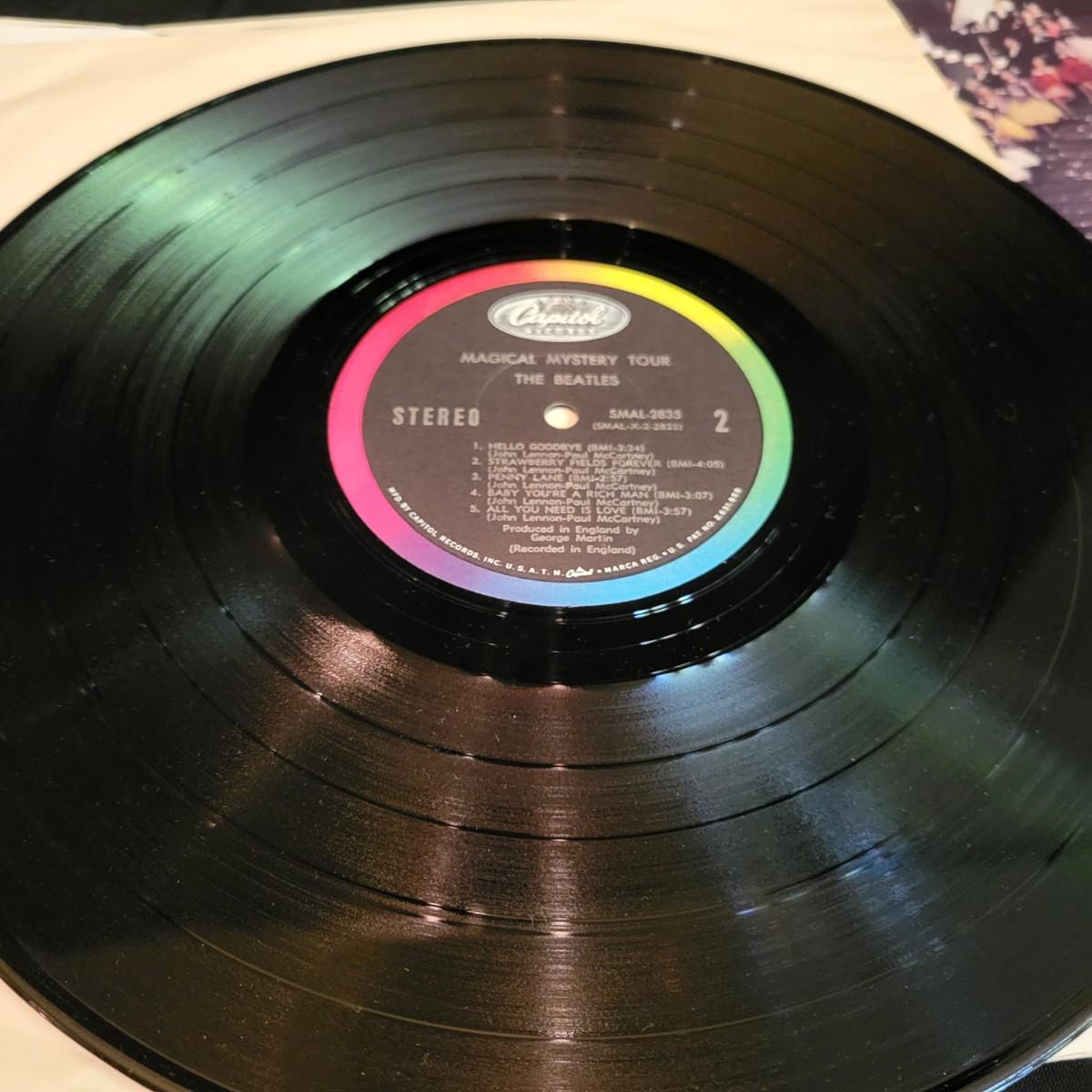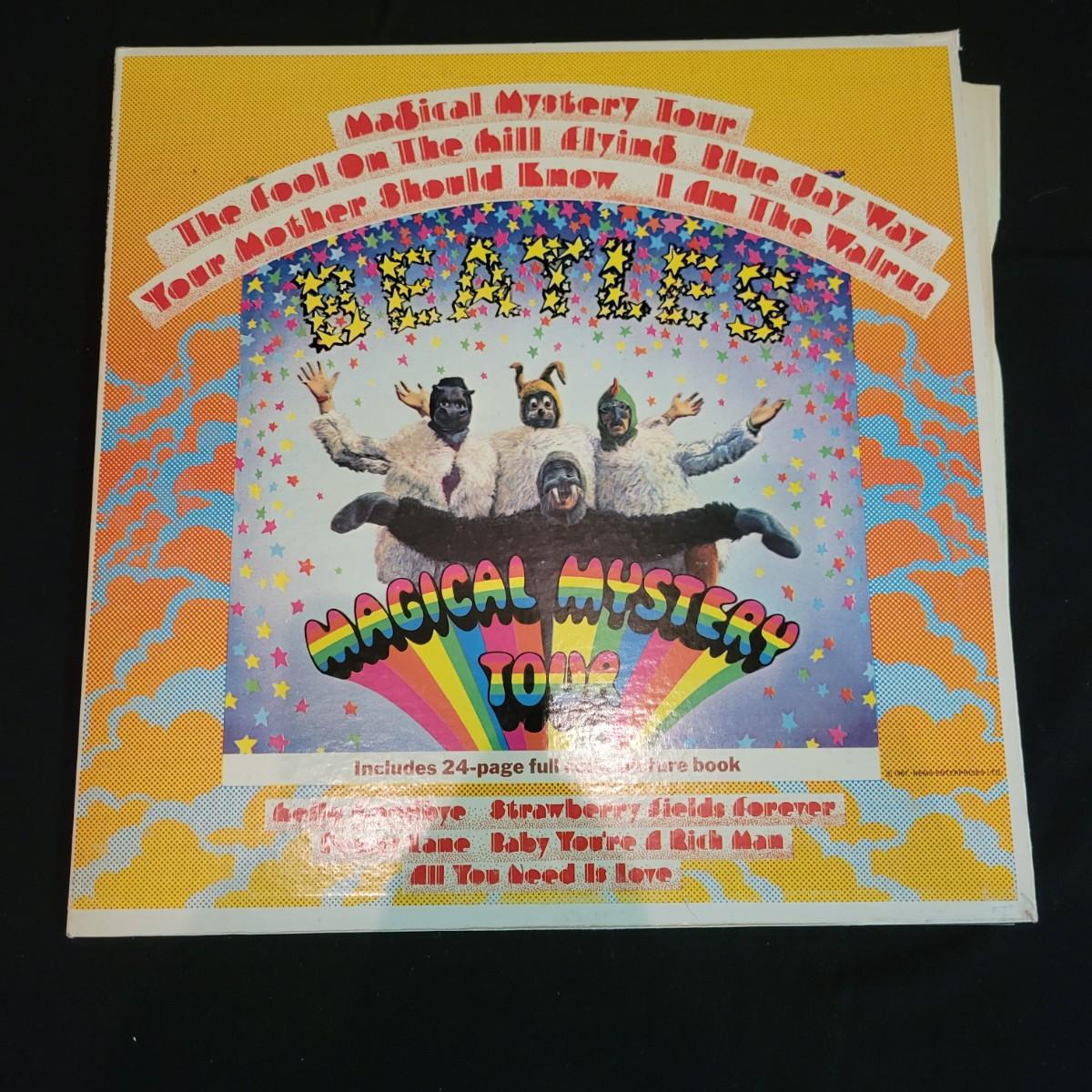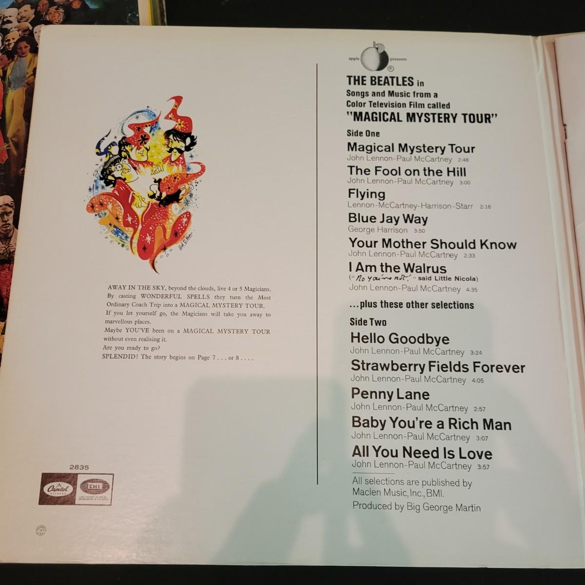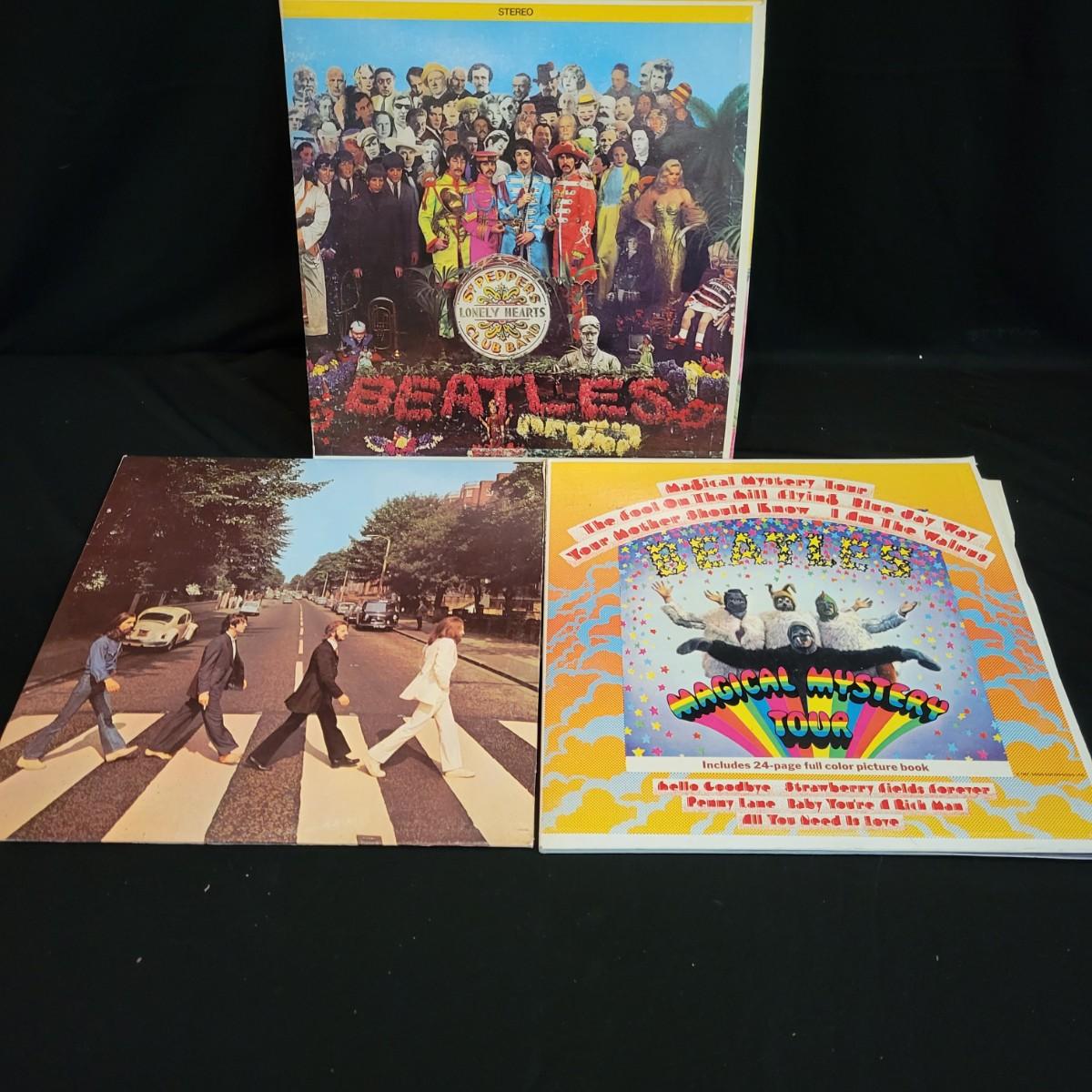A collection of three albums by The Beatles. Included are copies of Abbey Road, Sgt. Peppers Lonely Heart's Club Band, and Magical Mystery Tour. The vinyl appears to be scratch free. Shipping available