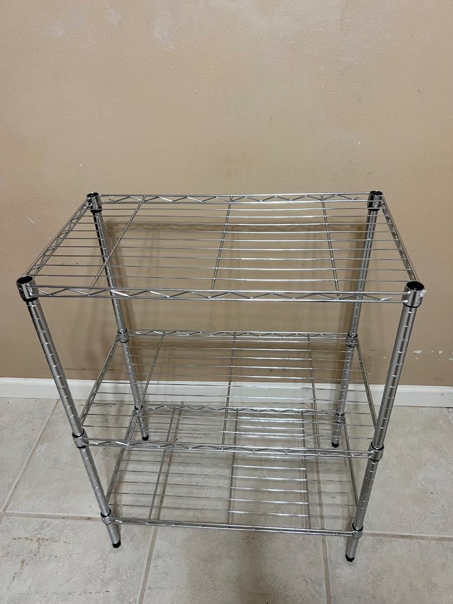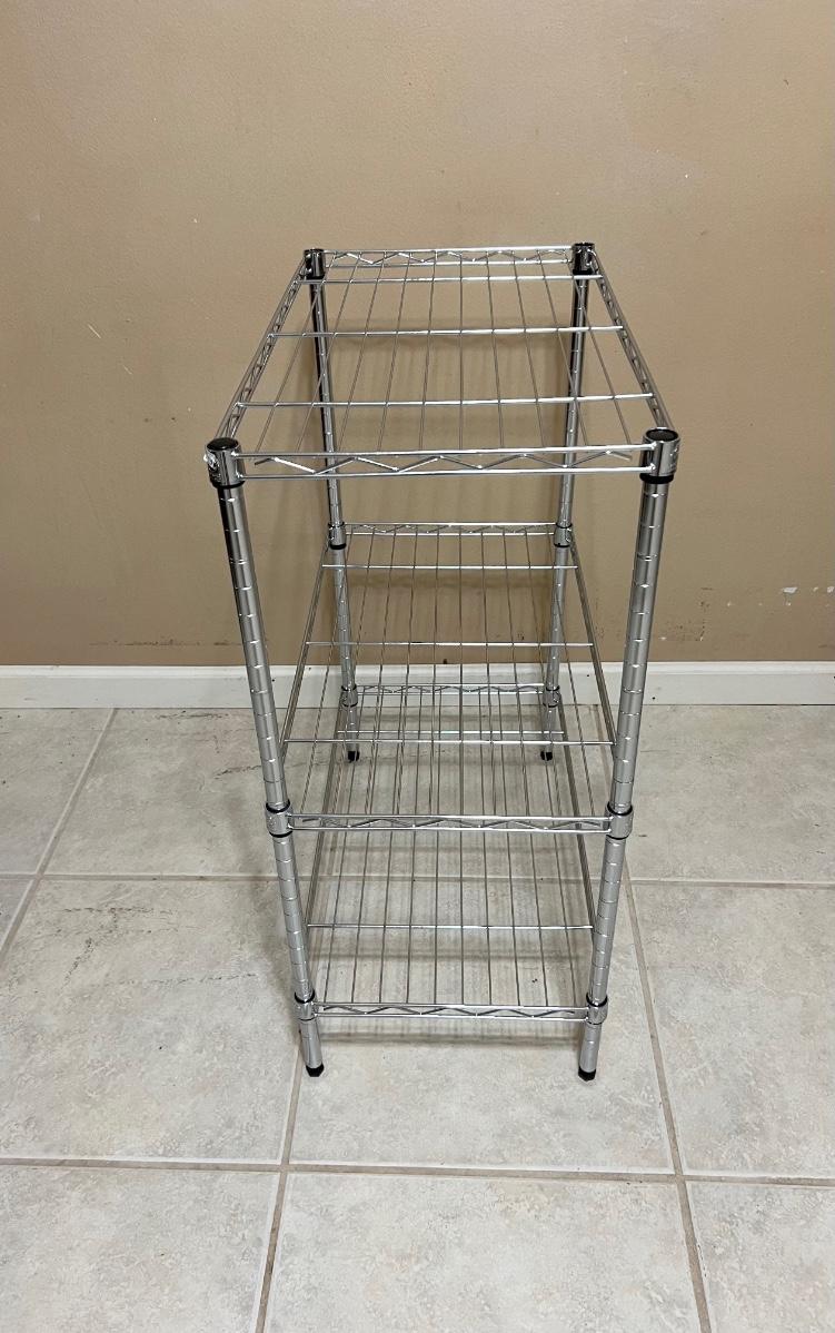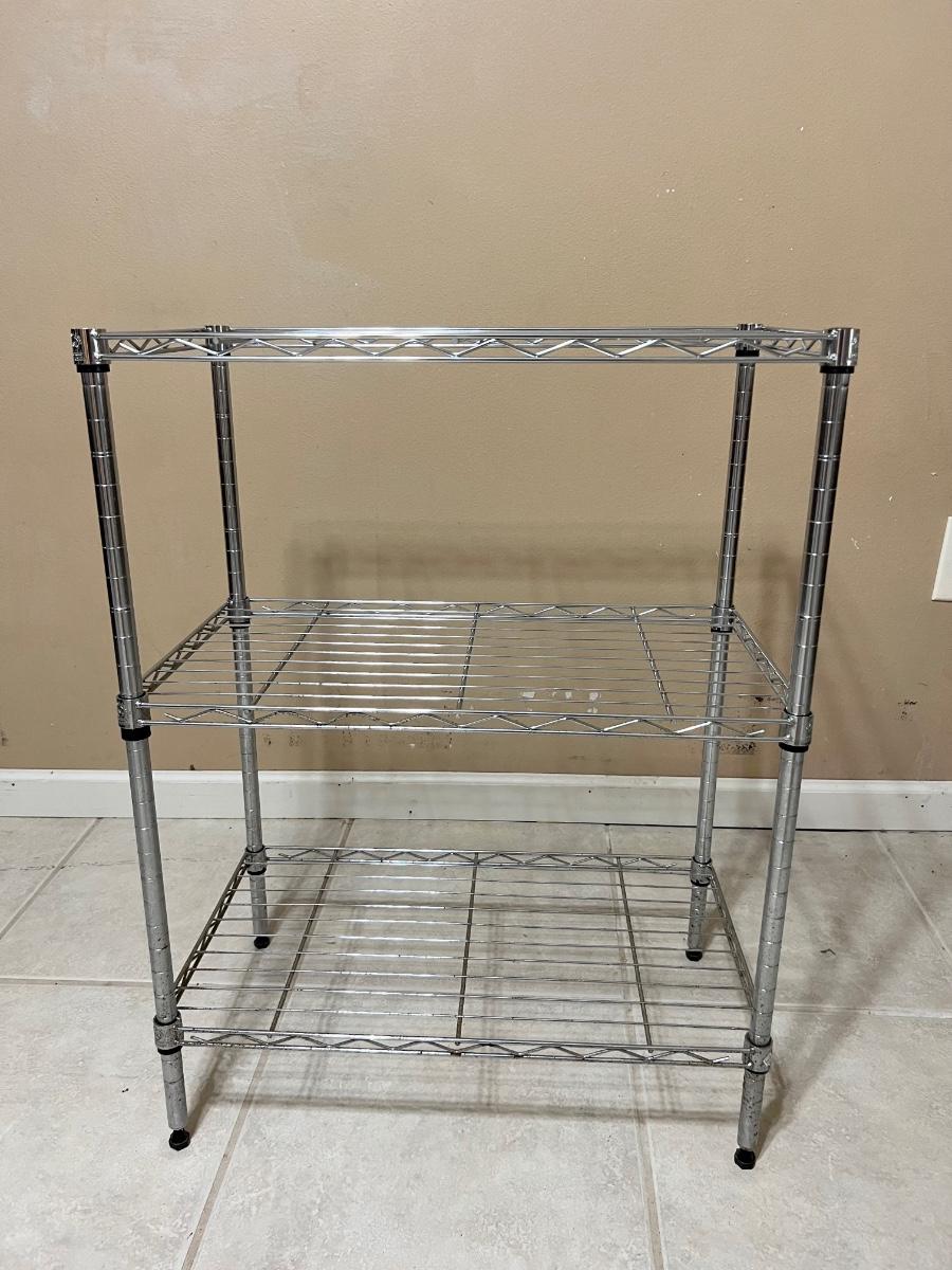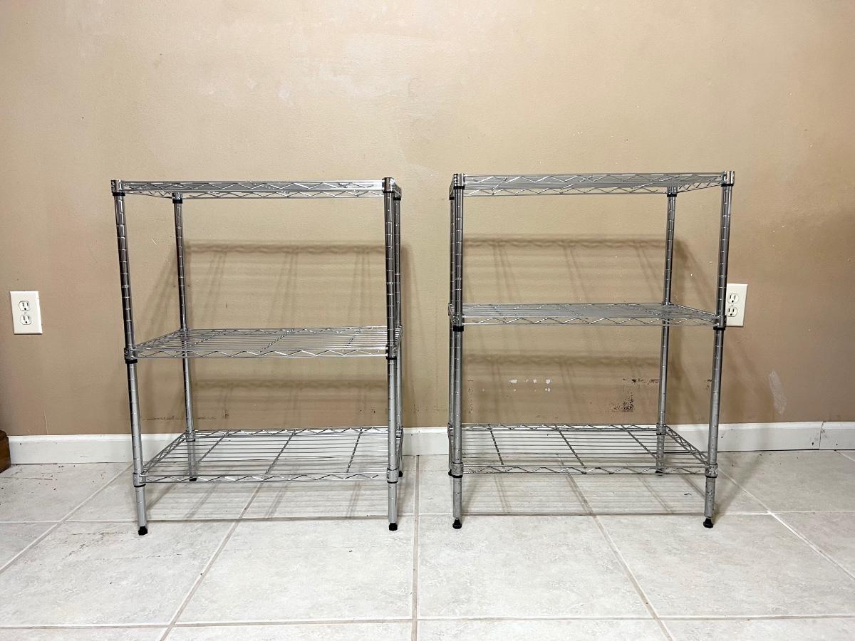 Pair of chrome colored three tier shelving units, measure 31 inches tall, 23 inches wide and 13 1/2 inches deep. Some minor surface rust noted on one.