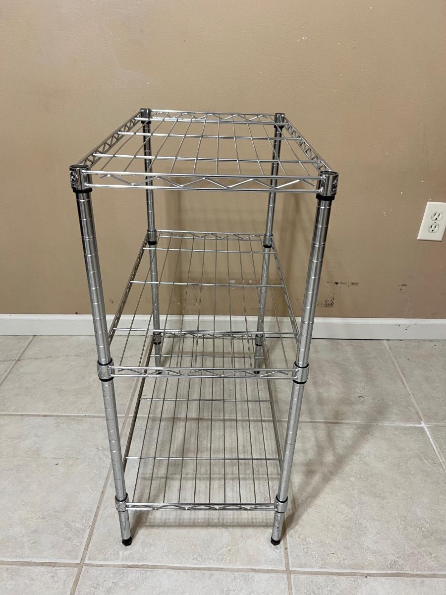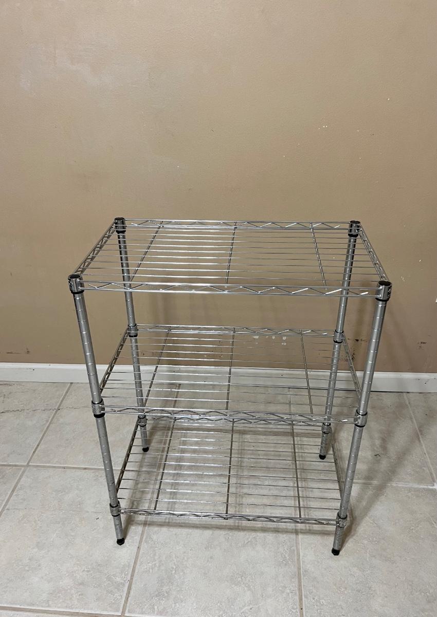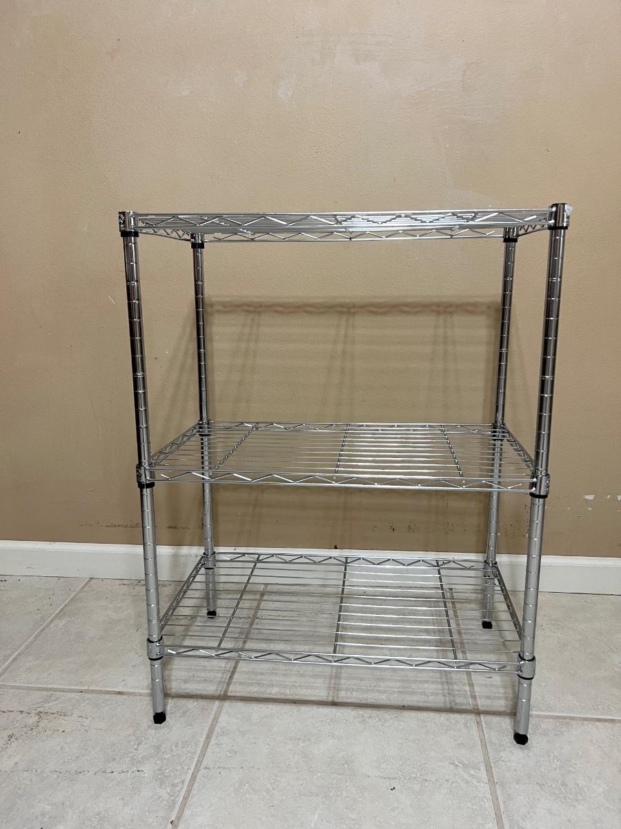Pair of chrome colored three tier shelving units, measure 31 inches tall, 23 inches wide and 13 1/2 inches deep. Some minor surface rust noted on one.