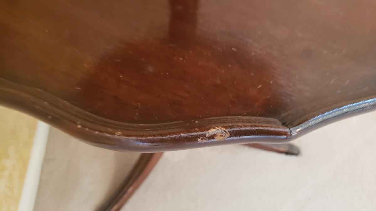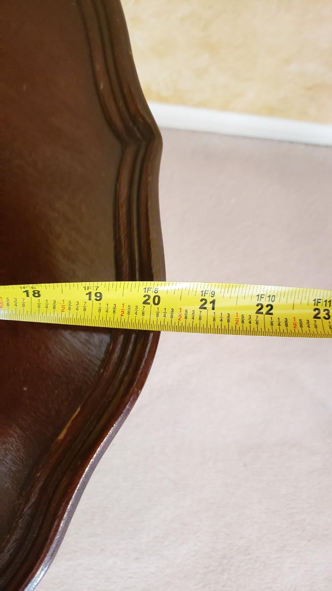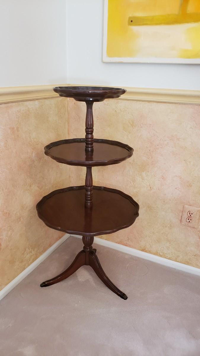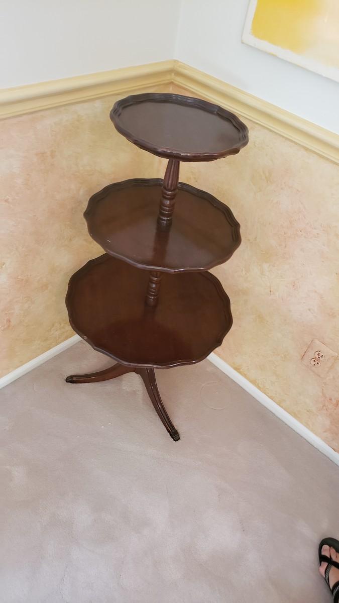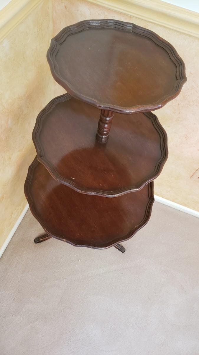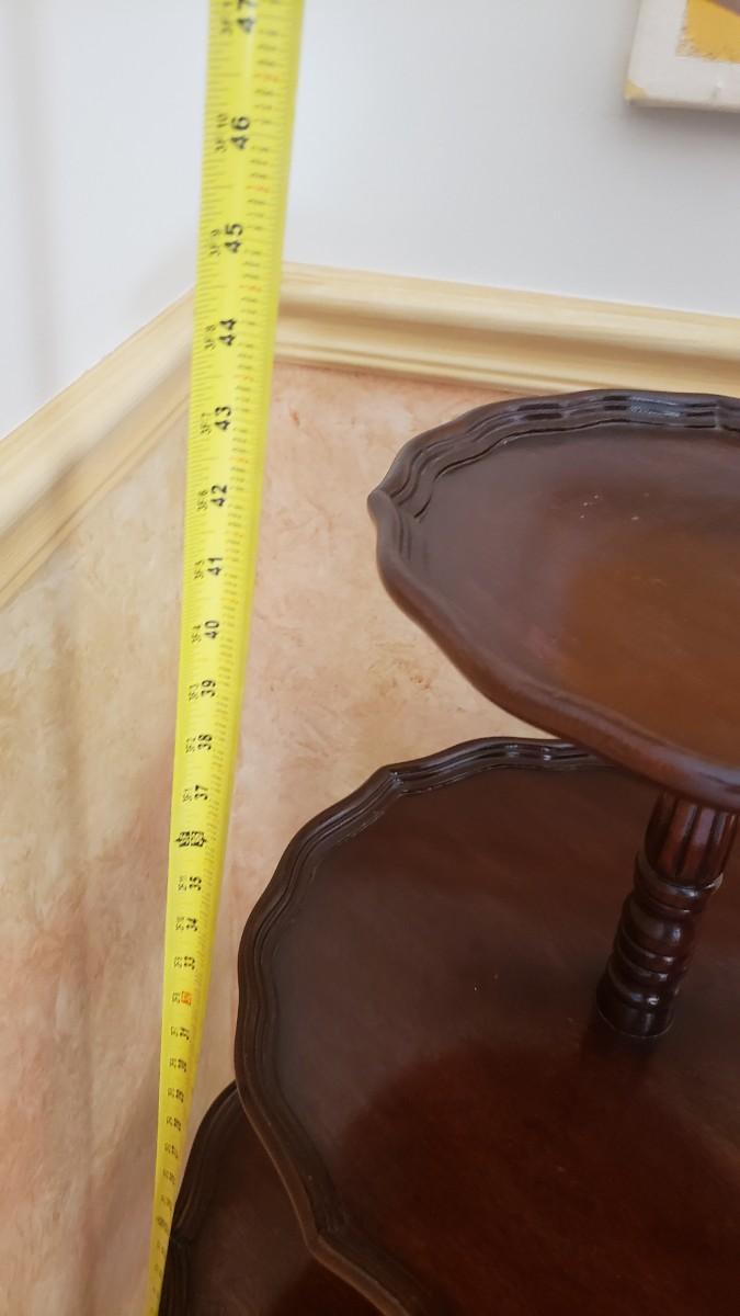 Three tiered table with brass feet 43 in tall by 20 in diameter