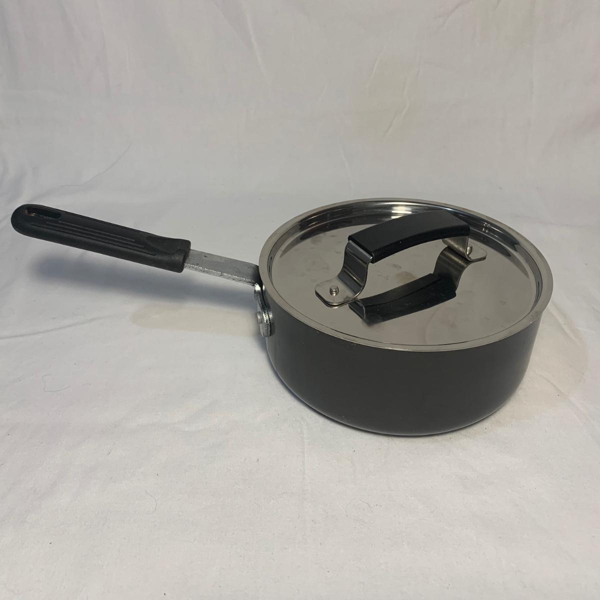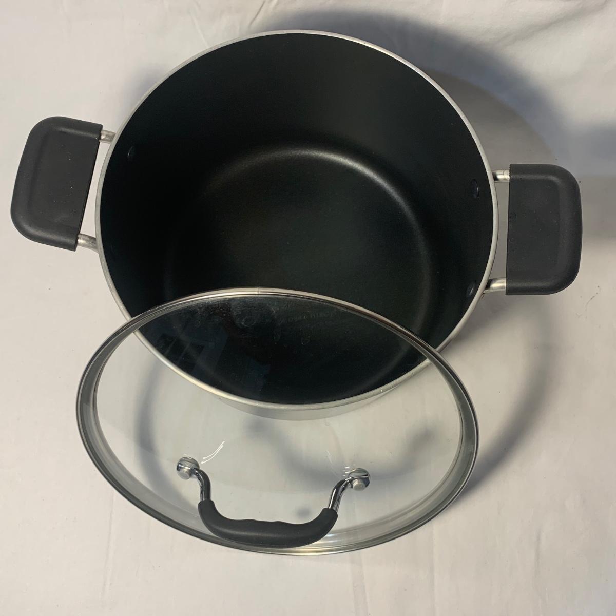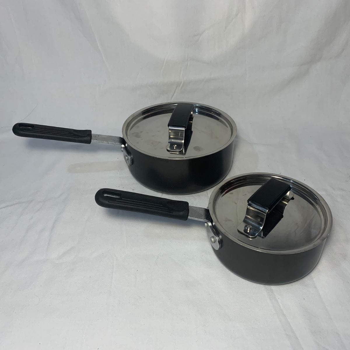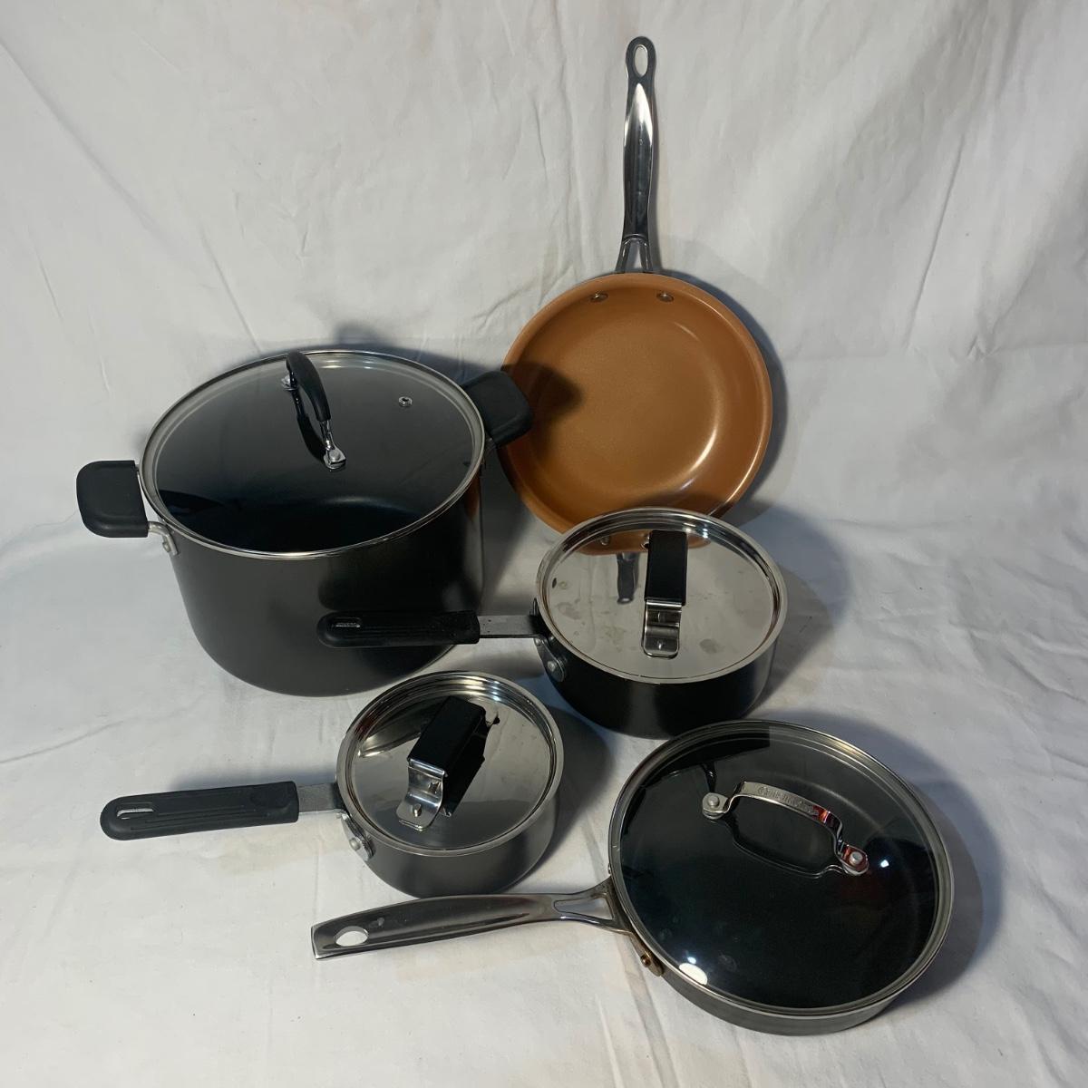 This lot includes three Titan Ware pots. One large soup pot with lid and two smaller lidded sauce pots. Lot also includes Cuisinart and Gotham Steel frying pans. Gotham Steel pan does not include a lid. All items are non-stick. See photos for more details.